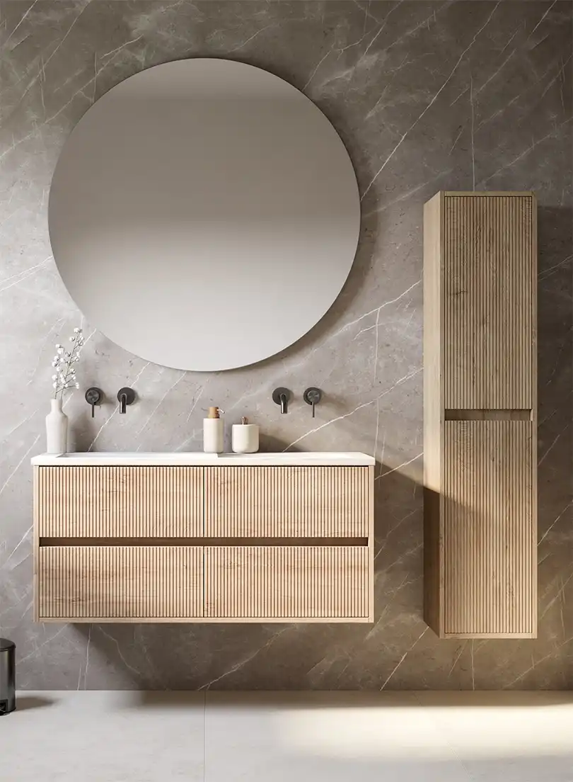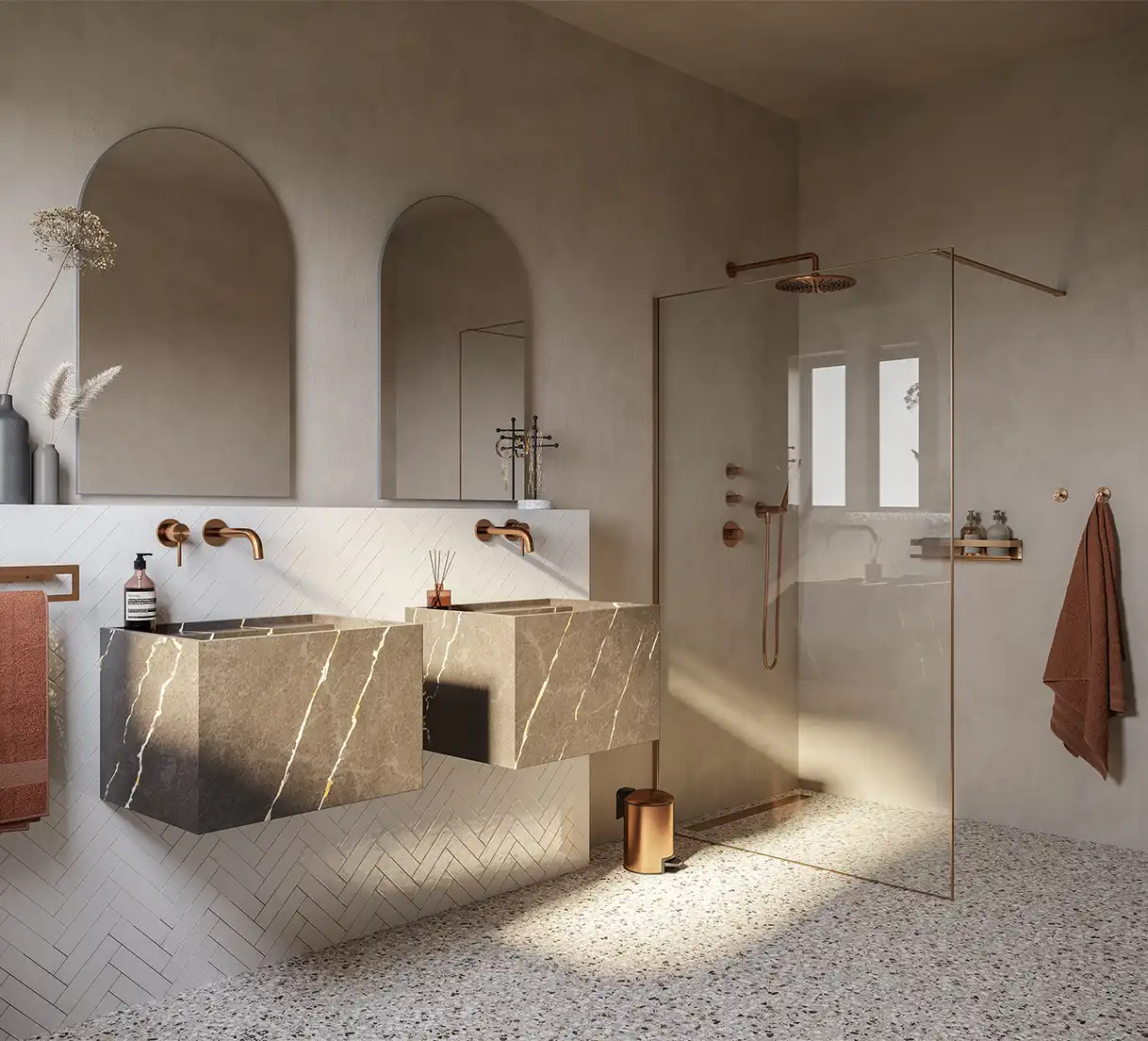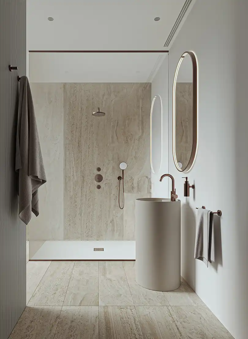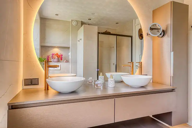 Na jaren van strak zwart en minimalistisch design, verschuift het interieurbeeld naar zachter en warmer. “De Japandi-stijl (een mix van Japans vakmanschap en Scandinavische rust) blijft enorm populair”, vertelt Daniëlle. “Maar waar het eerst vooral koel en minimalistisch was, wordt het nu warmer en natuurlijker. Denk aan zandtinten, beige, linnen, crèmekleur en zachte contrasten. We combineren dat met brons en hout voor een rustig, maar rijk gevoel.”