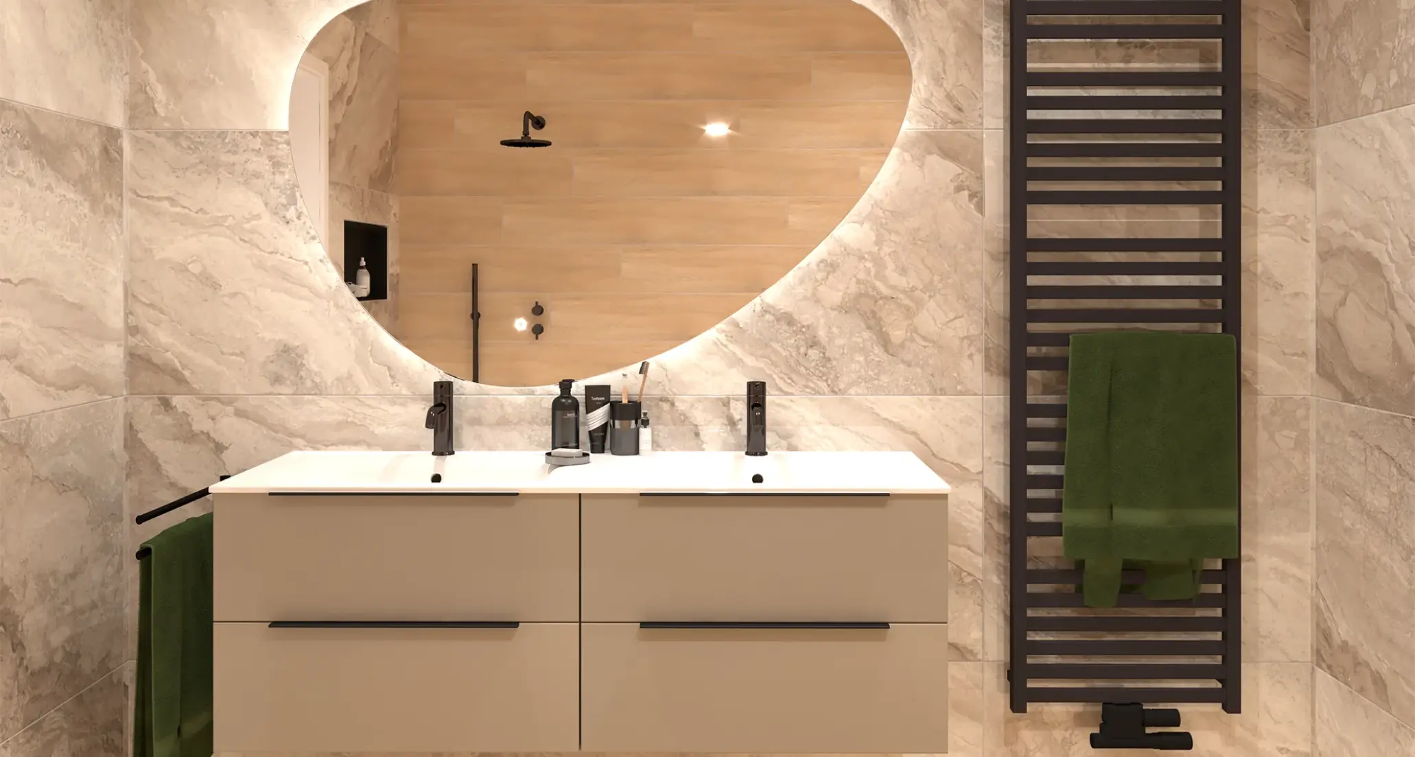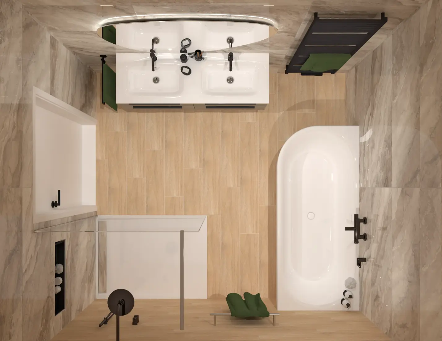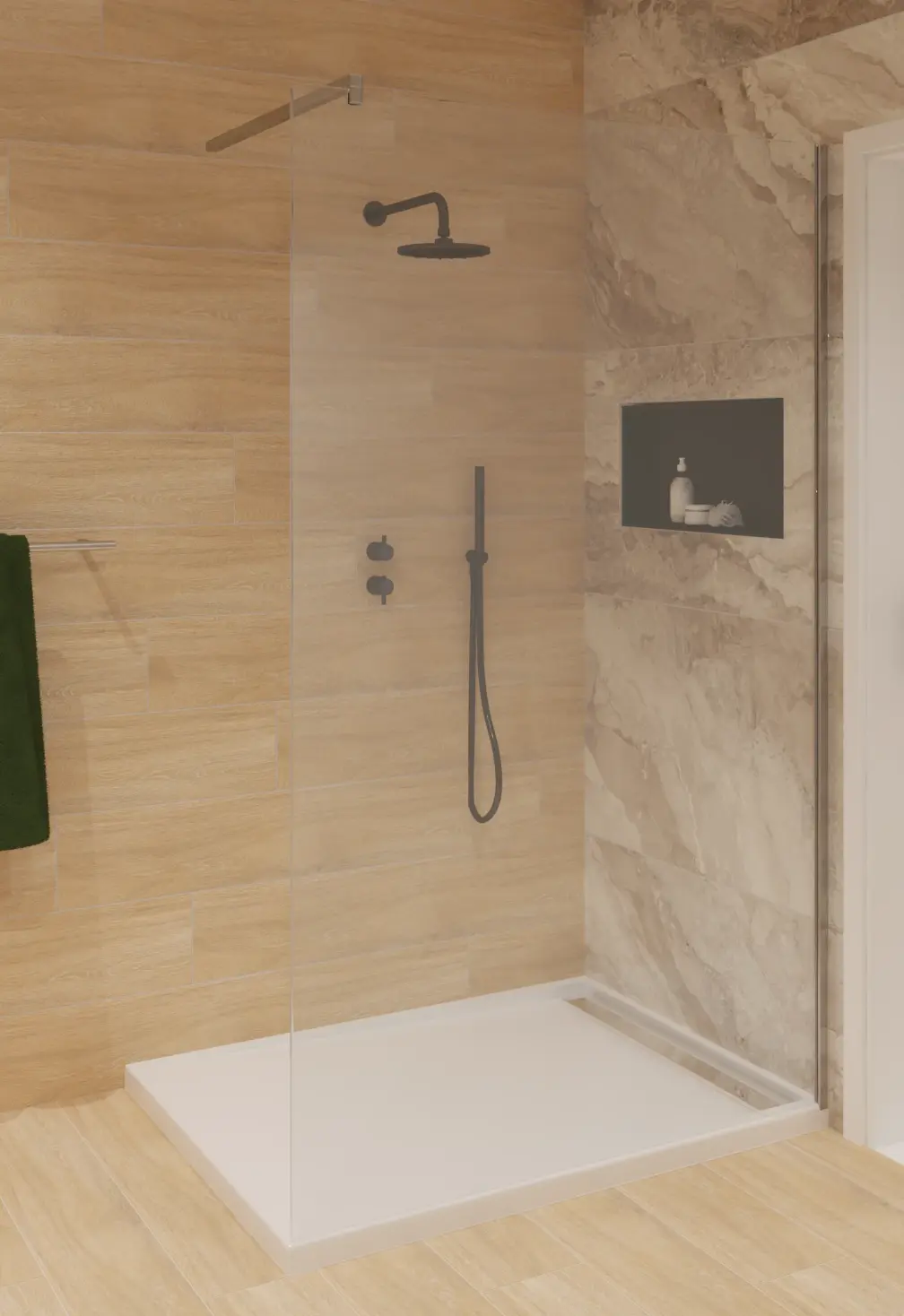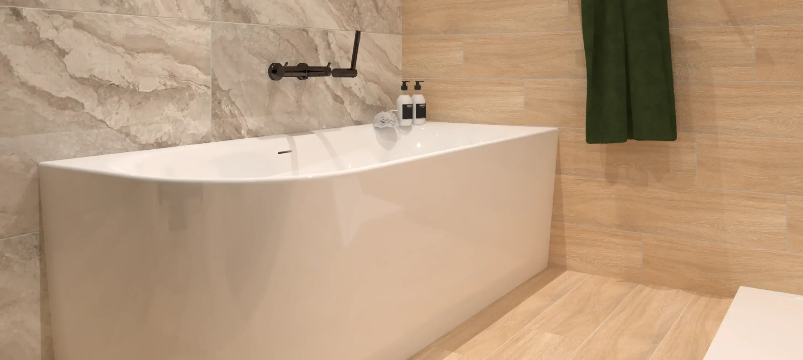 Welkom in de weelde van onze Crema badkamer, geïnspireerd door het Italiaanse crèmekleurige palet en doordrenkt met Scandinavisch design. Geniet van het gemak van ons back-to-wall bad geen gedoe met tegels of inbouwen. De afgeronde hoeken zorgen voor een vlotte doorloop, terwijl helder glas en een kunststof douchebak een ruimtelijk effect creëren. Met een dubbel badkamermeubel, opbergruimte, een designspiegel en stoere gunmetal kranen, is deze Crema-oase jouw ultieme badkamerdroom.