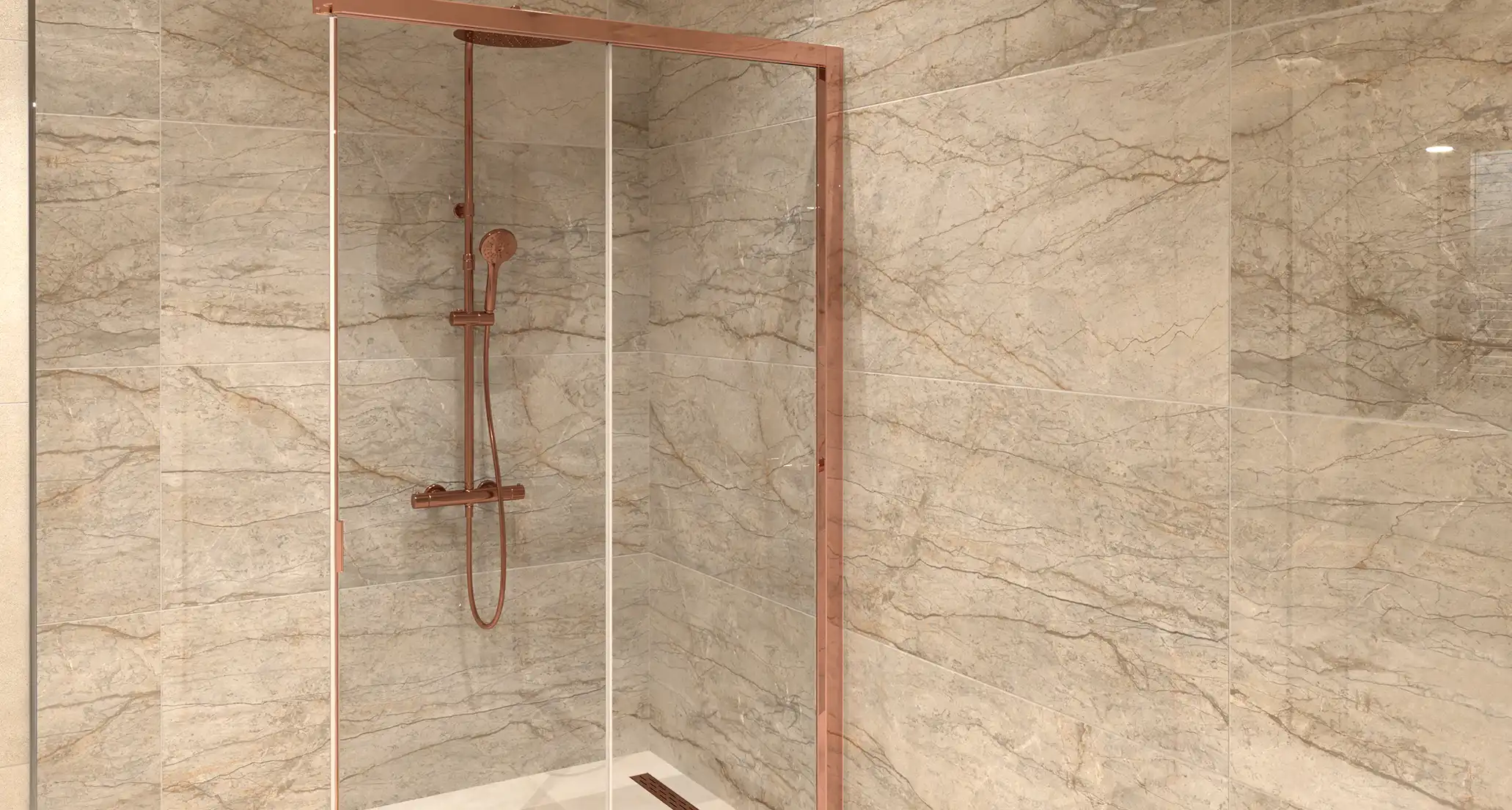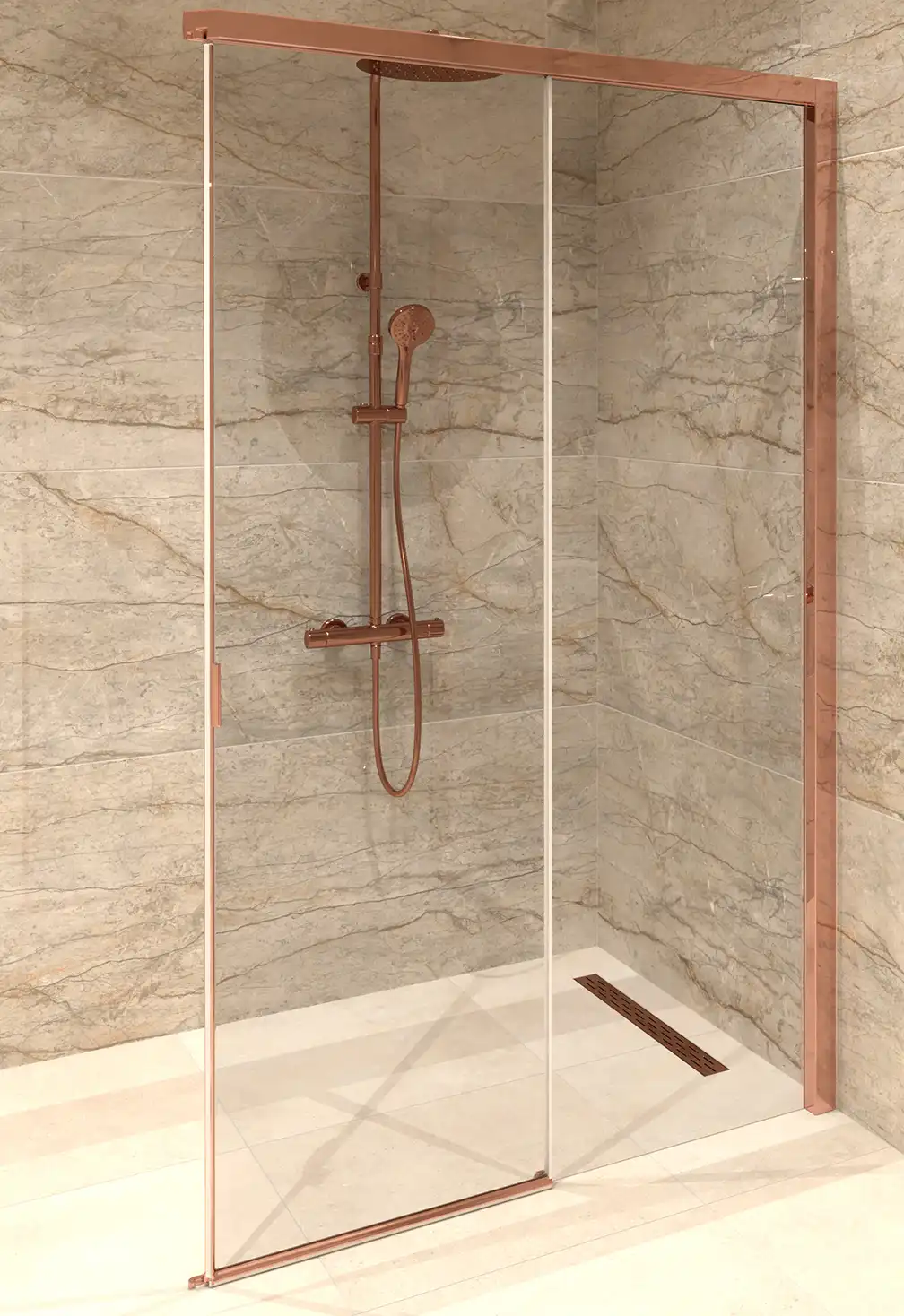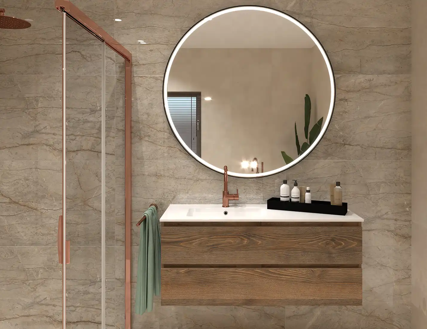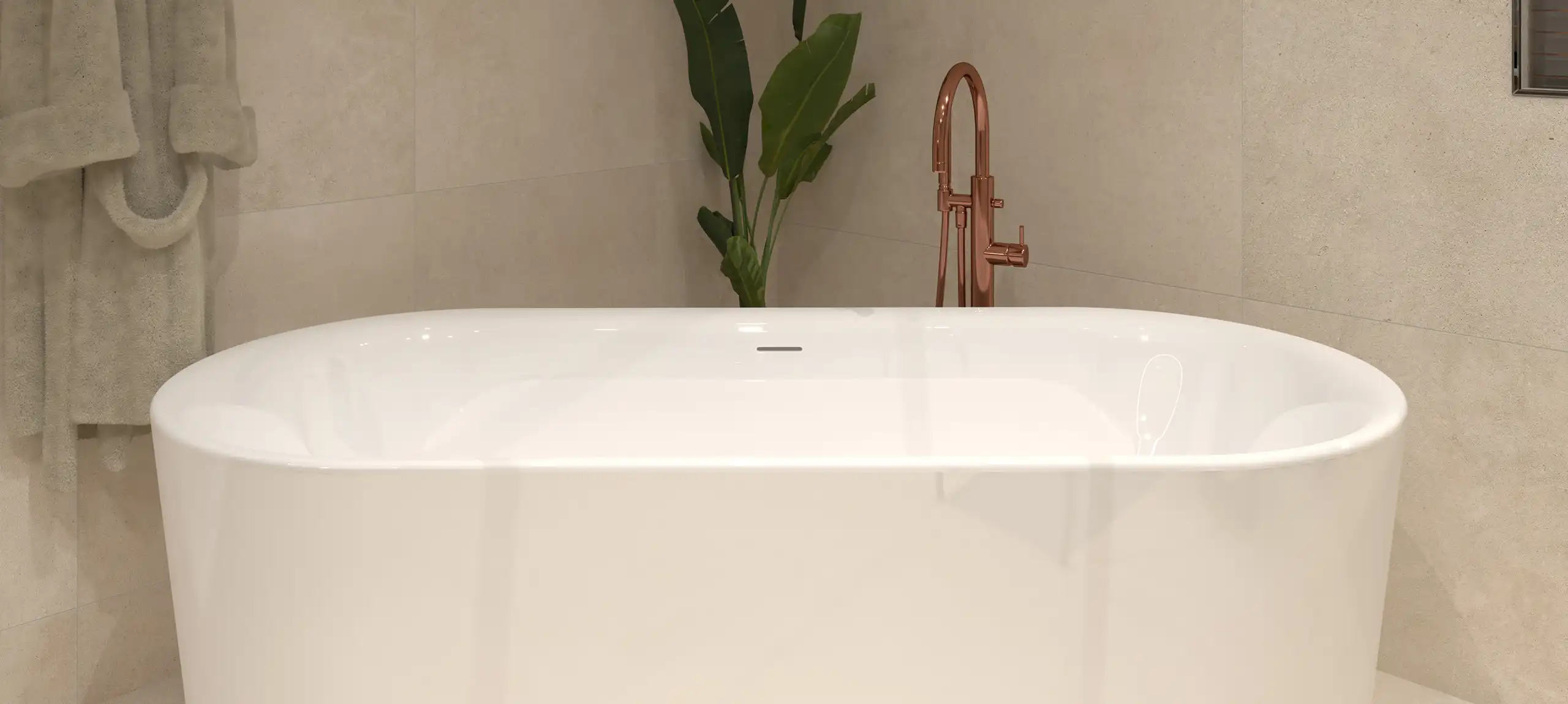 Ontsnap naar de sereniteit van onze badkamer Satori – een perfecte fusie van Scandinavisch design en Japans minimalisme. Relax in ons vrijstaande bad met een prachtige kraan, vrij in de ruimte geplaatst voor ultieme luxe. De koperkleurige kranen stralen warmte uit, terwijl het wandcloset met de dwarsgeplaatste wand zorgt voor privacy. Makkelijke toegang tot de douche dankzij de tweedelige schuifdeur. En alles, van de marmerlook tegels tot het asymmetrische wastafelblad, straalt kwaliteit uit. Satori: waar functionaliteit en schoonheid samenkomen.