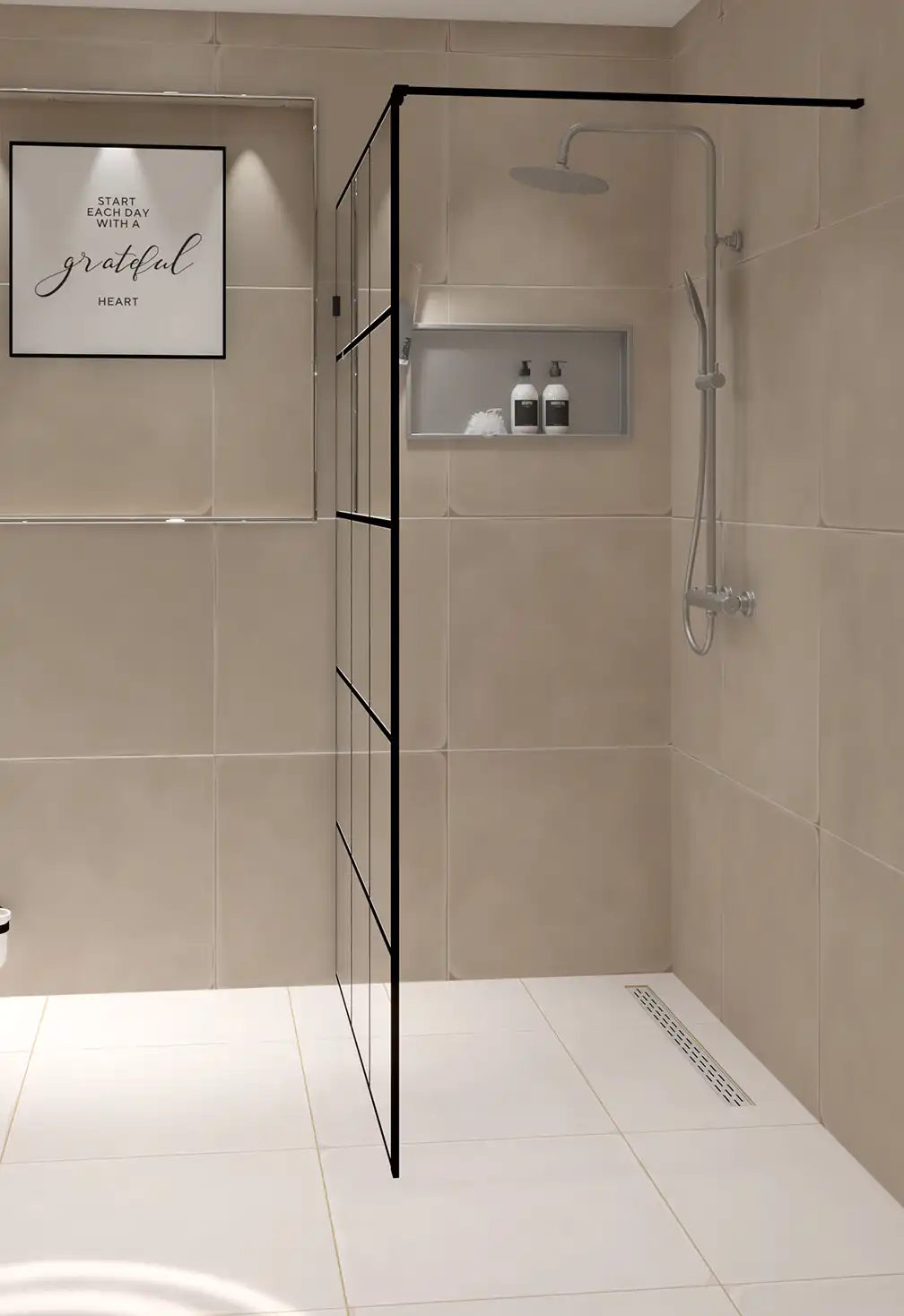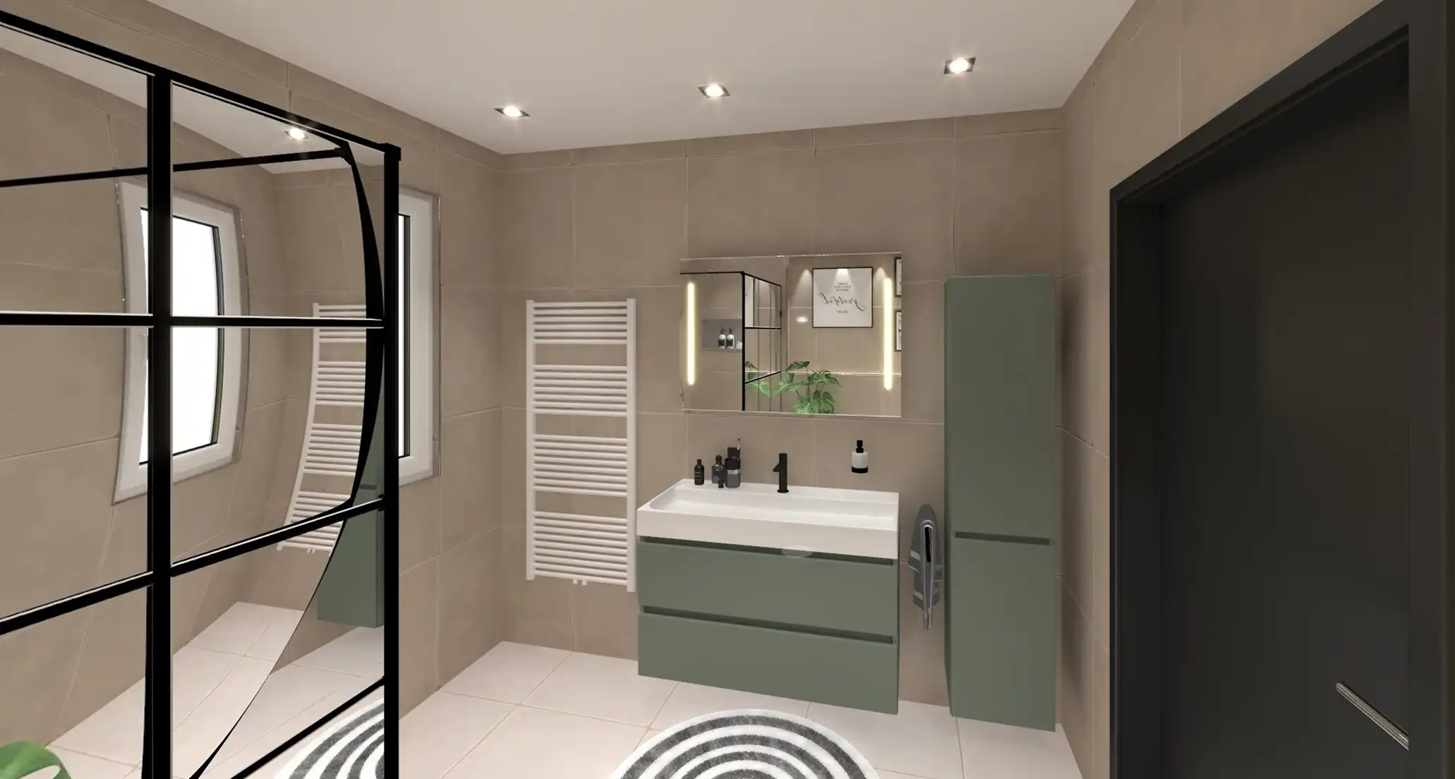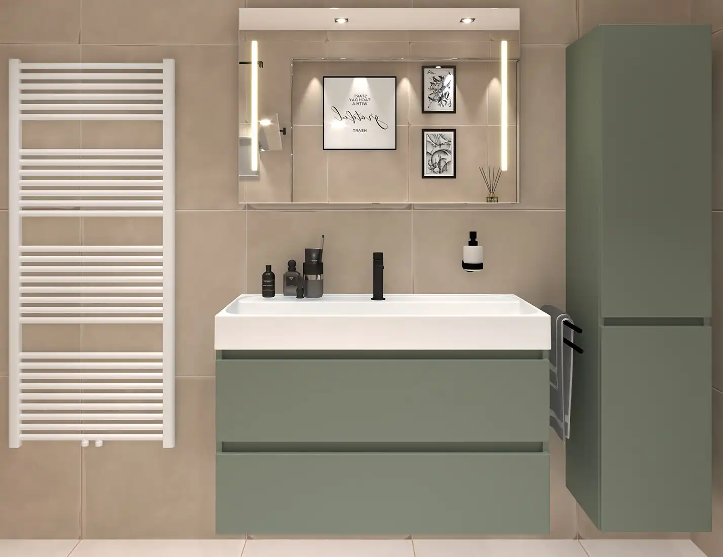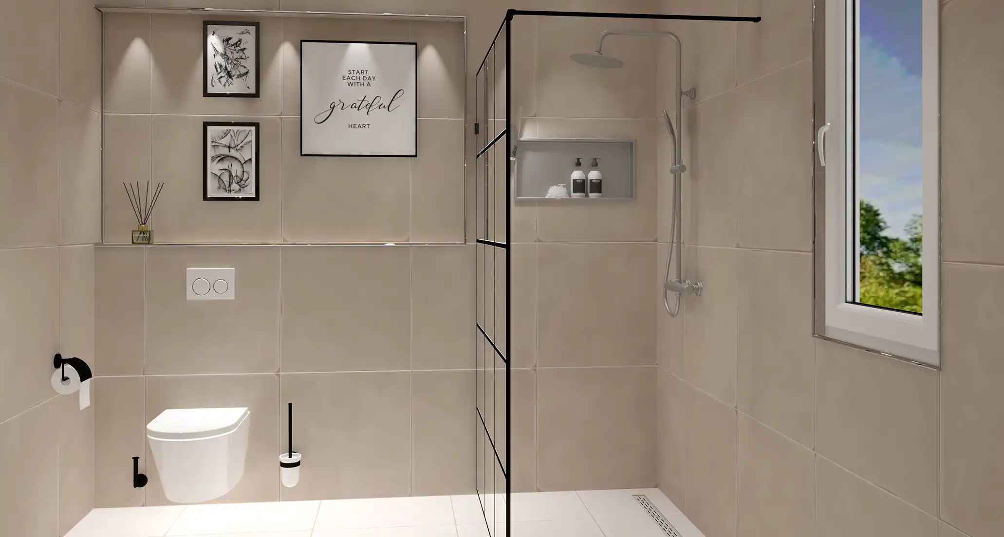 Stap binnen in jouw oase van rust met onze Terra-stijl badkamer. Het Latijnse woord voor aarde komt tot leven in deze moderne, betaalbare badkamer. Geen concessies aan kwaliteit of design, dat is onze belofte. Zwarte kranen en accessoires voegen een vleugje chic toe, terwijl het pastelgroene badkamermeubel de laatste trend omarmt. Geniet van ruimte met een royale wastafel, afzetruimte bij het wandcloset en een onderhoudsvriendelijke douchegoot. De inloop naar de douche is makkelijk en een handige nis houdt je spullen georganiseerd. Terra: waar aards en eigentijds samenkomen.