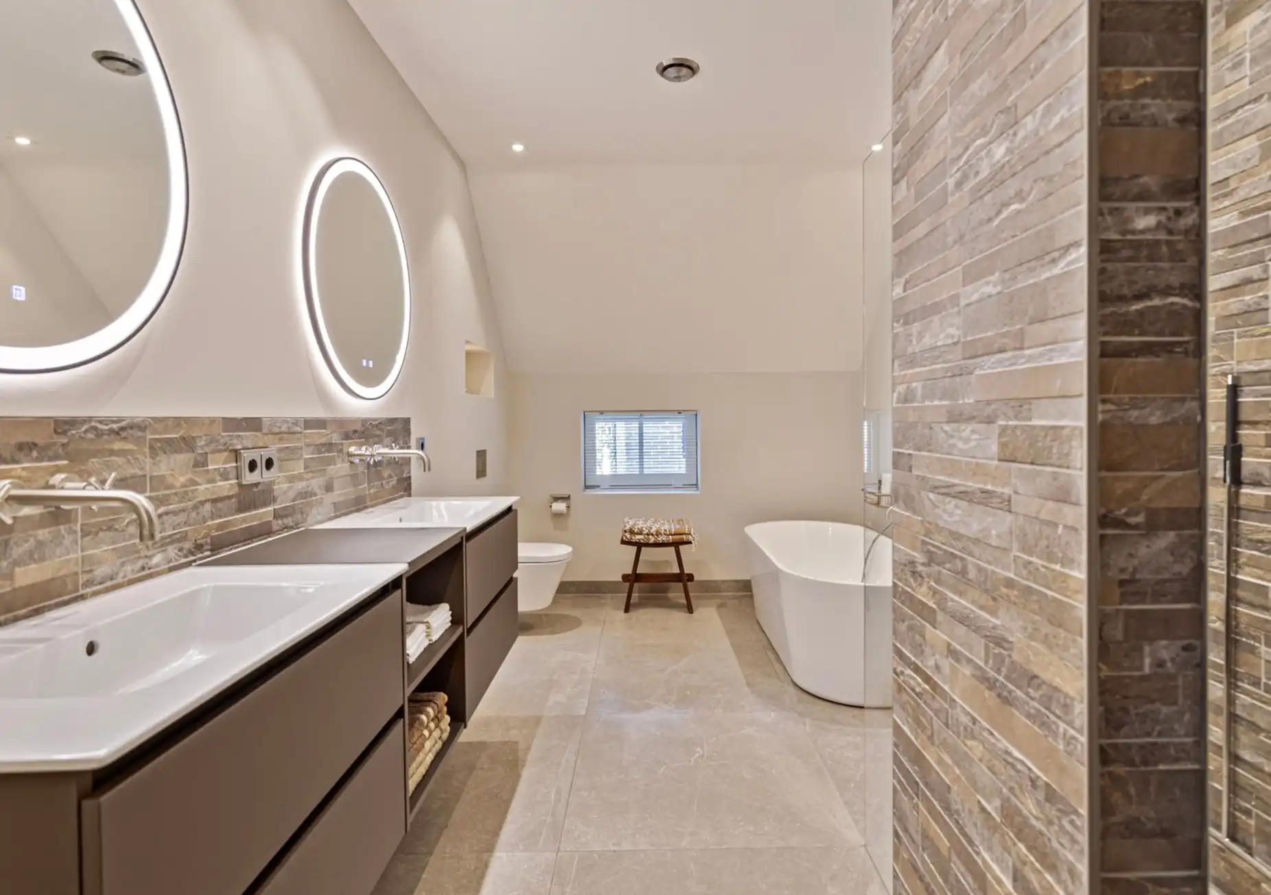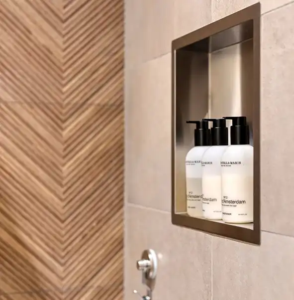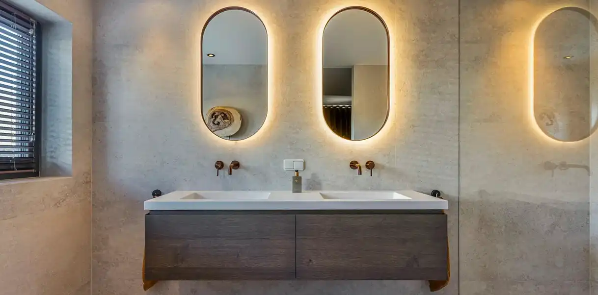 Hotel-chique badkamers brengen luxe, comfort en elegantie samen in een stijlvolle ambiance. Deze stijl is geïnspireerd op de uitstraling van exclusieve hotels en maakt gebruik van hoogwaardige materialen zoals marmer, messing, fluweel en donker hout. Rijke kleuren zoals diepblauw, smaragdgroen of taupe worden vaak gecombineerd met metaalkleurige accenten (goud en koper) en sfeervolle verlichting. Vrijstaande baden, dubbele wastafels en grote spiegels versterken het gevoel van ruimte en grandeur. Een hotel-chique badkamer is perfect voor wie elke dag wil genieten van een wellness-ervaring in eigen huis.