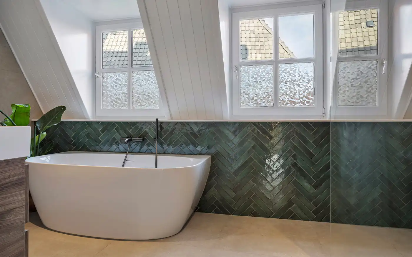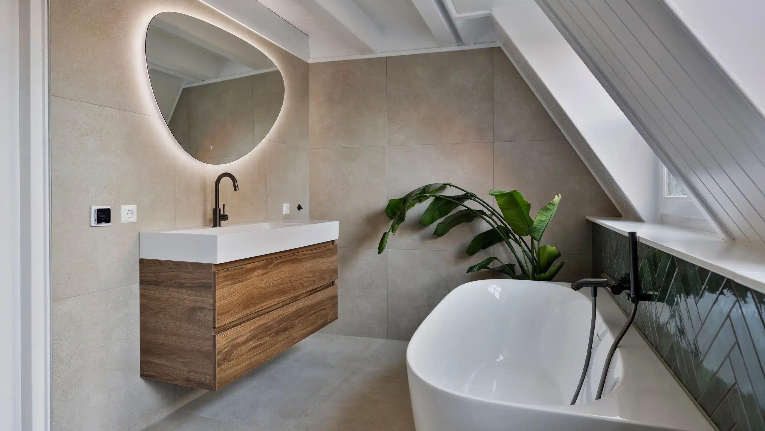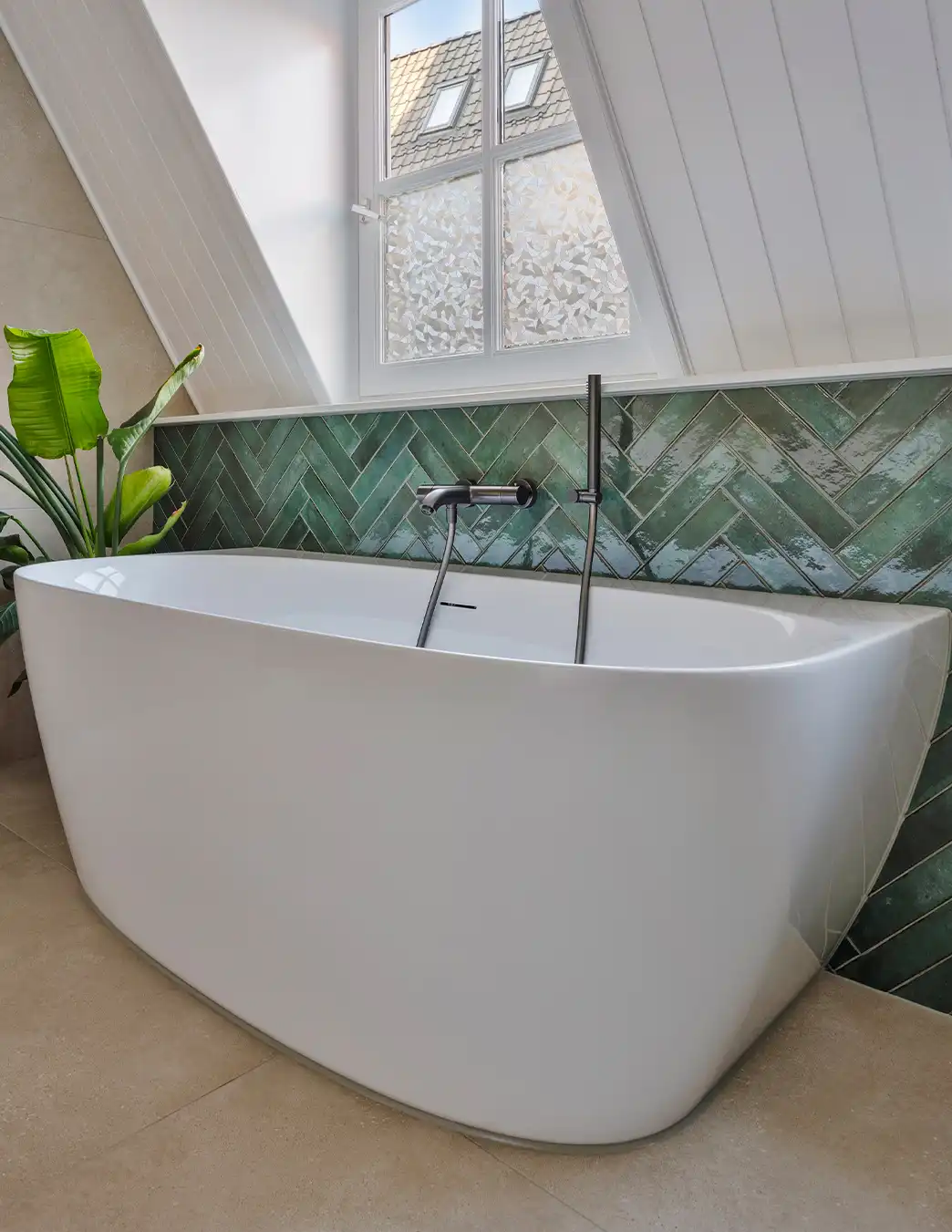 Deze moderne badkamer combineert zachte beigetinten met een opvallend groen tegelaccent voor een frisse en natuurlijke uitstraling. Het zwevende houten wastafelmeubel met strakke waskom en ronde spiegel zorgt voor rust en eenvoud, terwijl het vrijstaande ligbad de ruimte een luxe touch geeft. In de douche vormt het visgraatpatroon van de groene tegels een speels contrast dat de badkamer karakter geeft zonder de balans te verstoren.