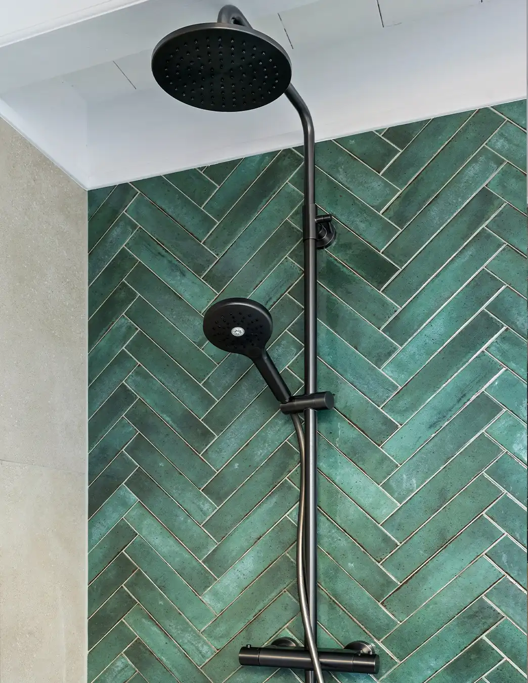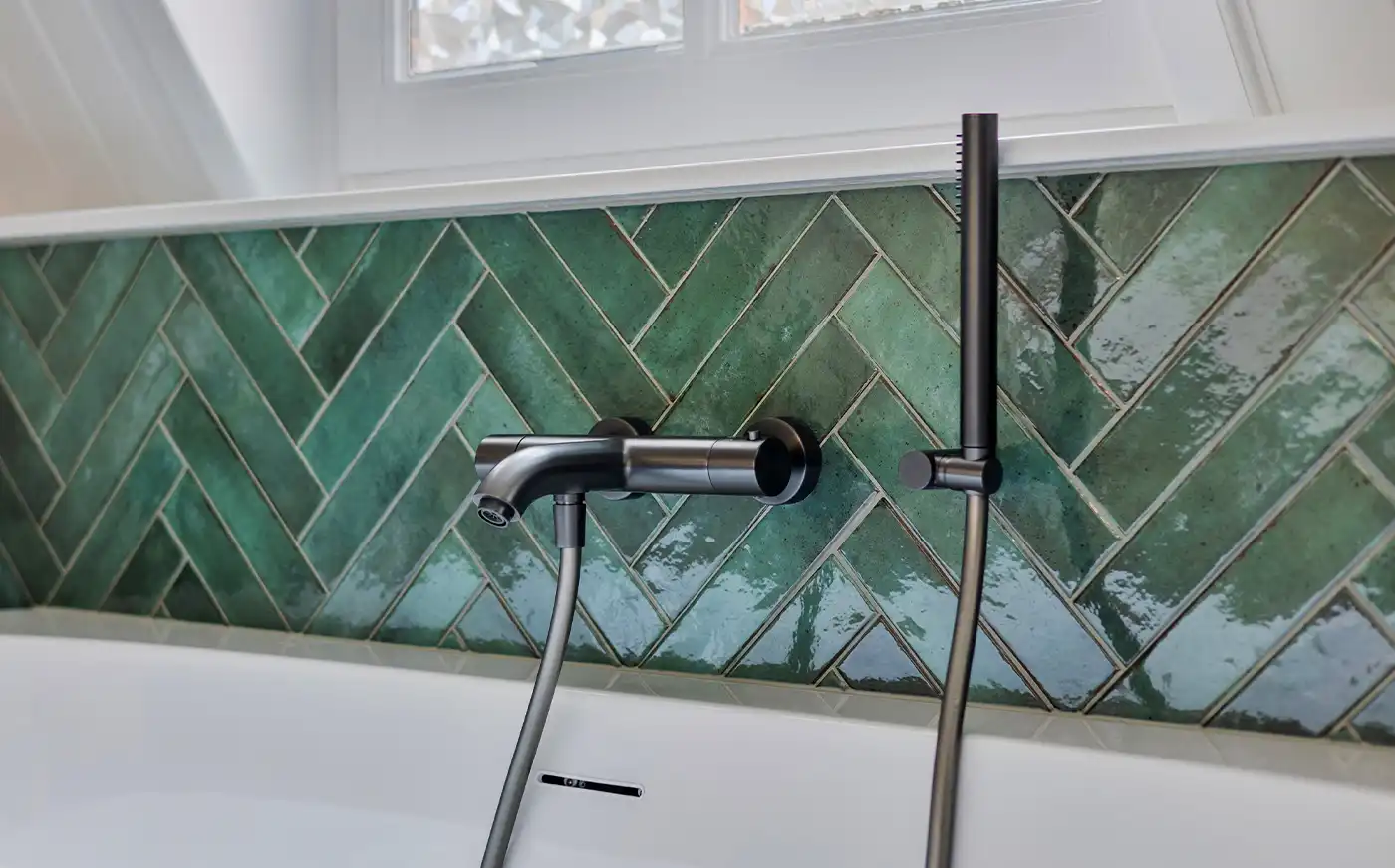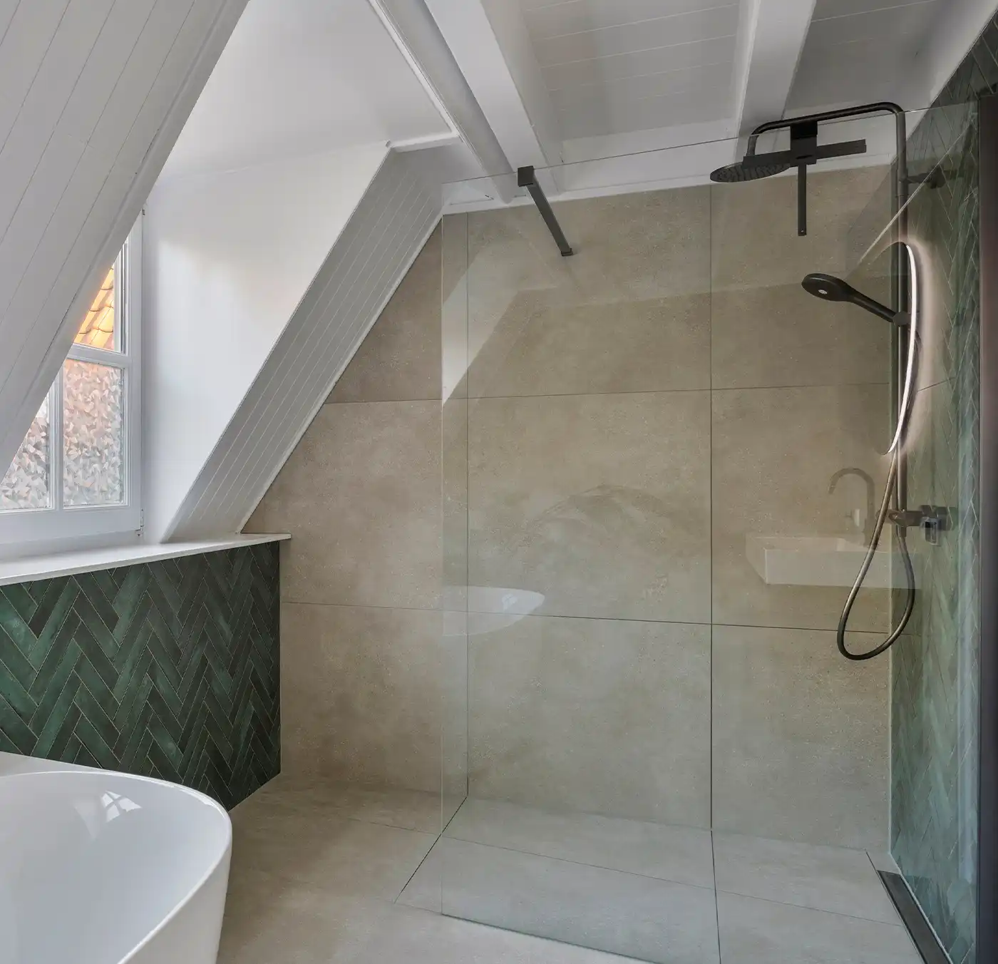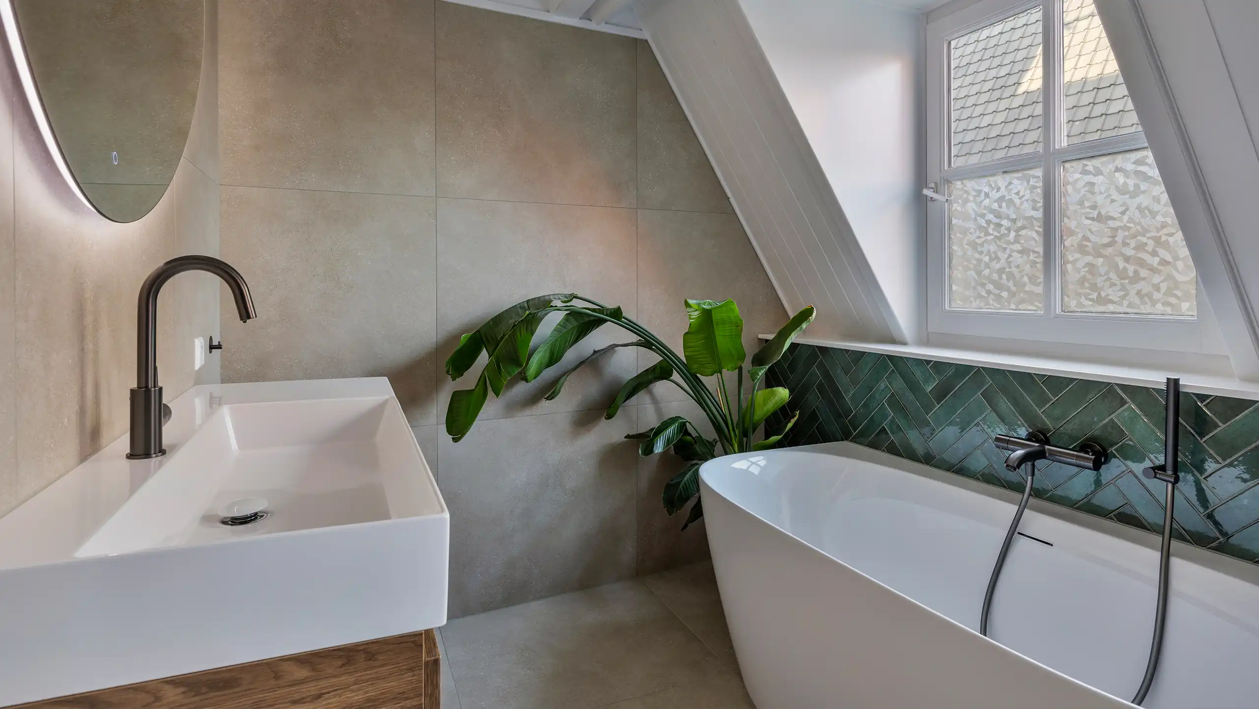 Deze moderne badkamer combineert zachte beigetinten met een opvallend groen tegelaccent voor een frisse en natuurlijke uitstraling. Het zwevende houten wastafelmeubel met strakke waskom en ronde spiegel zorgt voor rust en eenvoud, terwijl het vrijstaande ligbad de ruimte een luxe touch geeft. In de douche vormt het visgraatpatroon van de groene tegels een speels contrast dat de badkamer karakter geeft zonder de balans te verstoren.