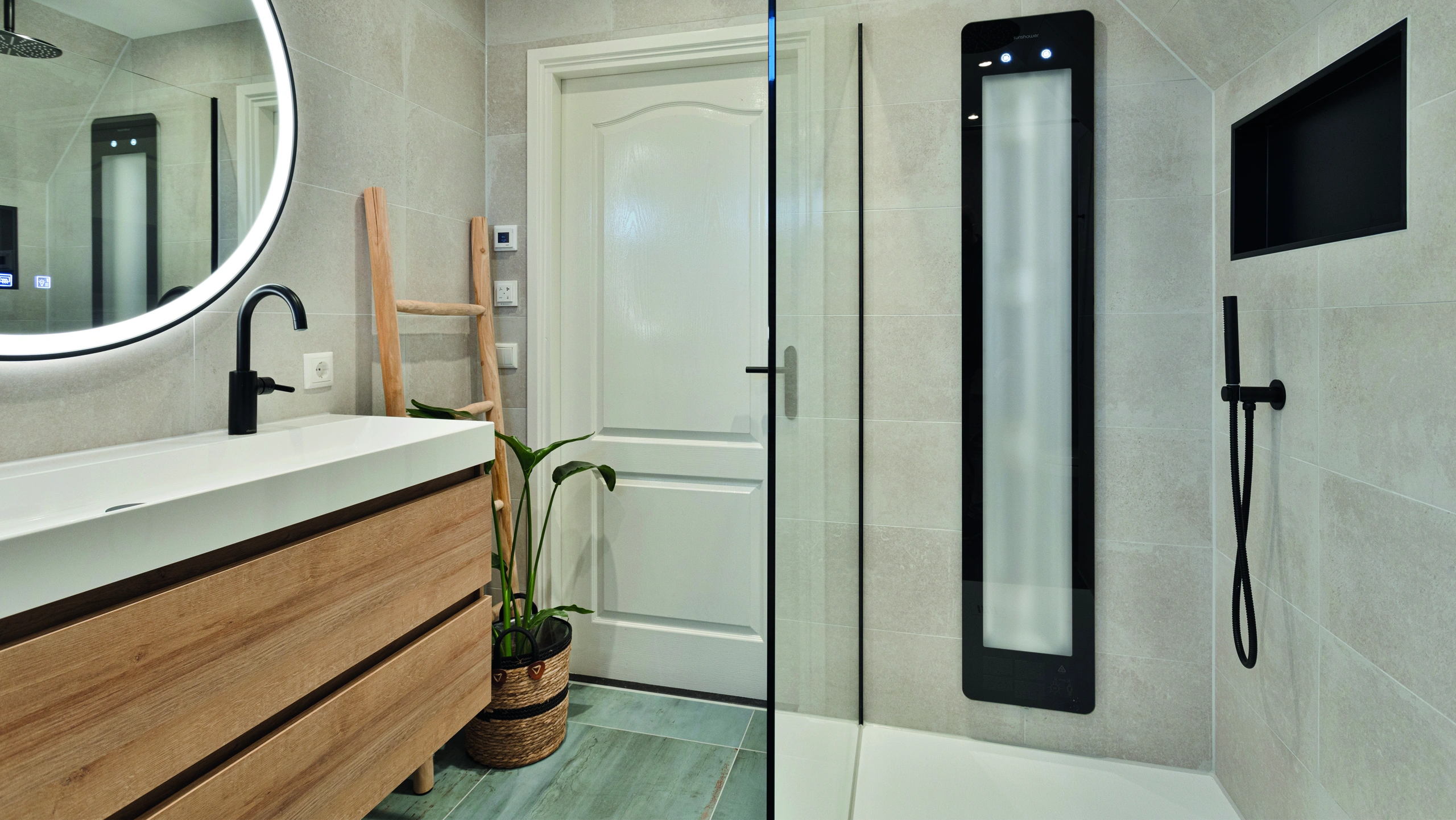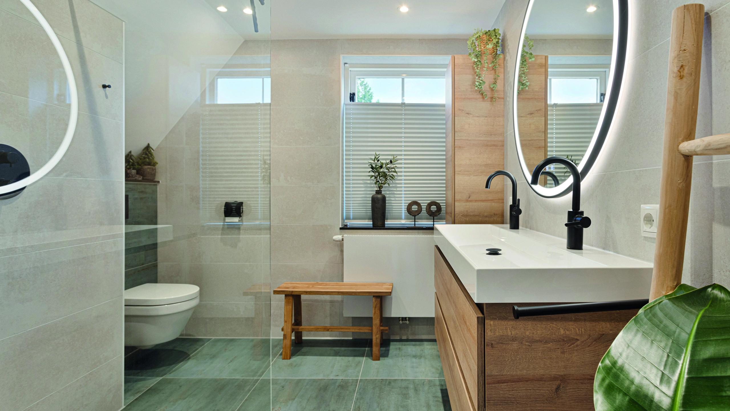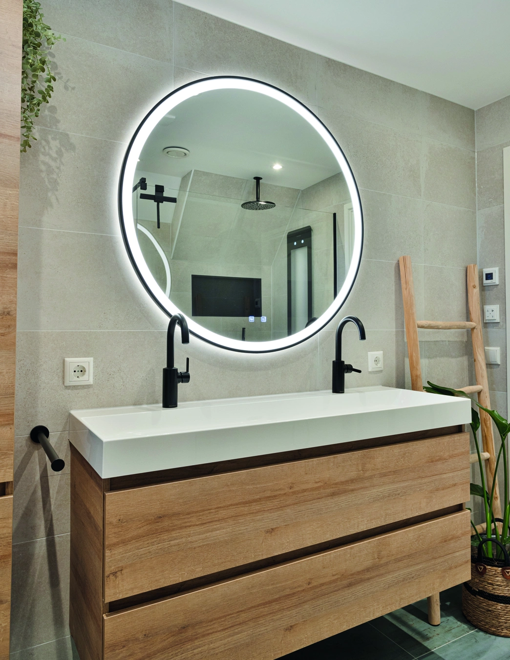 Deze moderne badkamer combineert een warm houten badmeubel met een grote ronde spiegel en luxe tegels. Het stijlvolle ontwerp straalt comfort en elegantie uit, waarbij hoogwaardige materialen zorgen voor een tijdloze uitstraling en een verfijnde dagelijkse beleving van luxe thuis.