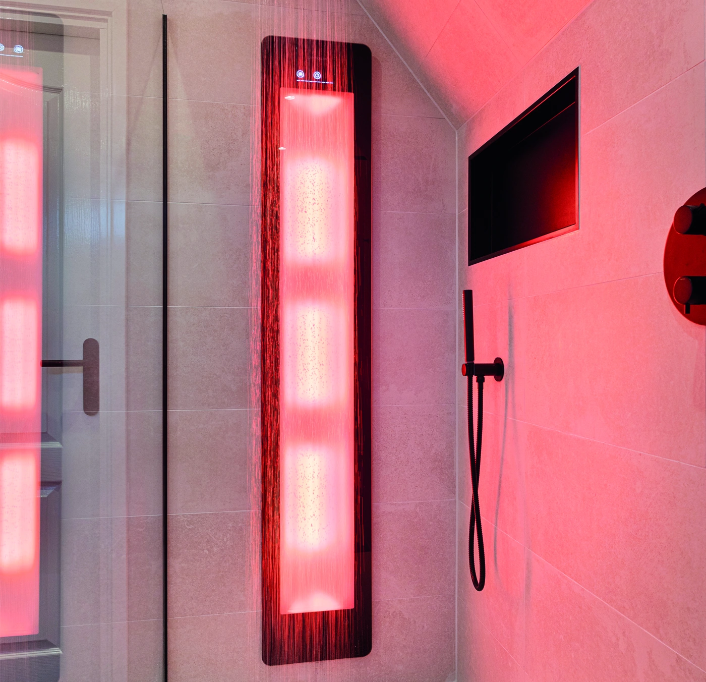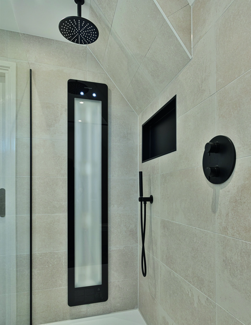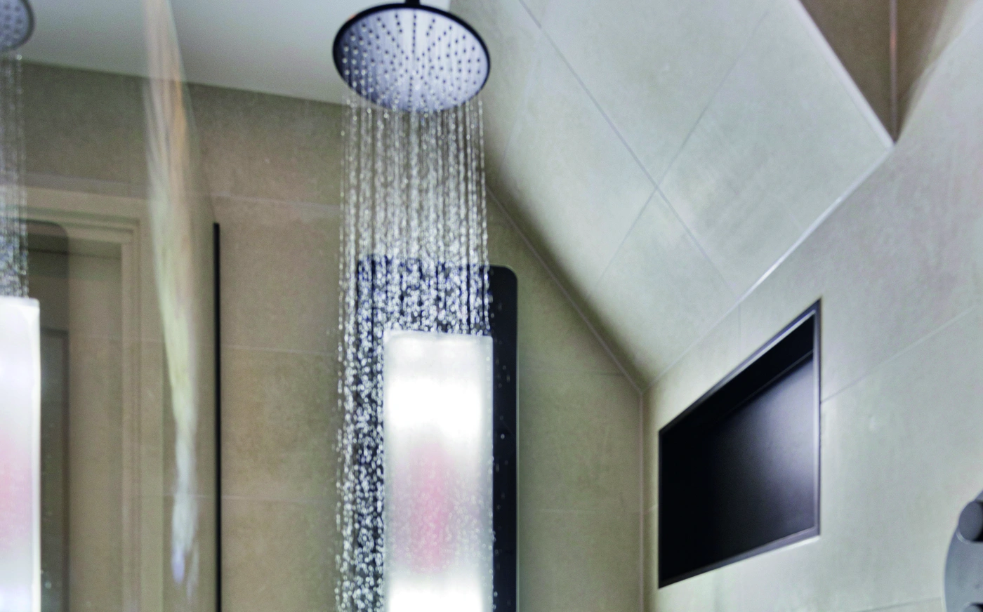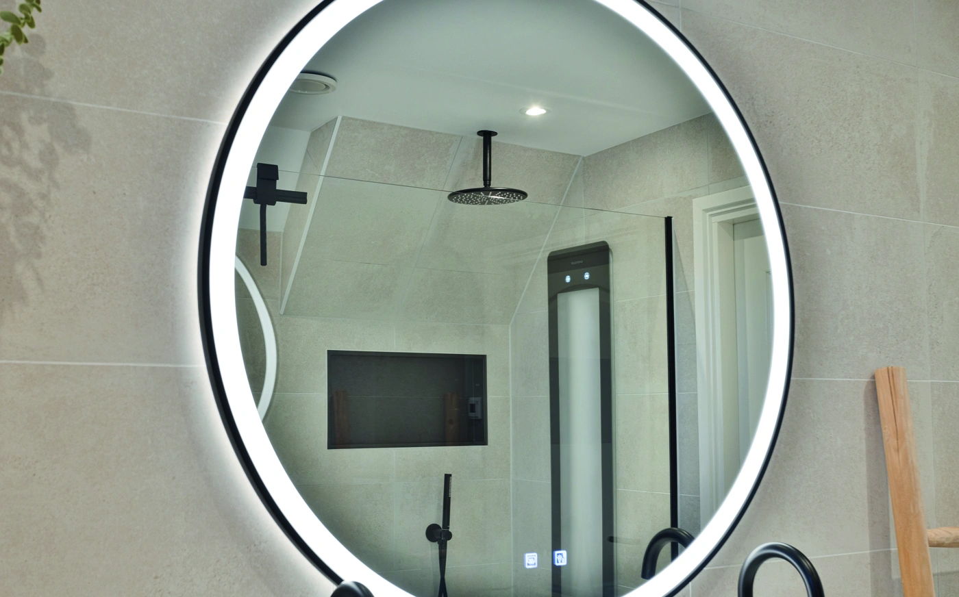 Deze moderne badkamer combineert een warm houten badmeubel met een grote ronde spiegel en luxe tegels. Het stijlvolle ontwerp straalt comfort en elegantie uit, waarbij hoogwaardige materialen zorgen voor een tijdloze uitstraling en een verfijnde dagelijkse beleving van luxe thuis.