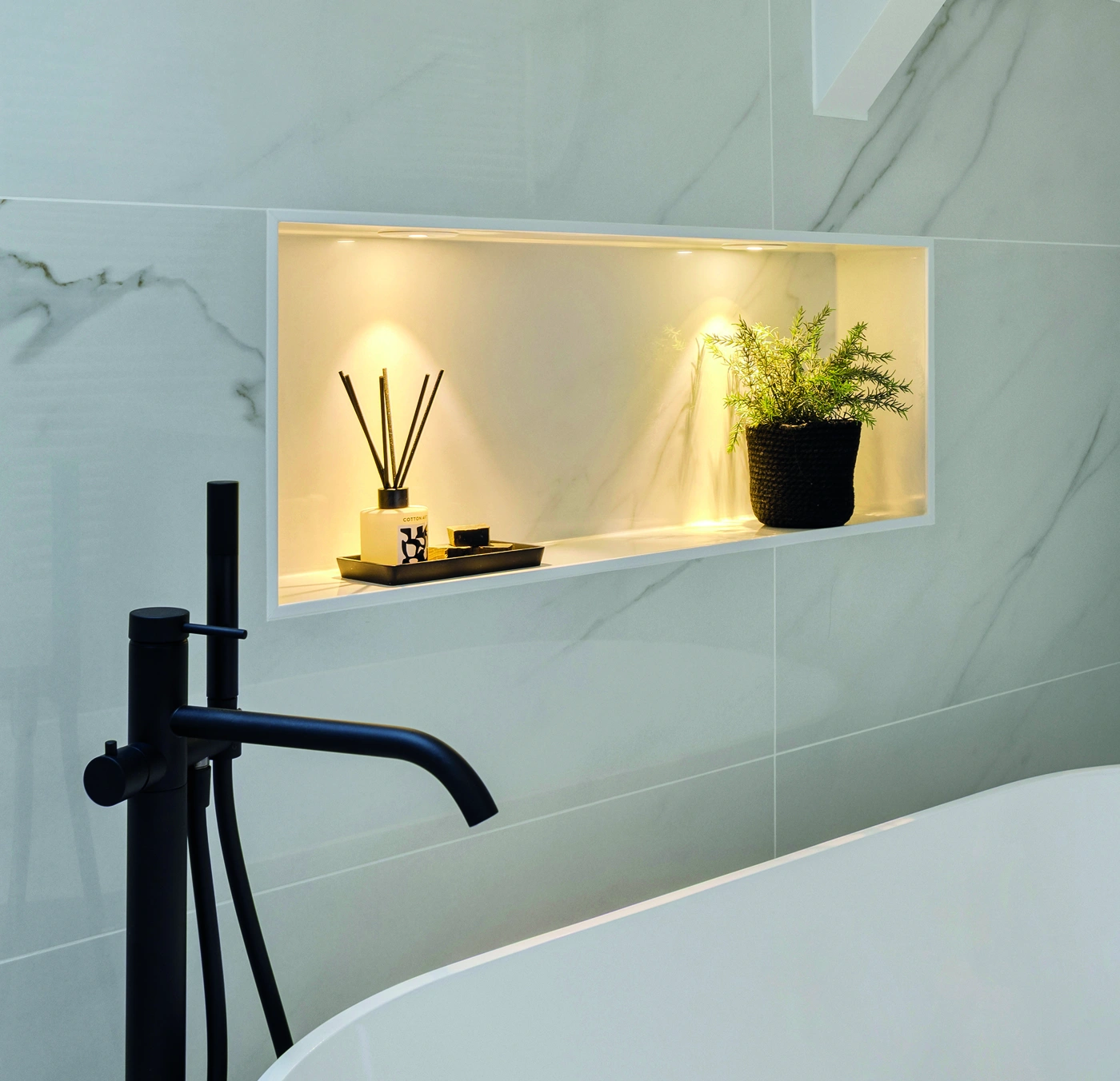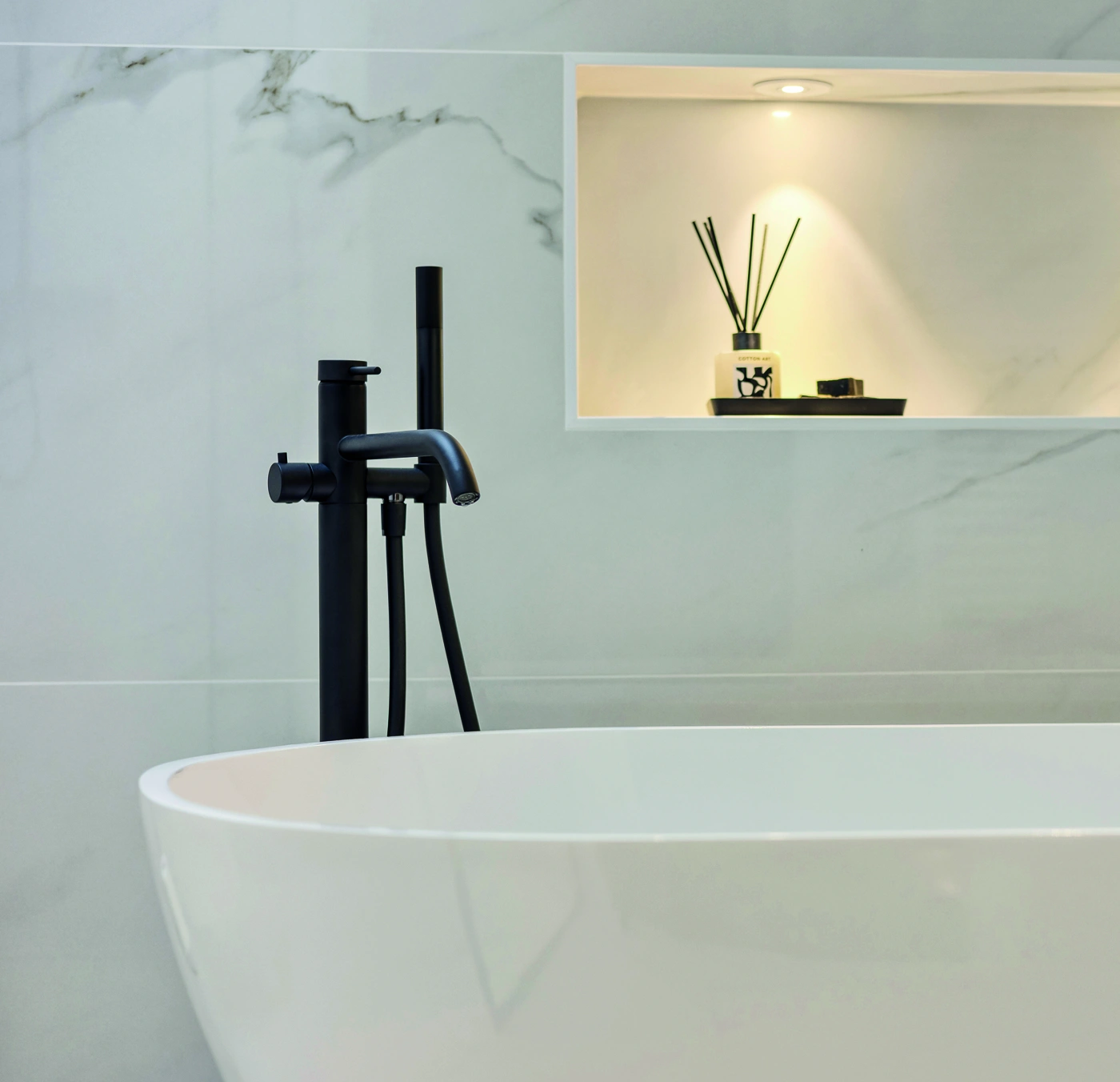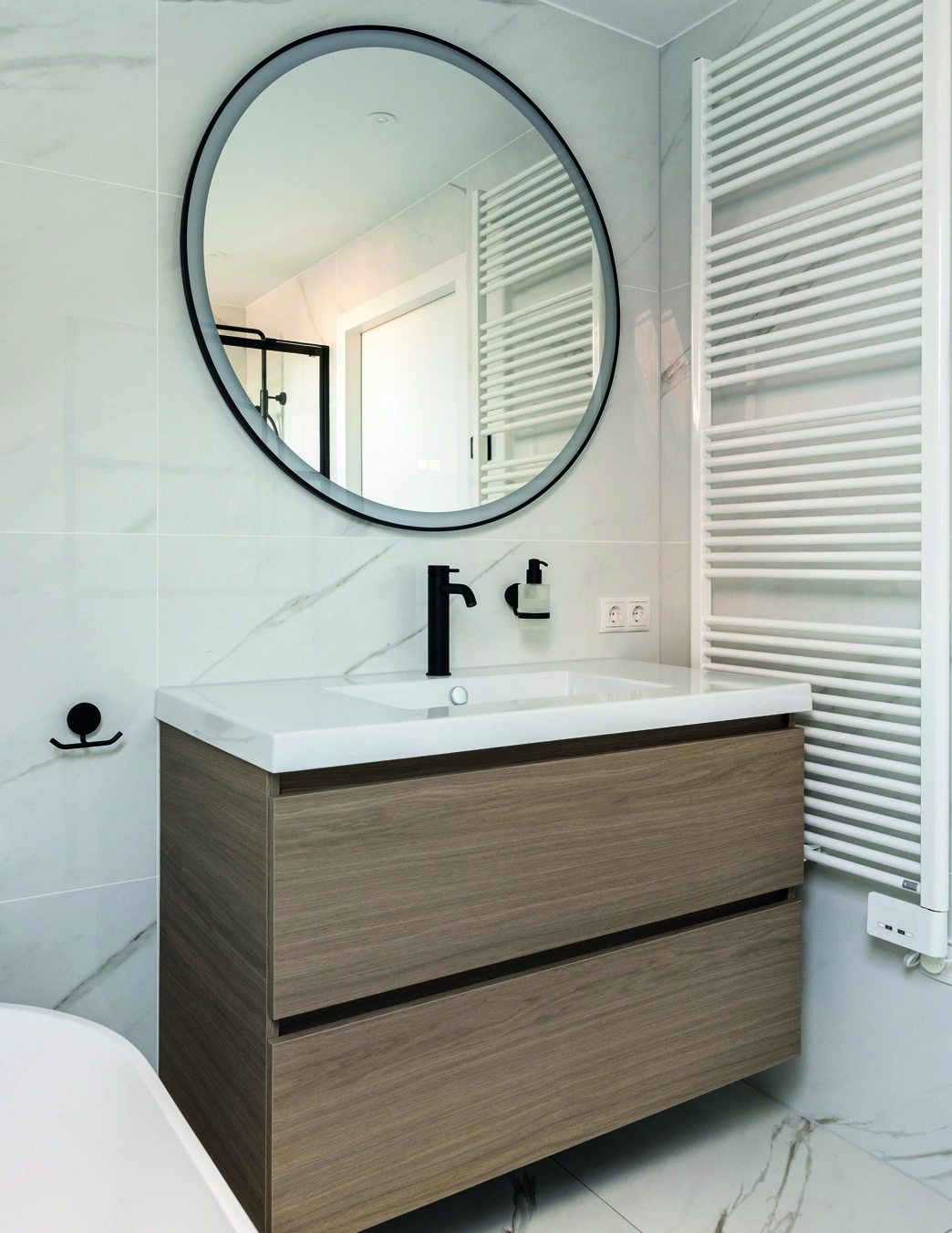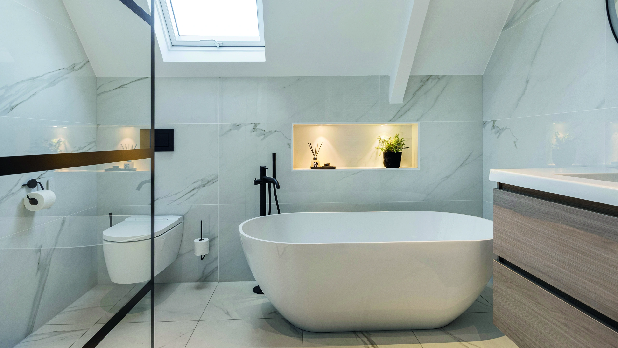Deze moderne badkamer combineert licht, ruimte en elegantie. Marmeren wanden, een vrijstaand bad en zwarte accenten zorgen voor een rustige, luxe sfeer. Slimme nisverlichting en maatwerkmeubilair maken het ontwerp functioneel, tijdloos en perfect afgestemd op dagelijks comfort en ontspanning thuis.