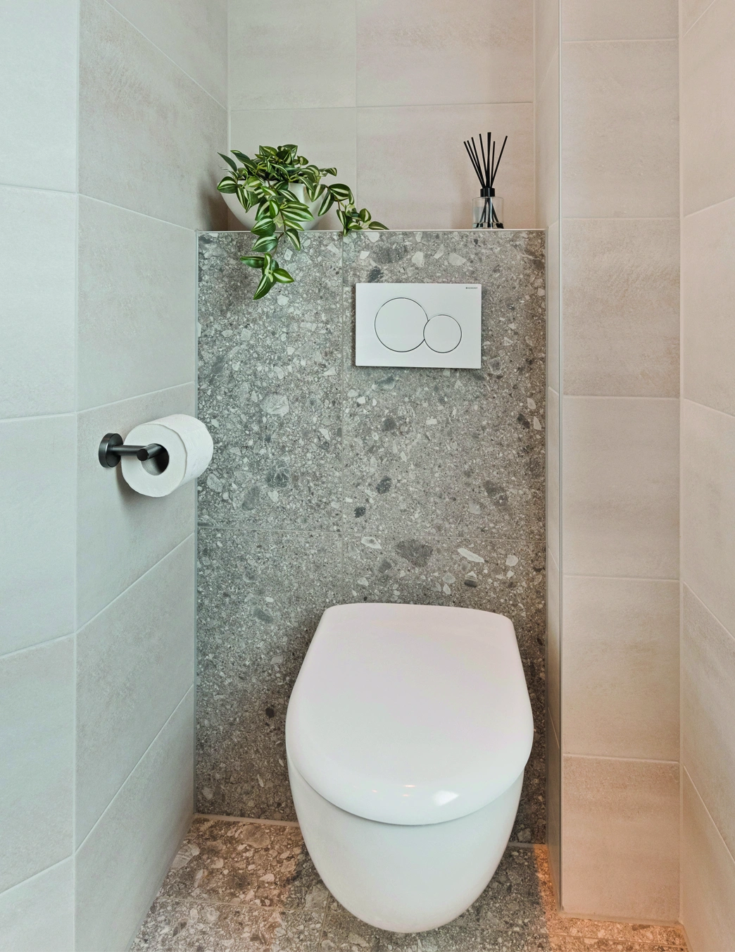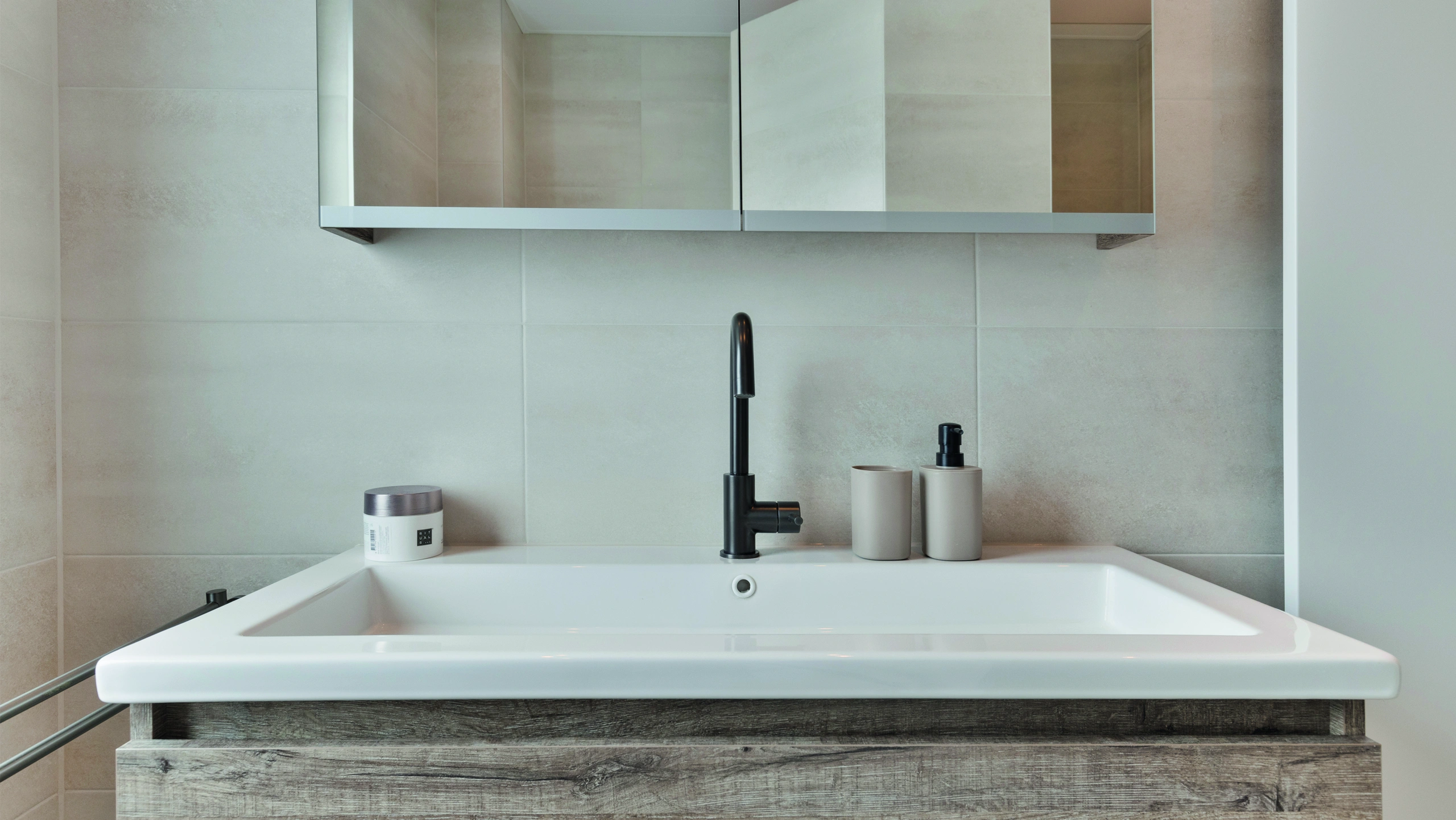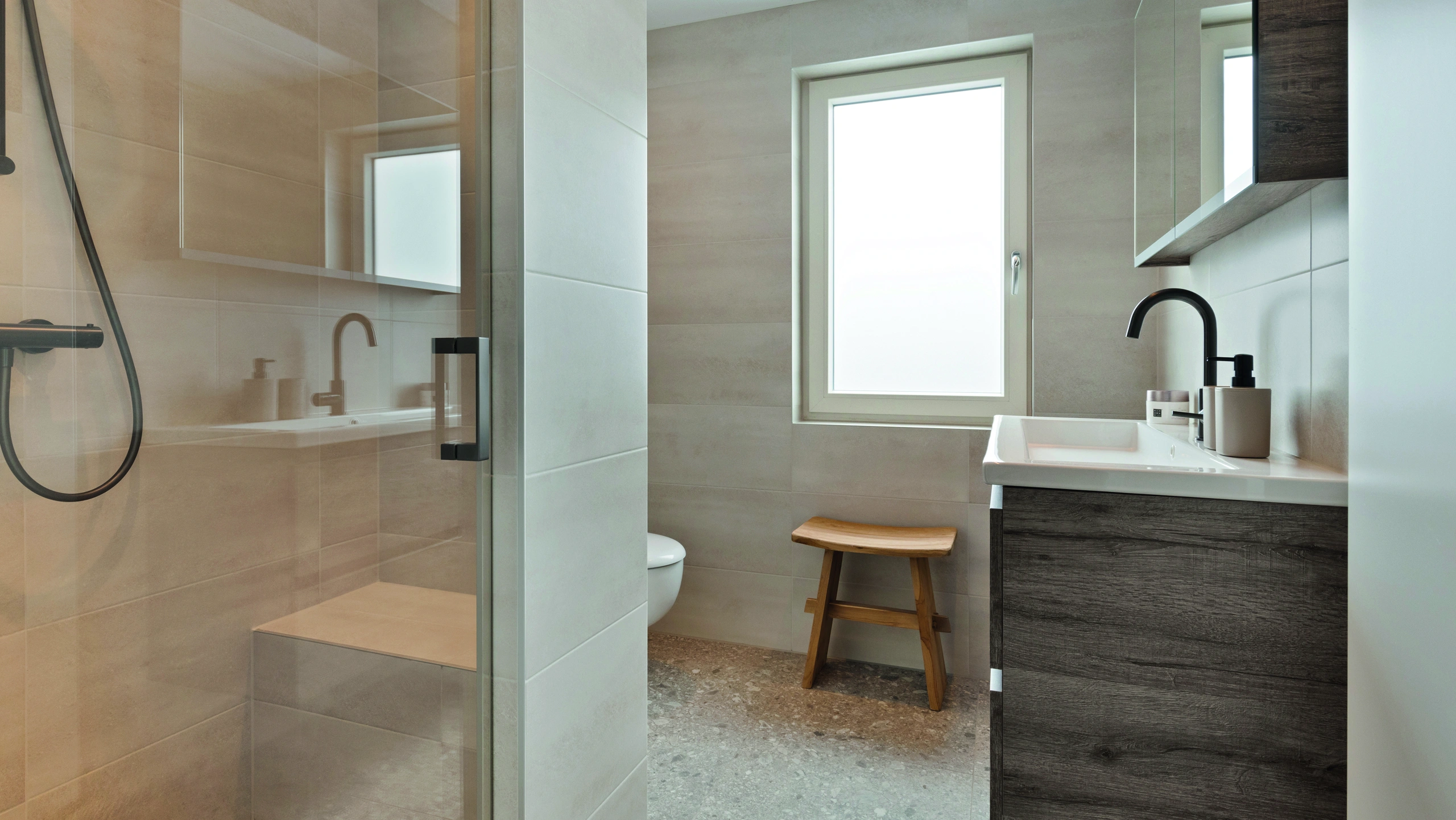 Deze moderne badkamer voelt licht en ruim. Zachte tegels, natuurlijke accenten en strakke lijnen creëren rust. De glazen douche, warme houtdetails en functionele indeling zorgen voor comfort, eenvoud en een frisse, uitnodigende sfeer voor dagelijks gebruik thuis met tijdloze uitstraling.