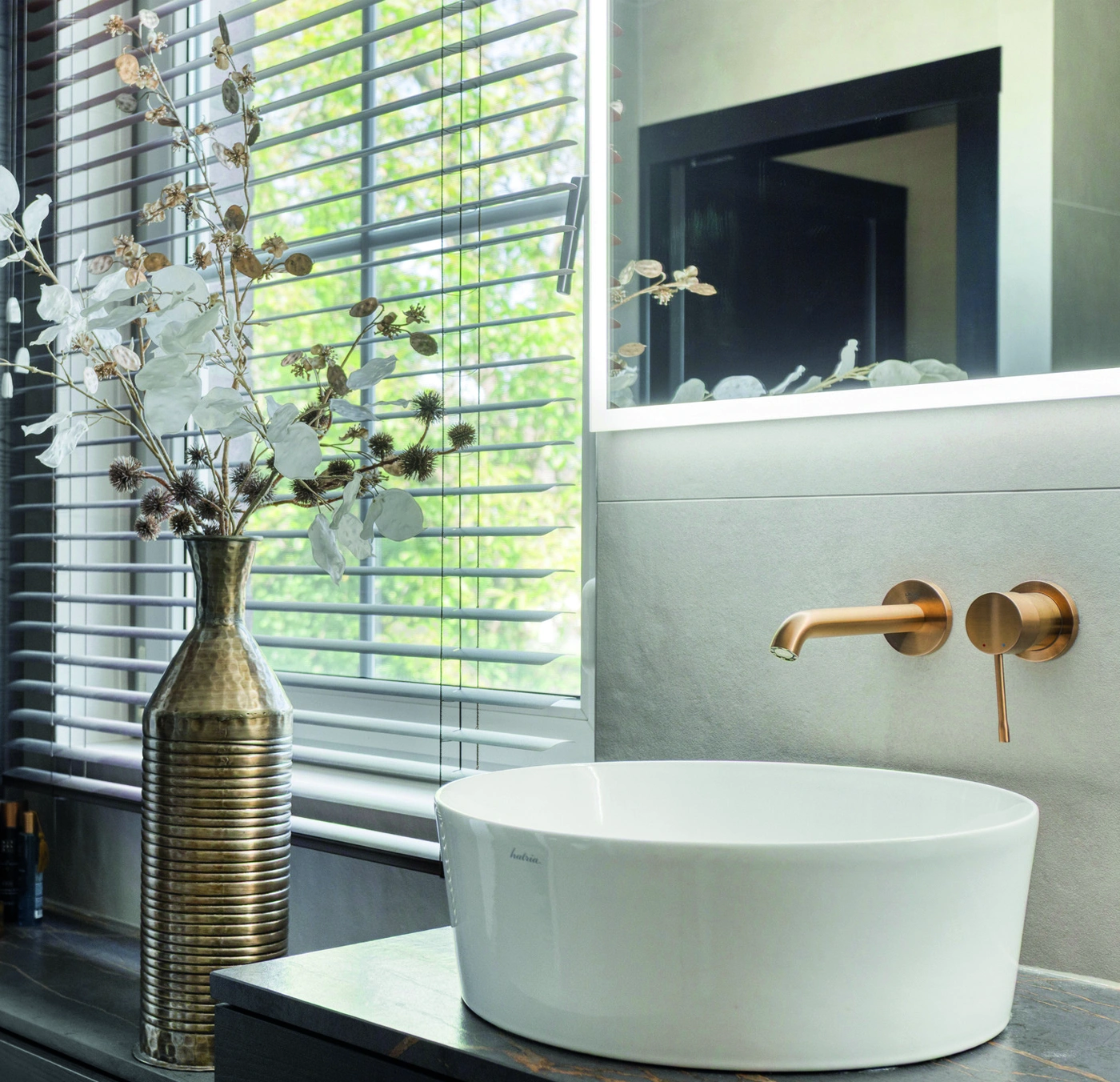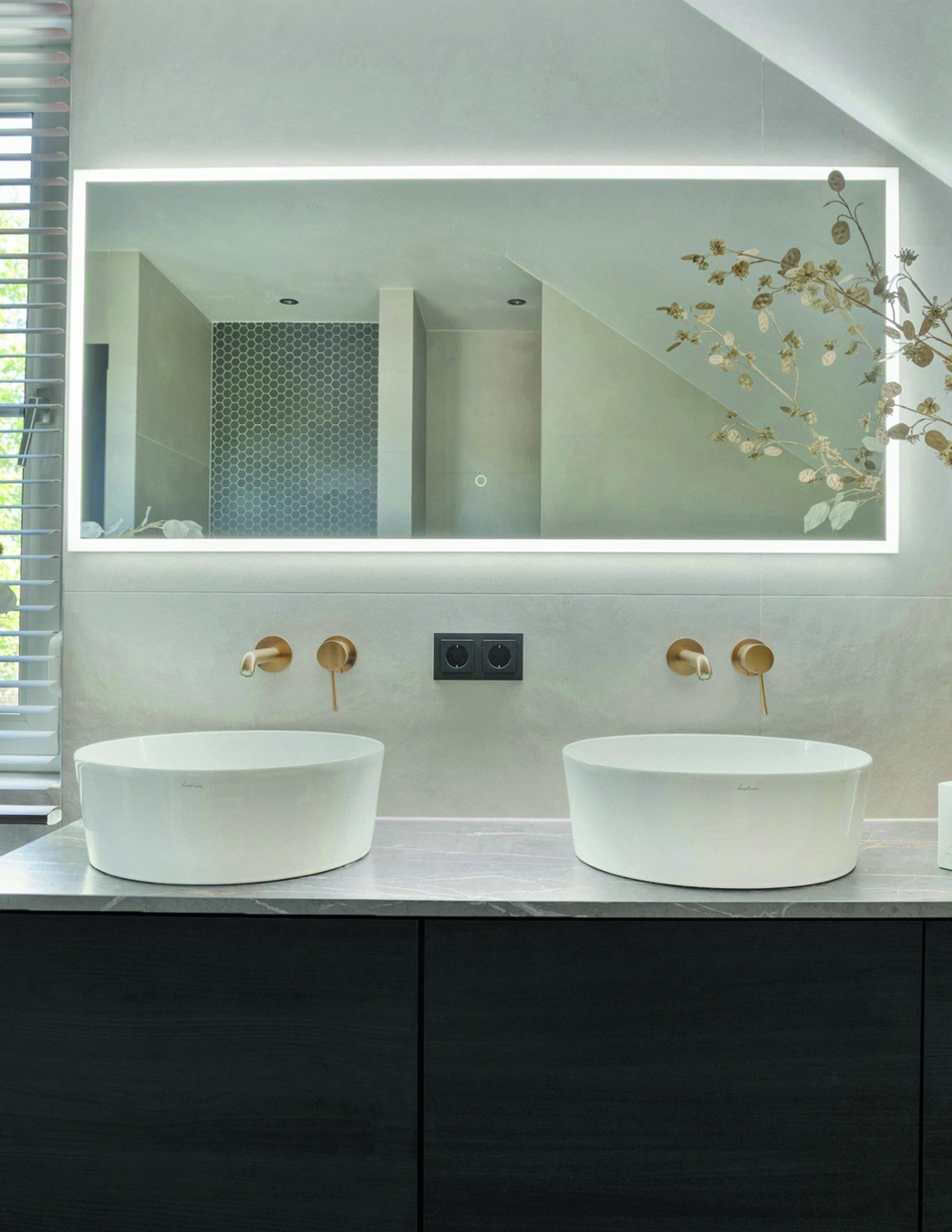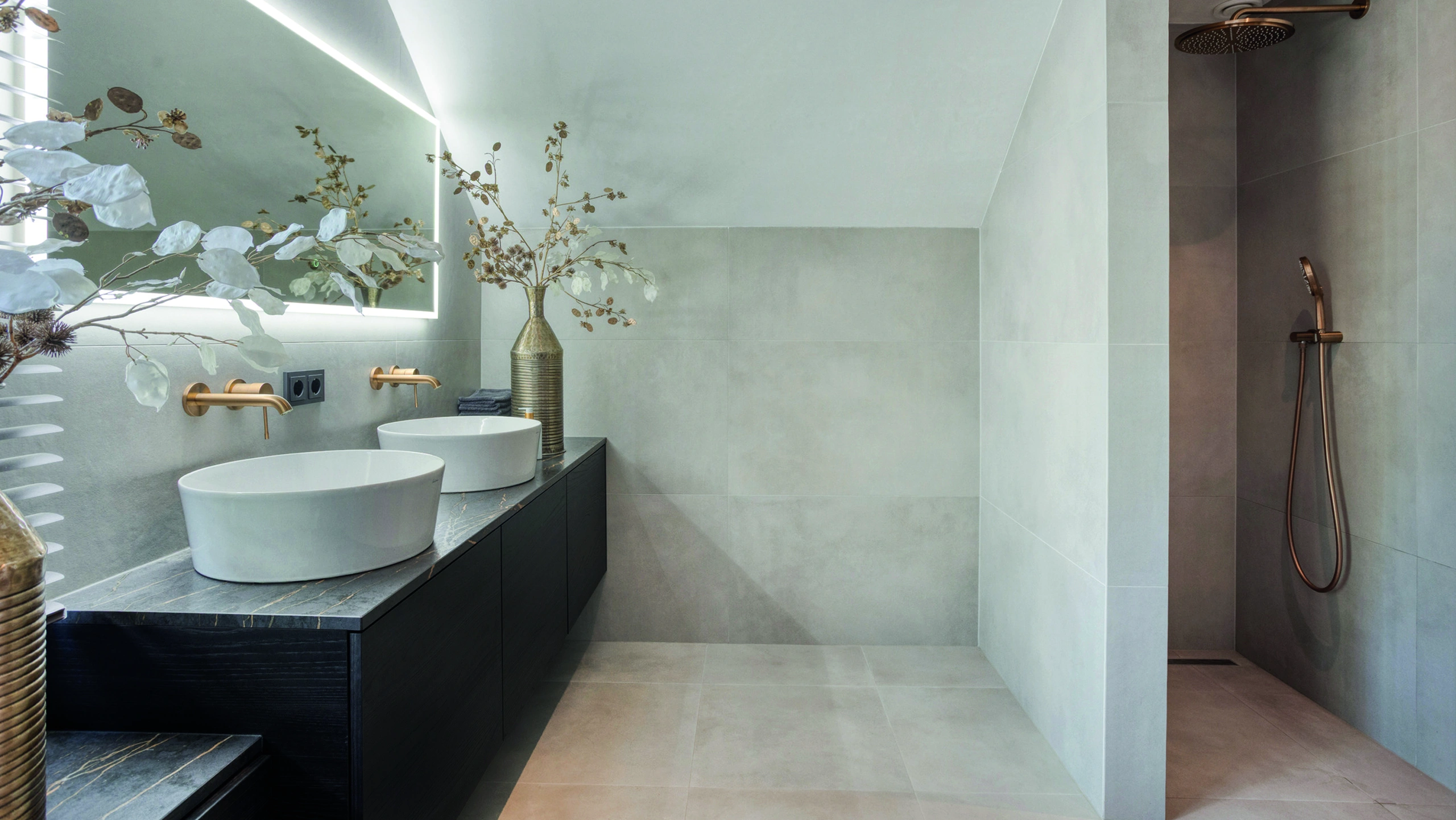 Een serene, minimalistische badkamer met zachte betonlook, zwevende meubels en warme messing accenten. Dubbele waskommen, indirect licht en een open regendouche creëren een luxe hotelsfeer waar rust, design en hedendaags comfort samenkomen in een tijdloos, stedelijk interieur met karakter puur.
