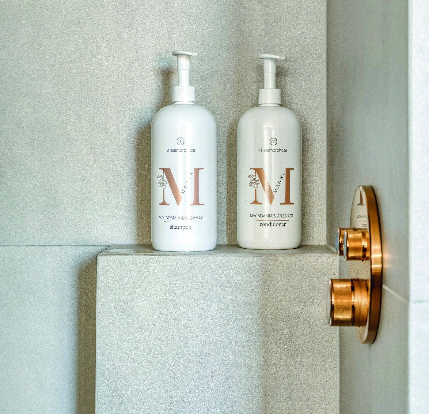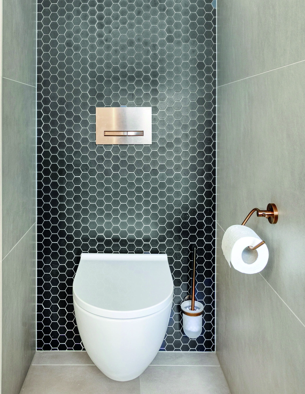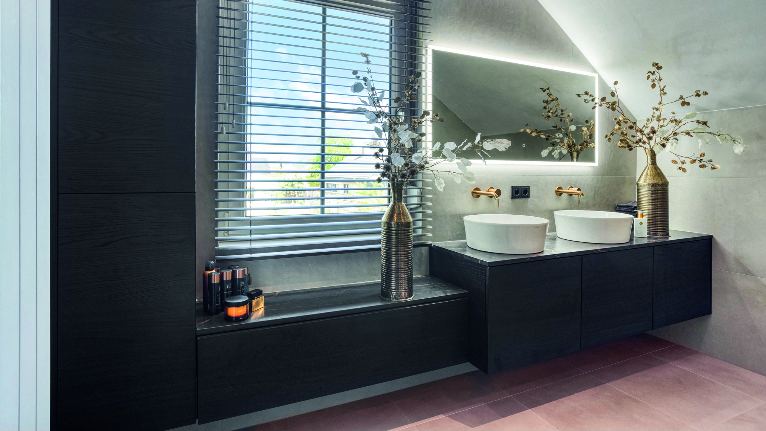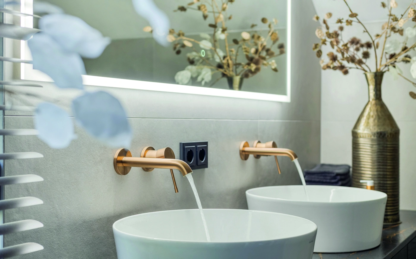 Een serene, minimalistische badkamer met zachte betonlook, zwevende meubels en warme messing accenten. Dubbele waskommen, indirect licht en een open regendouche creëren een luxe hotelsfeer waar rust, design en hedendaags comfort samenkomen in een tijdloos, stedelijk interieur met karakter puur.
