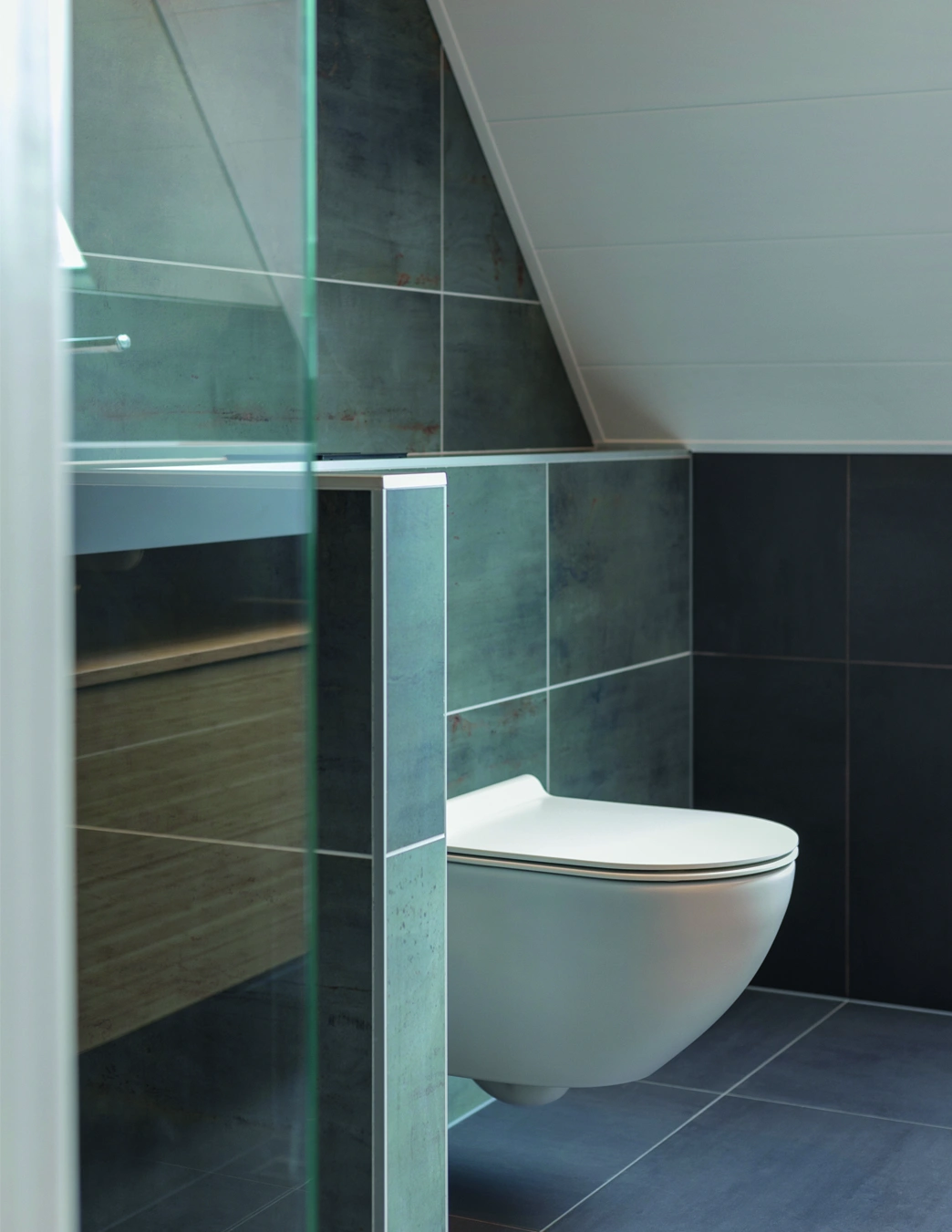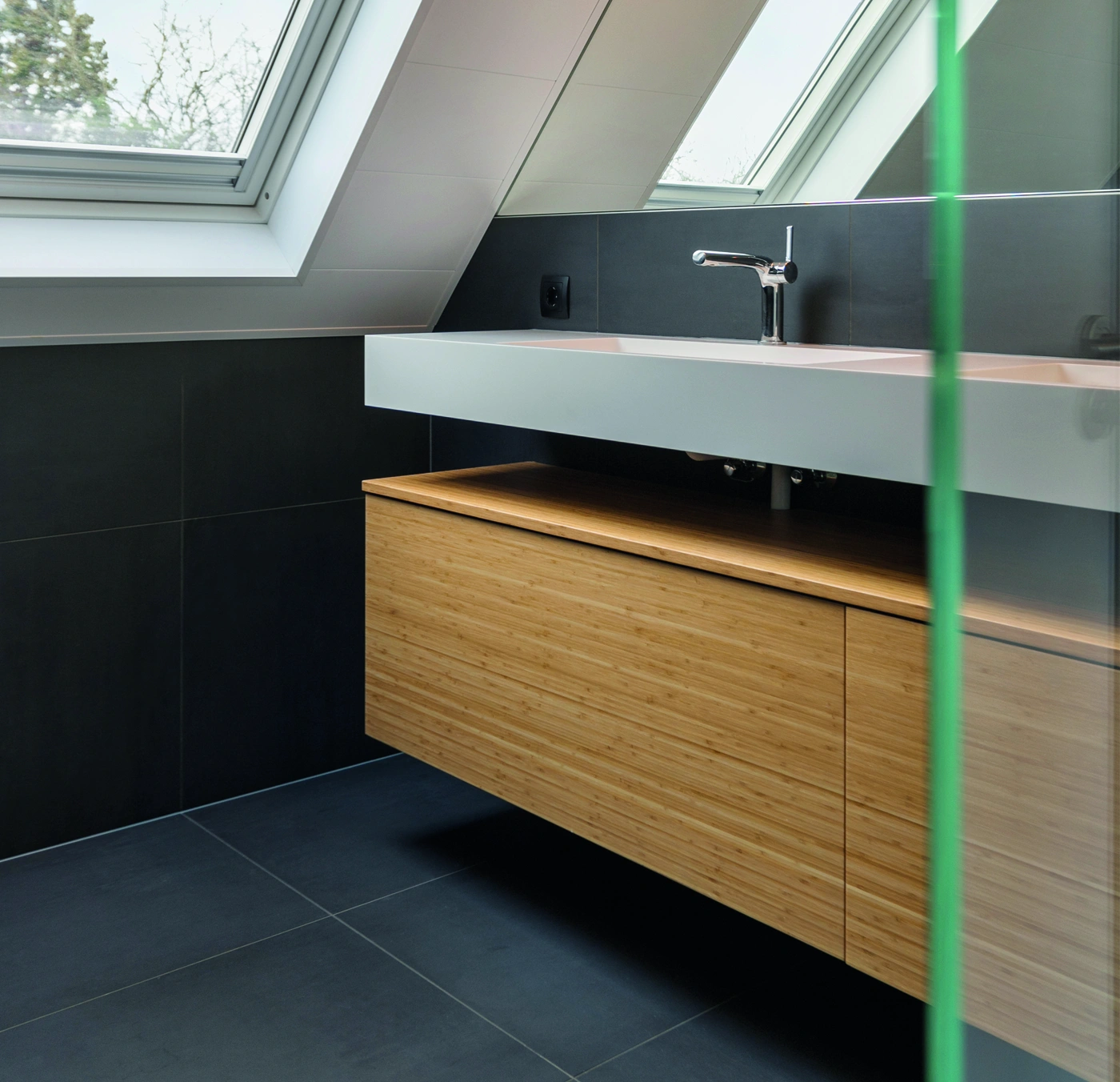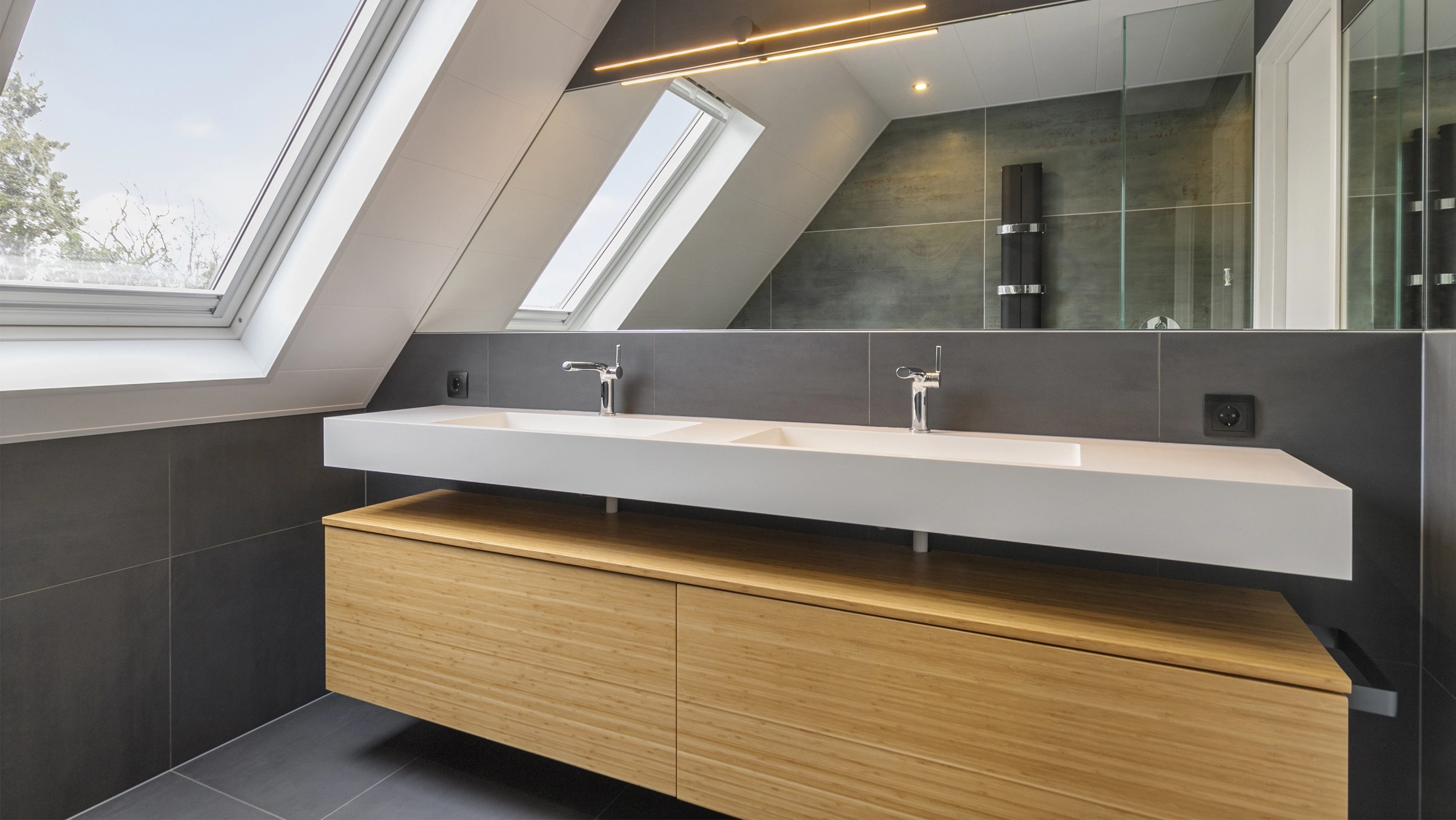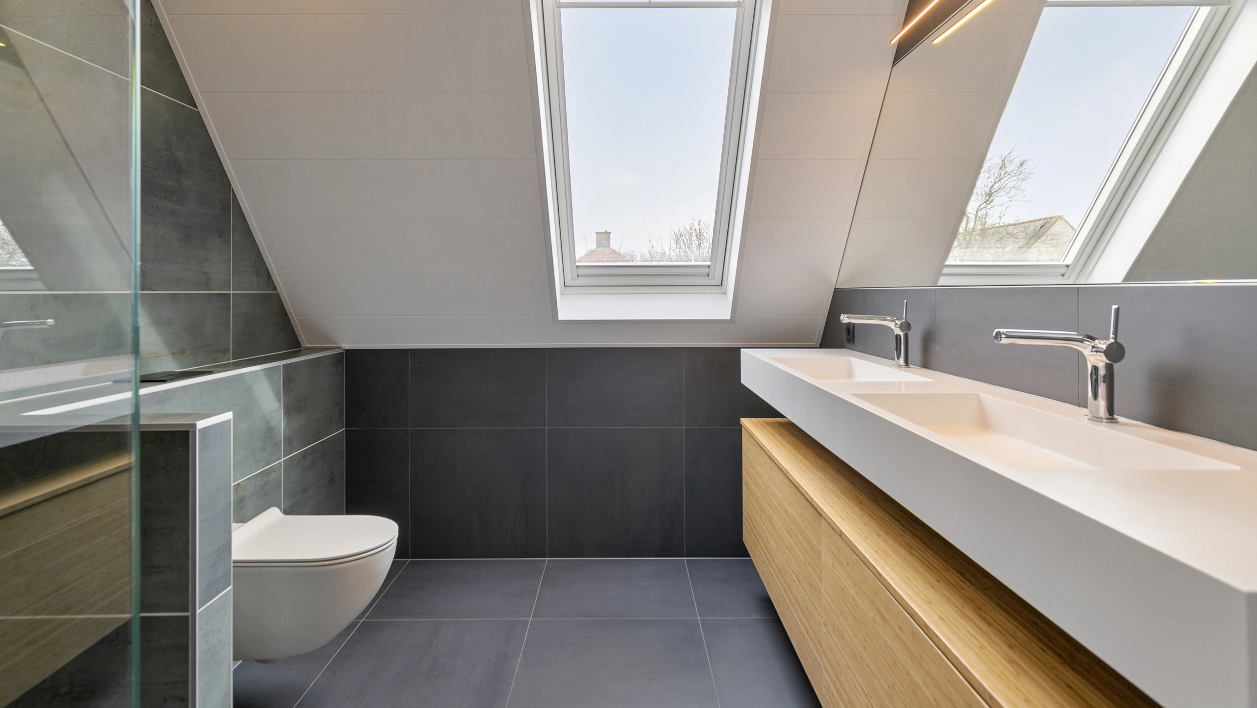 Grote grijze tegels geven deze badkamer een rustige uitstraling. Het houten badmeubel met twee witte wastafels zorgt voor warmte en functionaliteit. De strakke afwerking en compacte indeling maken de ruimte modern, praktisch en stijlvol voor dagelijks comfort thuis.