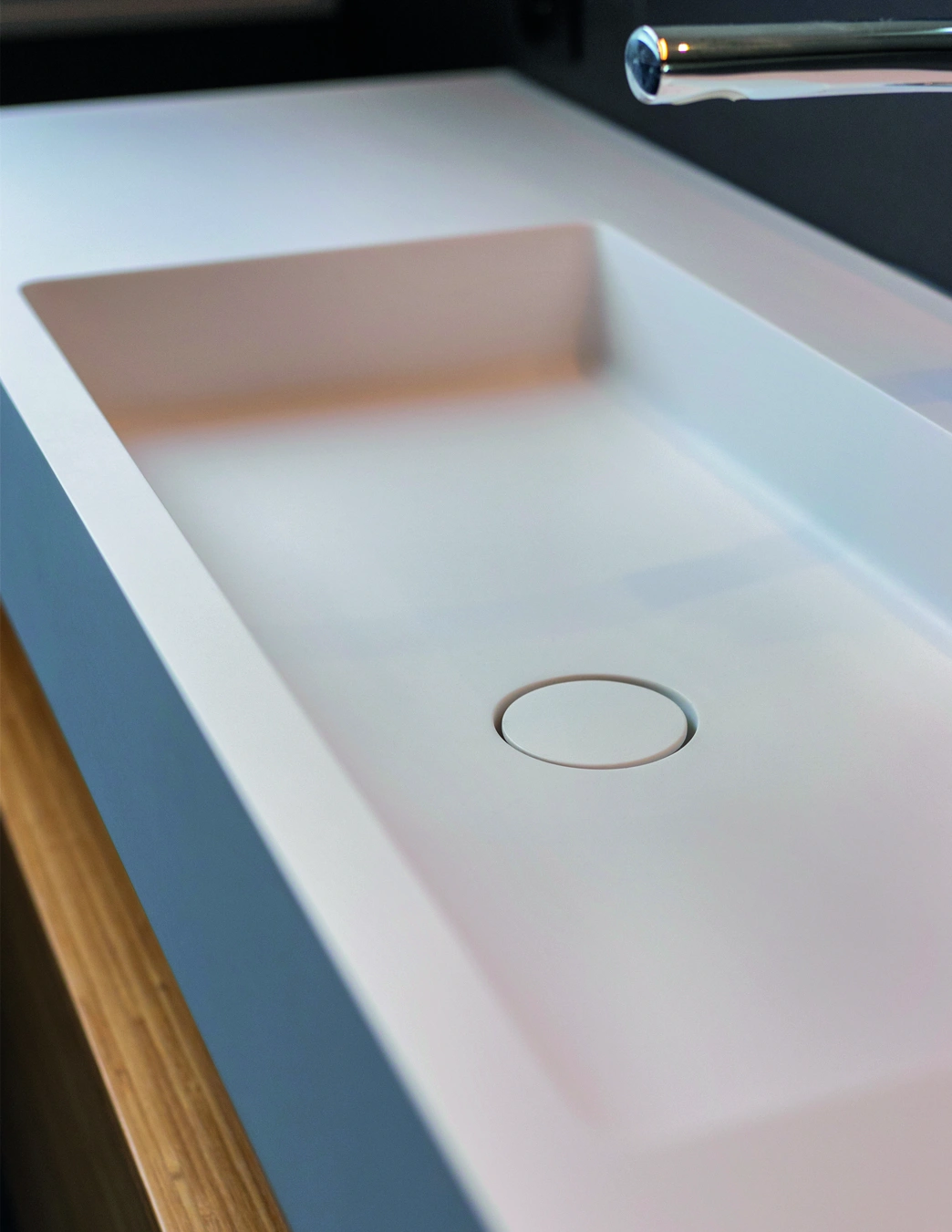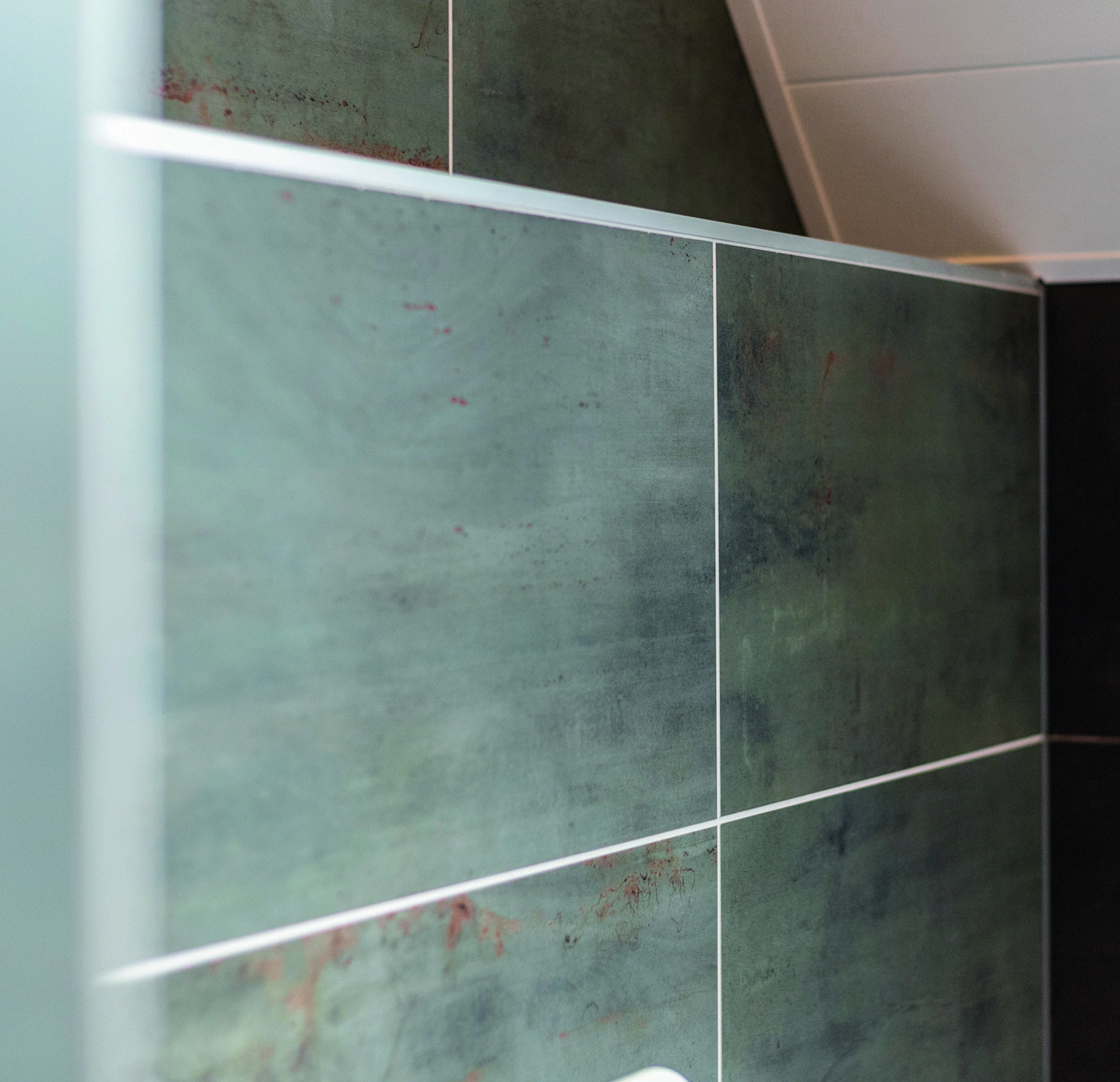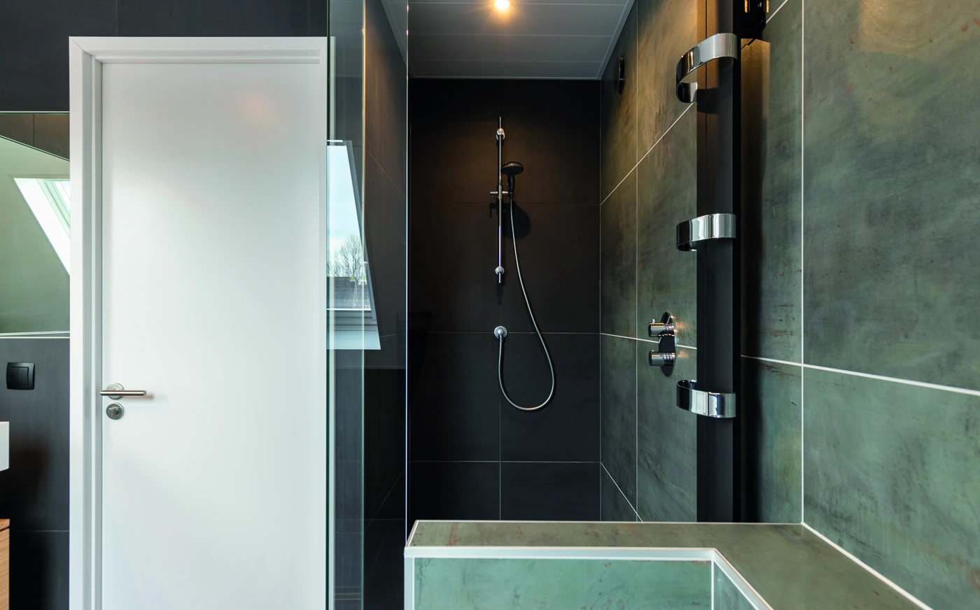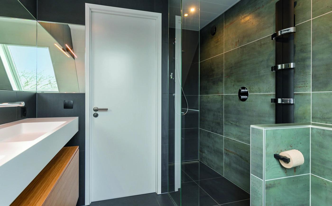 Grote grijze tegels geven deze badkamer een rustige uitstraling. Het houten badmeubel met twee witte wastafels zorgt voor warmte en functionaliteit. De strakke afwerking en compacte indeling maken de ruimte modern, praktisch en stijlvol voor dagelijks comfort thuis.