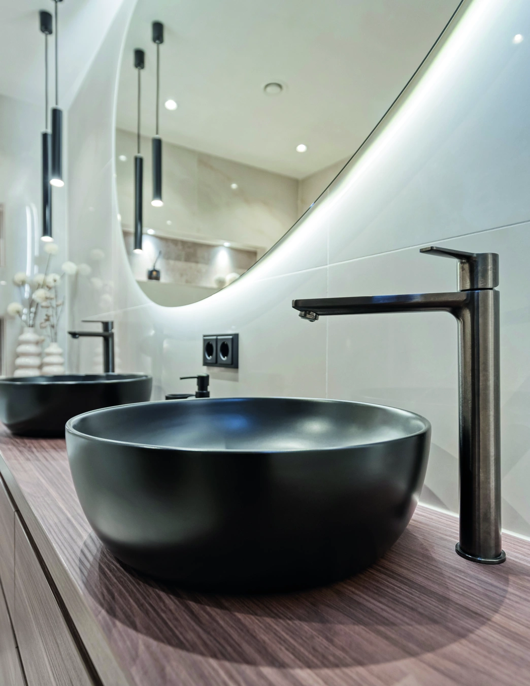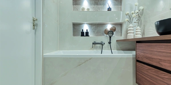 Stap binnen in een oase van rust. Deze moderne badkamer combineert strak design met warme materialen. Subtiele verlichting, slimme opbergnissen en luxe afwerking creëren dagelijks comfort, ontspanning en tijdloze elegantie in elke woning voor stijlbewuste liefhebbers van kwaliteit en balans.