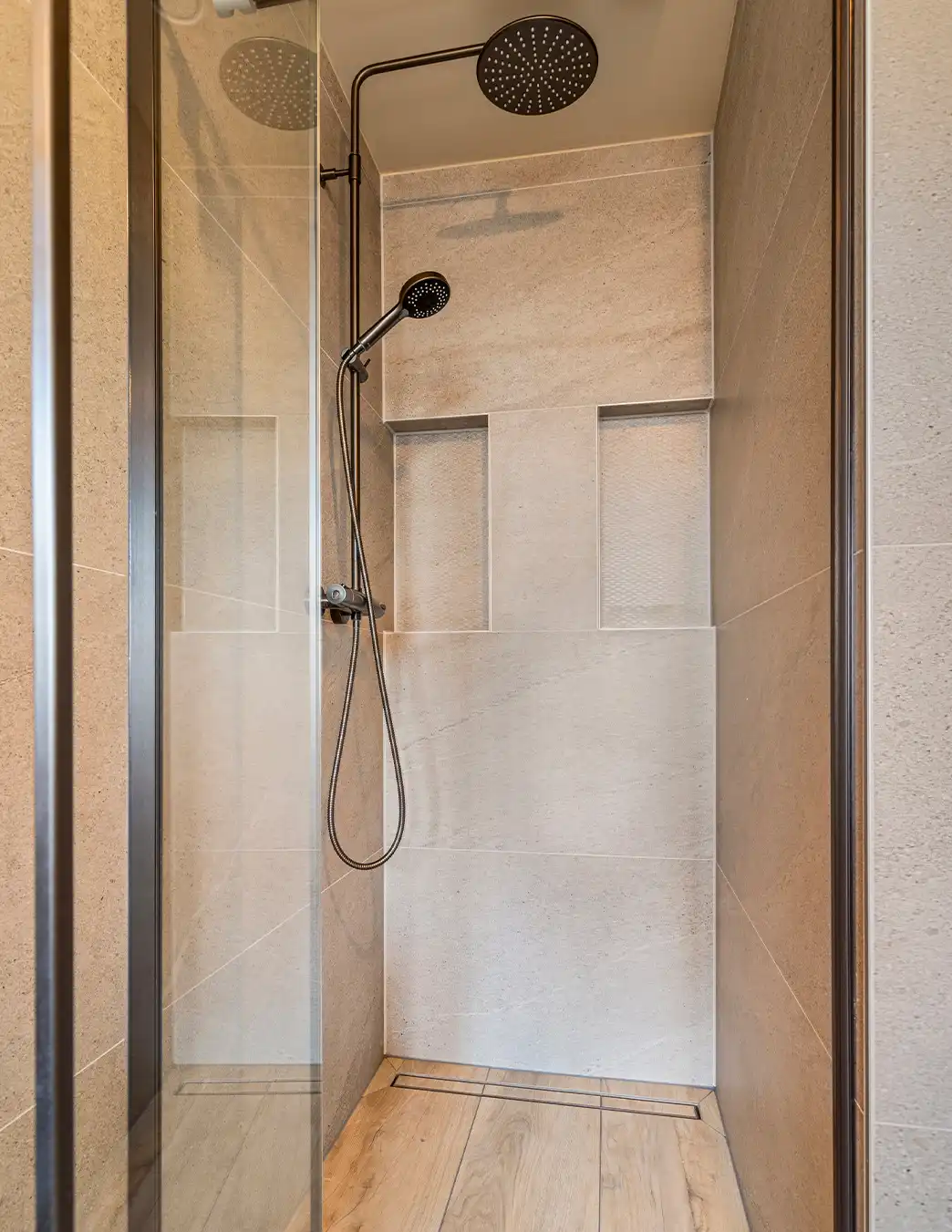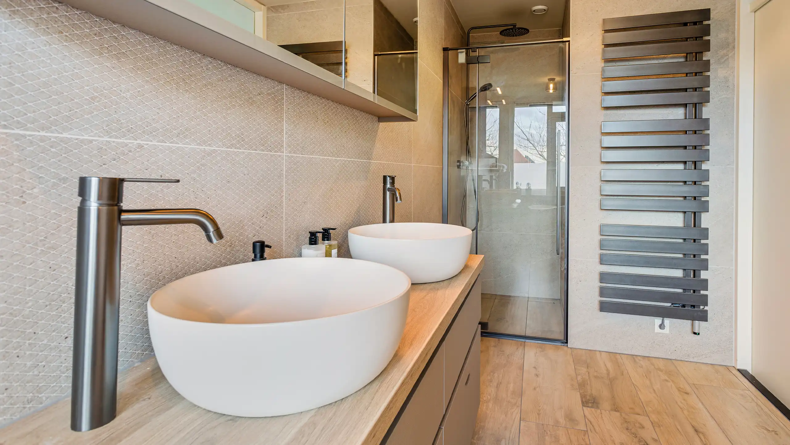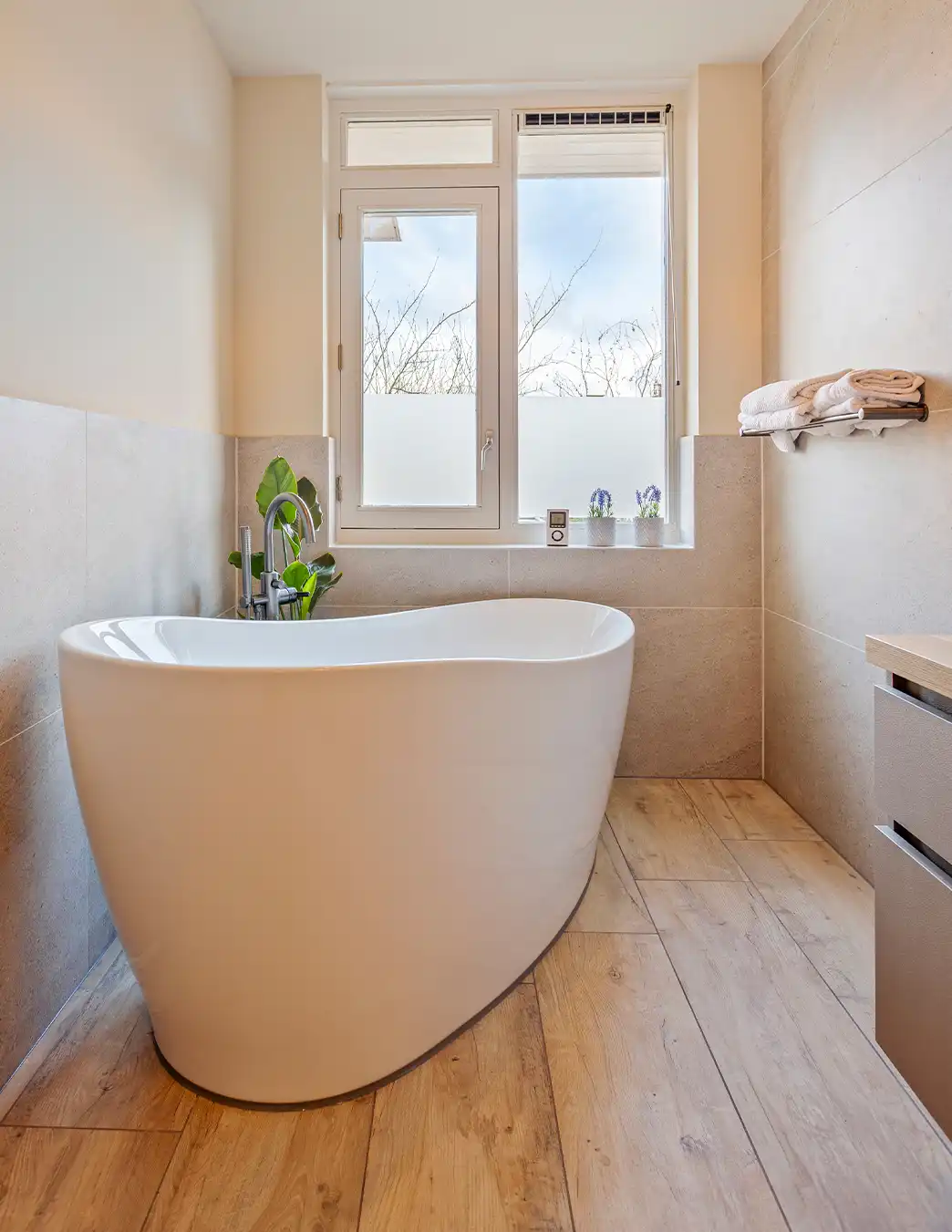 Deze moderne badkamer in Scandinavische stijl straalt rust en comfort uit door de combinatie van zachte zandtinten en warme houtaccenten. Het vrijstaande ligbad vormt een uitnodigend middelpunt, terwijl het houten wastafelmeubel met dubbele waskommen zorgt voor een evenwichtige en functionele indeling. De inloopdouche met nis en donkere regendouche voegt een subtiel contrast toe en maakt het geheel tot een serene en tijdloze badkamer.