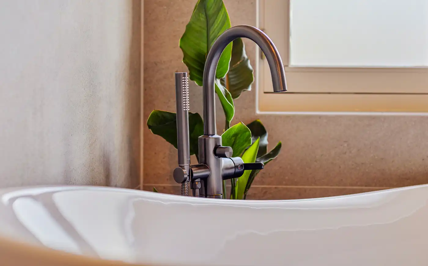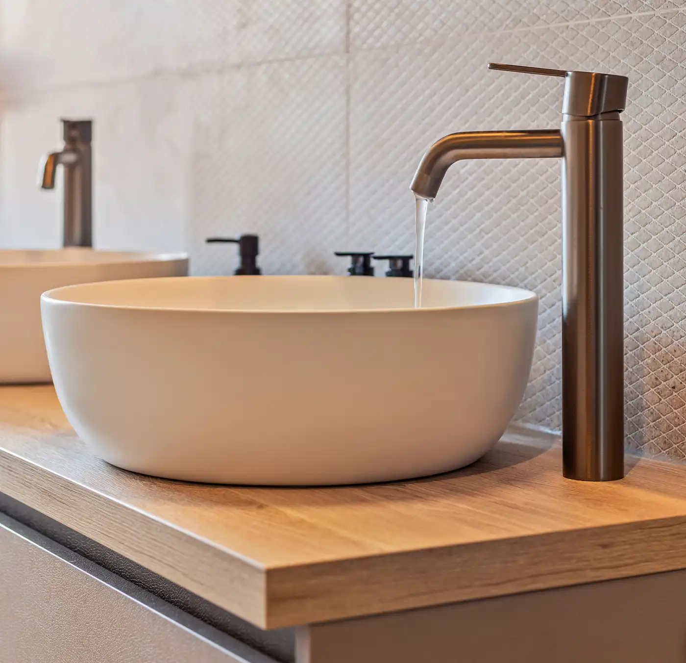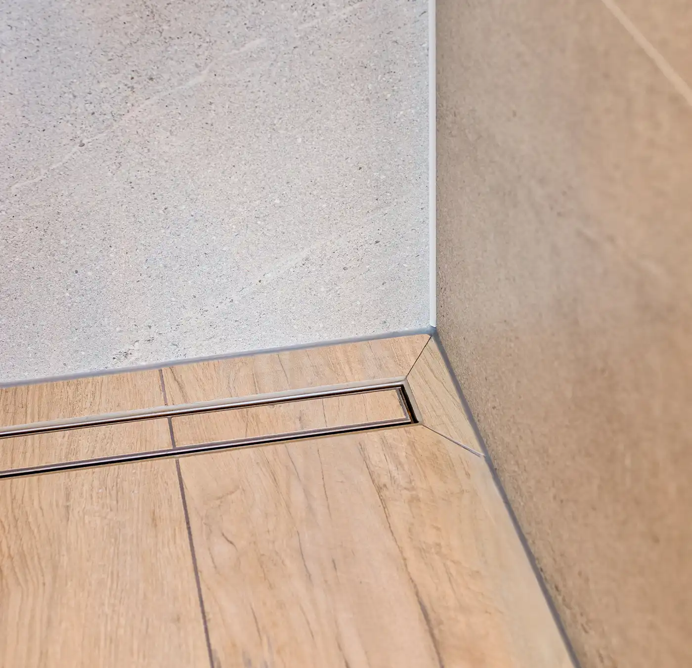 Deze moderne badkamer in Scandinavische stijl straalt rust en comfort uit door de combinatie van zachte zandtinten en warme houtaccenten. Het vrijstaande ligbad vormt een uitnodigend middelpunt, terwijl het houten wastafelmeubel met dubbele waskommen zorgt voor een evenwichtige en functionele indeling. De inloopdouche met nis en donkere regendouche voegt een subtiel contrast toe en maakt het geheel tot een serene en tijdloze badkamer.