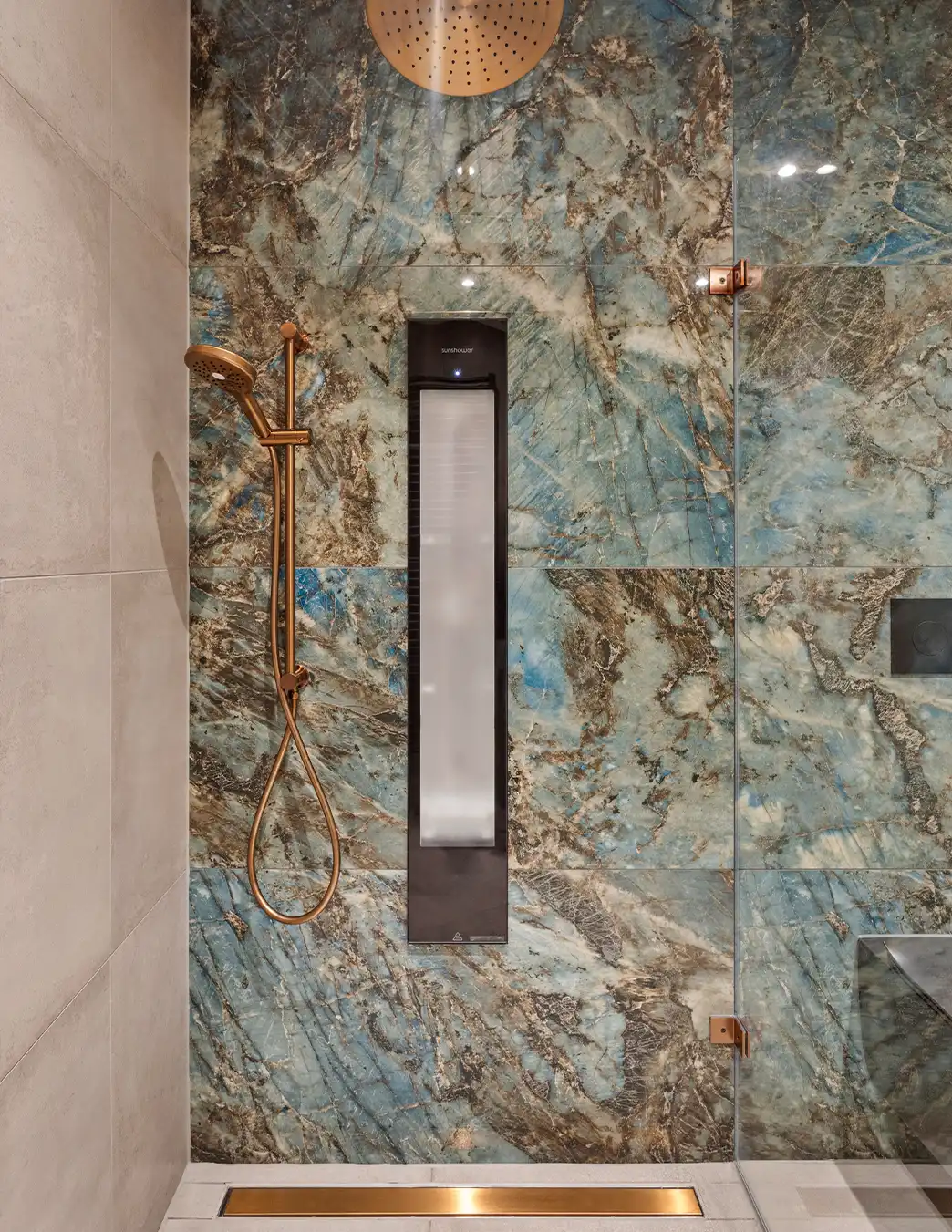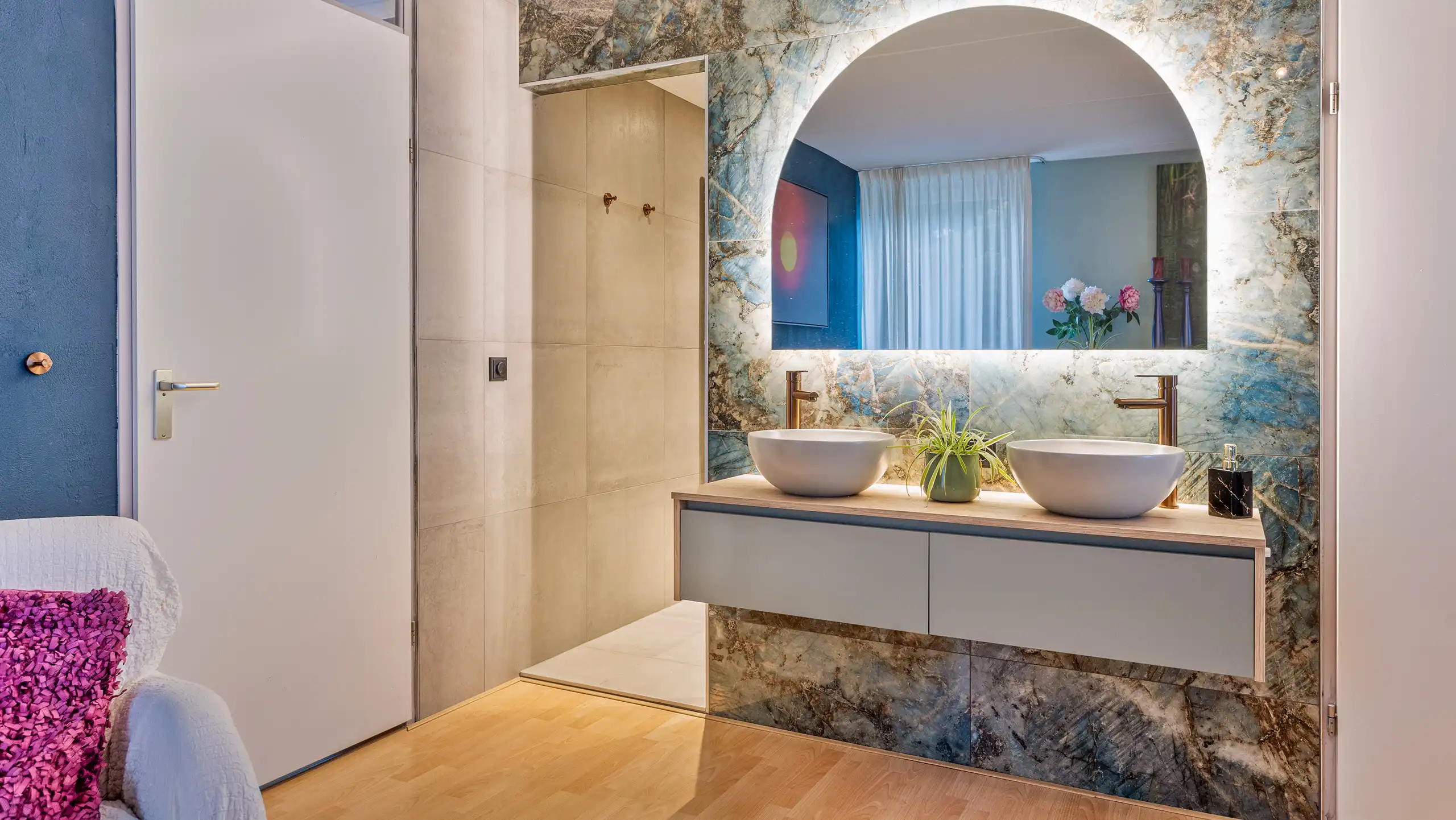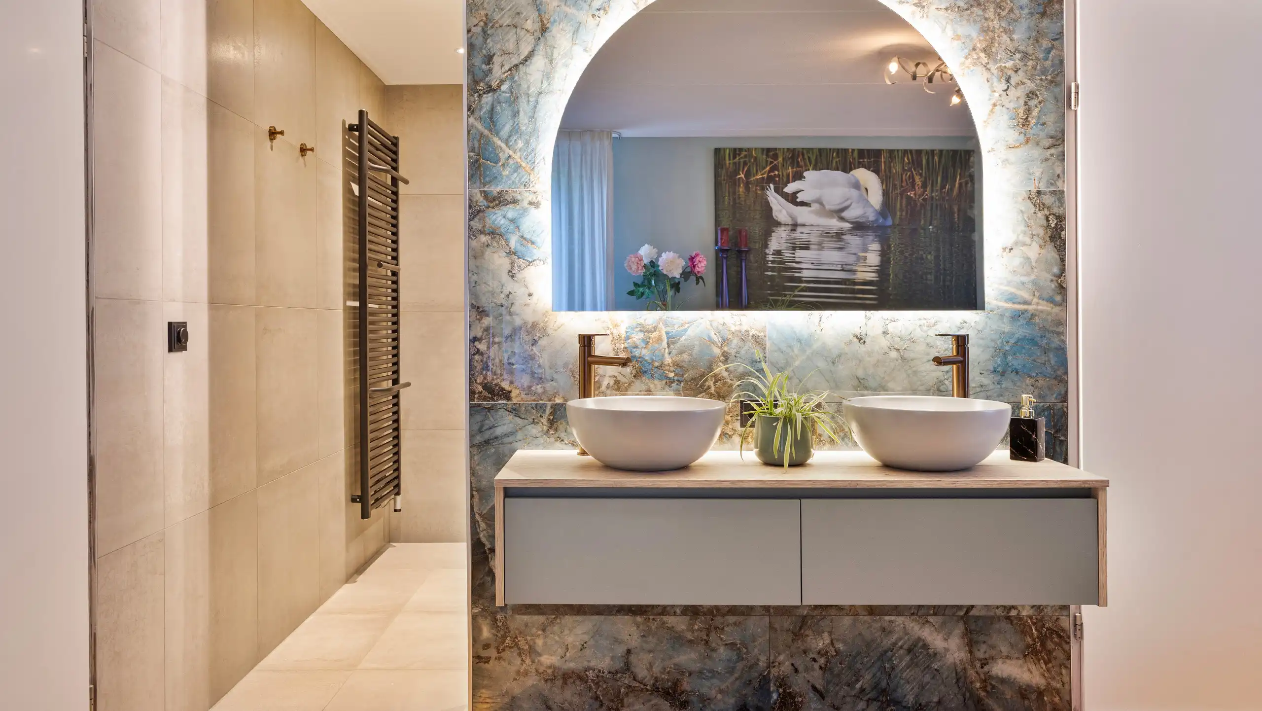 Deze luxe badkamer valt direct op door de combinatie van expressieve marmerlook tegels in blauwgroene tinten en rustige zandkleurige wanden. Het zwevende wastafelmeubel met houten blad en dubbele waskommen vormt een stijlvol geheel met de grote, boogvormige spiegel die de ruimte extra diepte geeft. In de ruime inloopdouche zorgen de warme koperen accenten en het verlichte douchepaneel voor een hotelachtige sfeer waarin comfort en design perfect samenkomen.