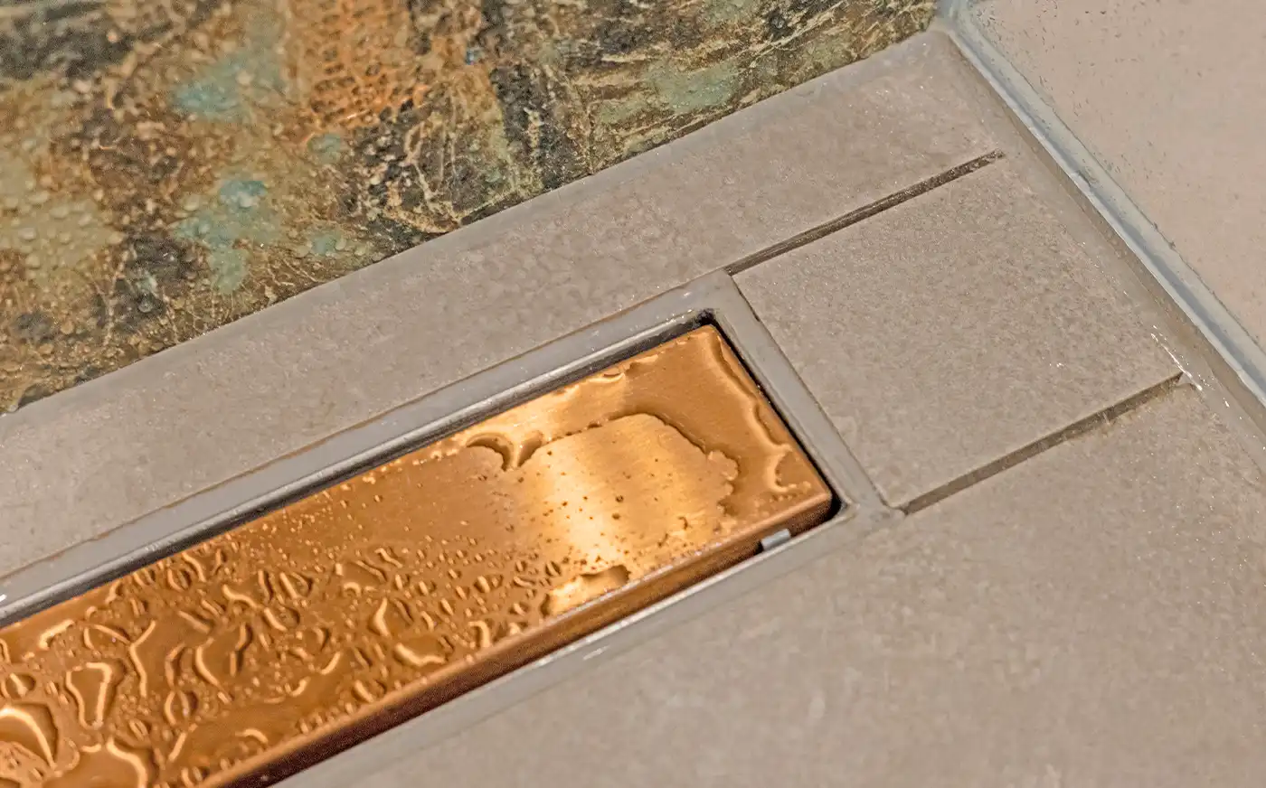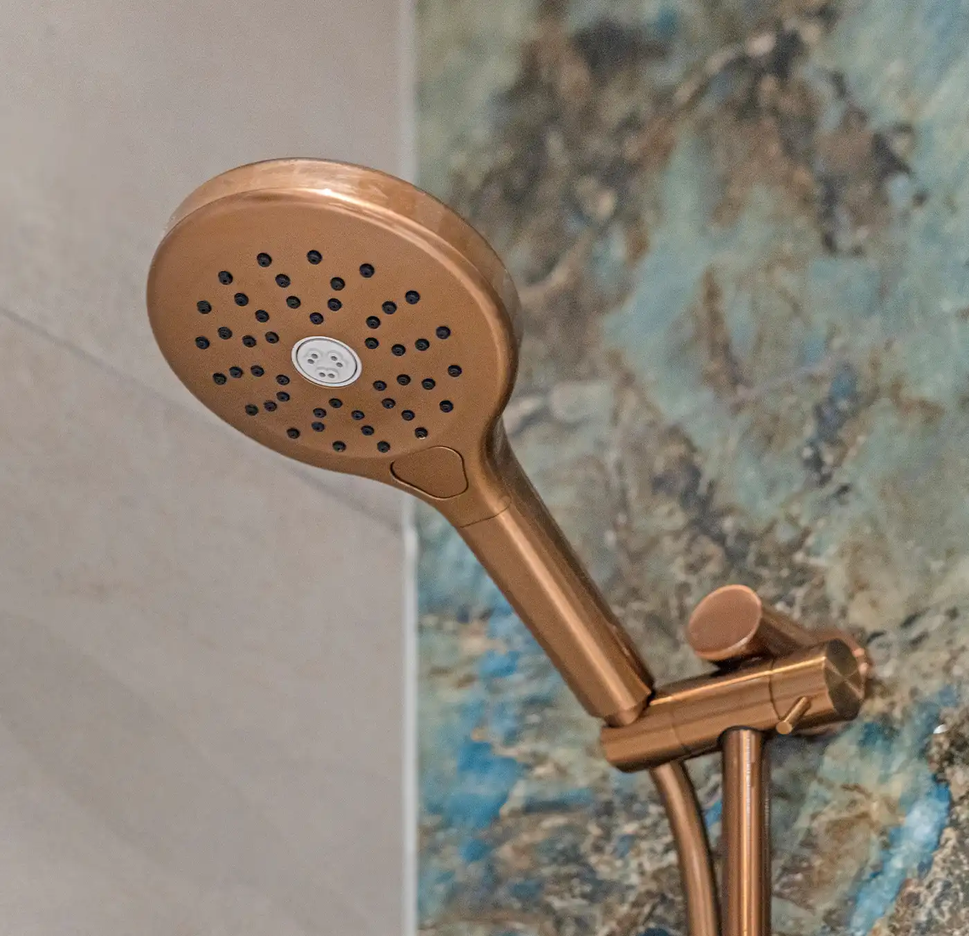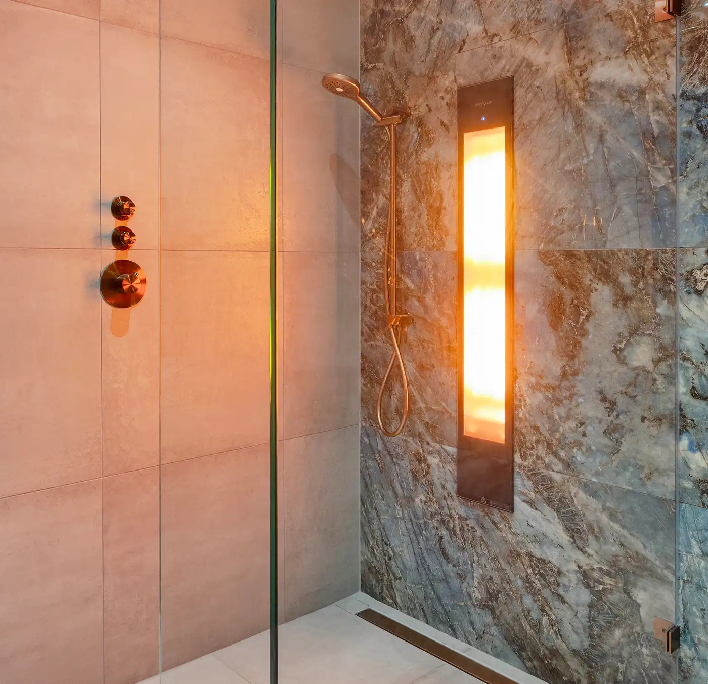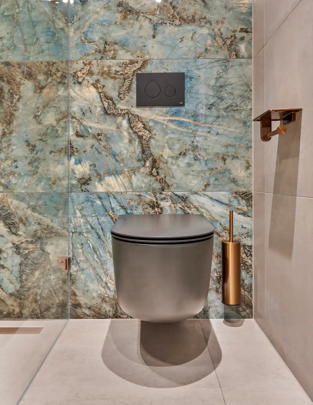 Deze luxe badkamer valt direct op door de combinatie van expressieve marmerlook tegels in blauwgroene tinten en rustige zandkleurige wanden. Het zwevende wastafelmeubel met houten blad en dubbele waskommen vormt een stijlvol geheel met de grote, boogvormige spiegel die de ruimte extra diepte geeft. In de ruime inloopdouche zorgen de warme koperen accenten en het verlichte douchepaneel voor een hotelachtige sfeer waarin comfort en design perfect samenkomen.