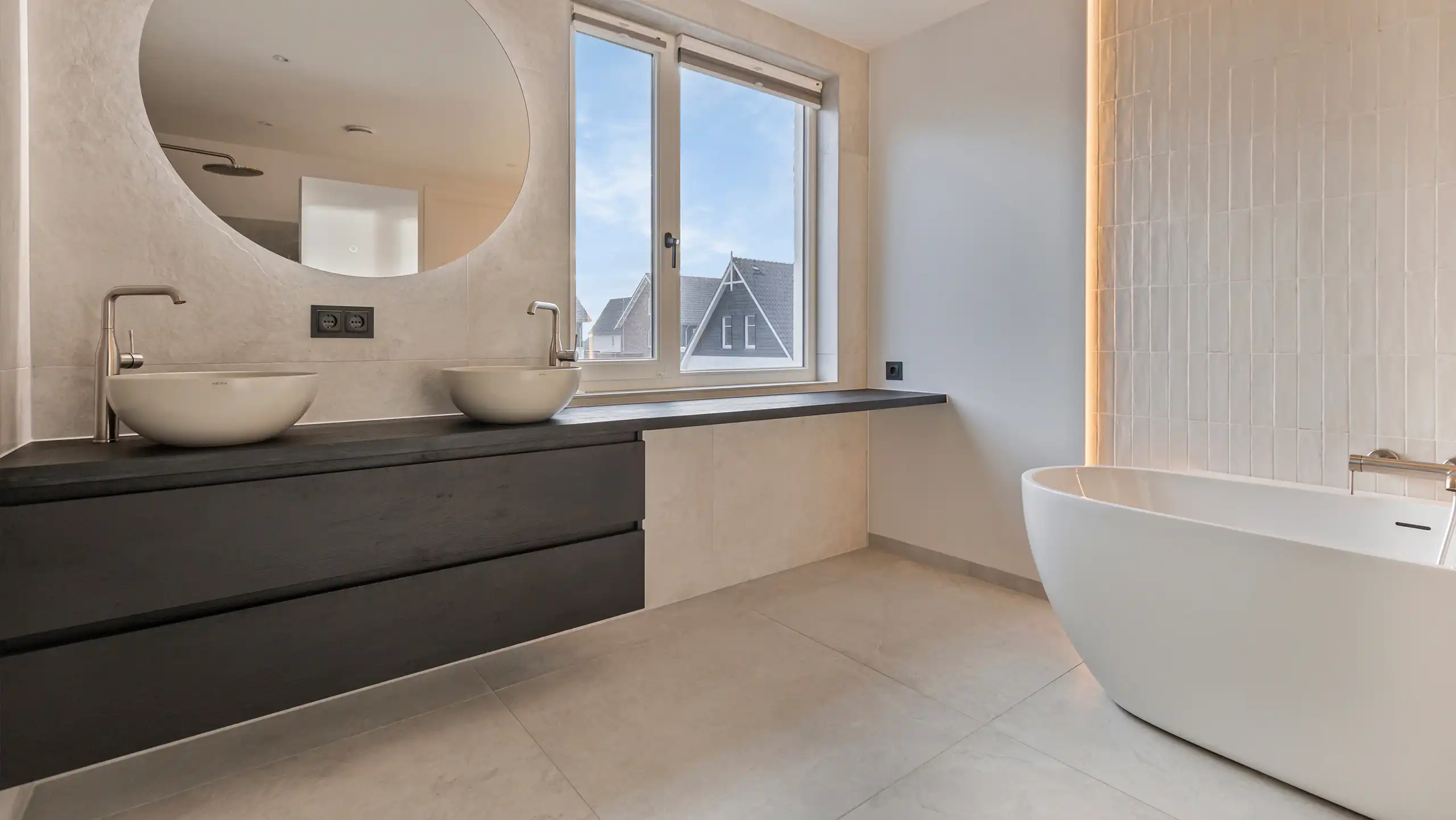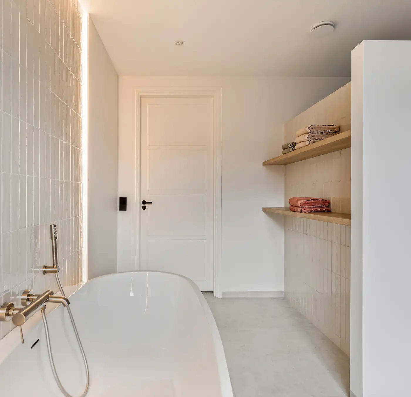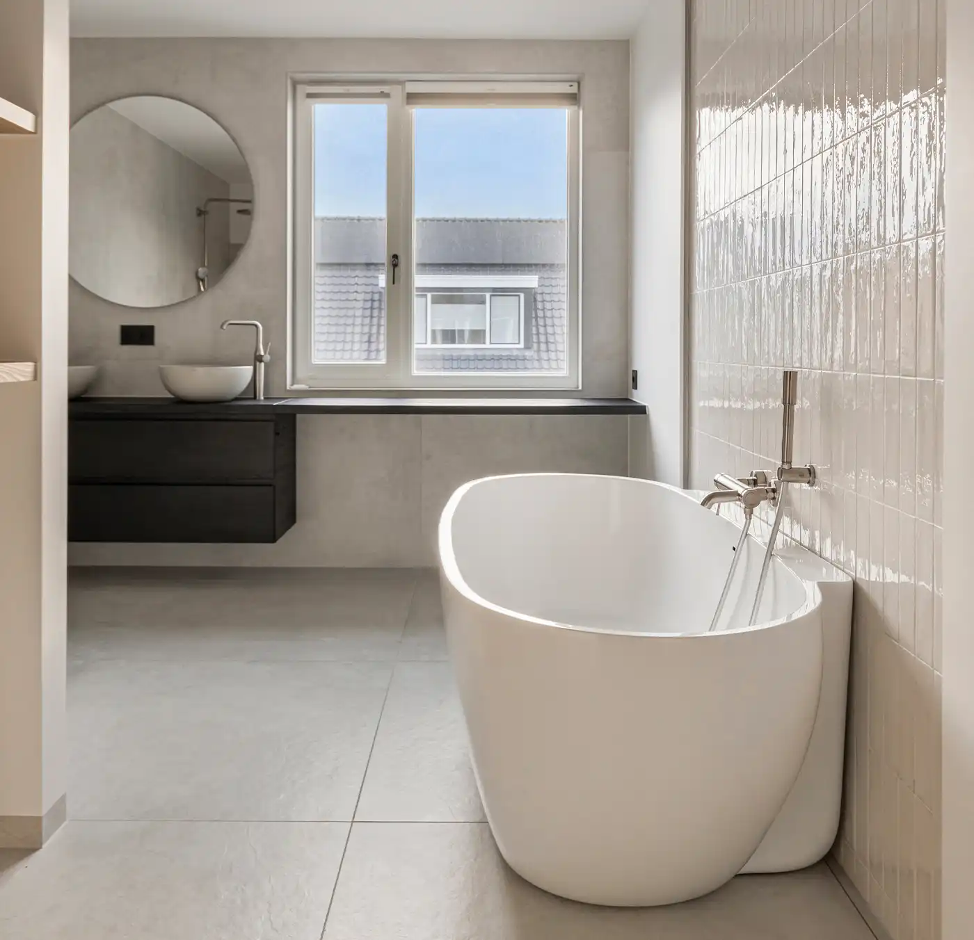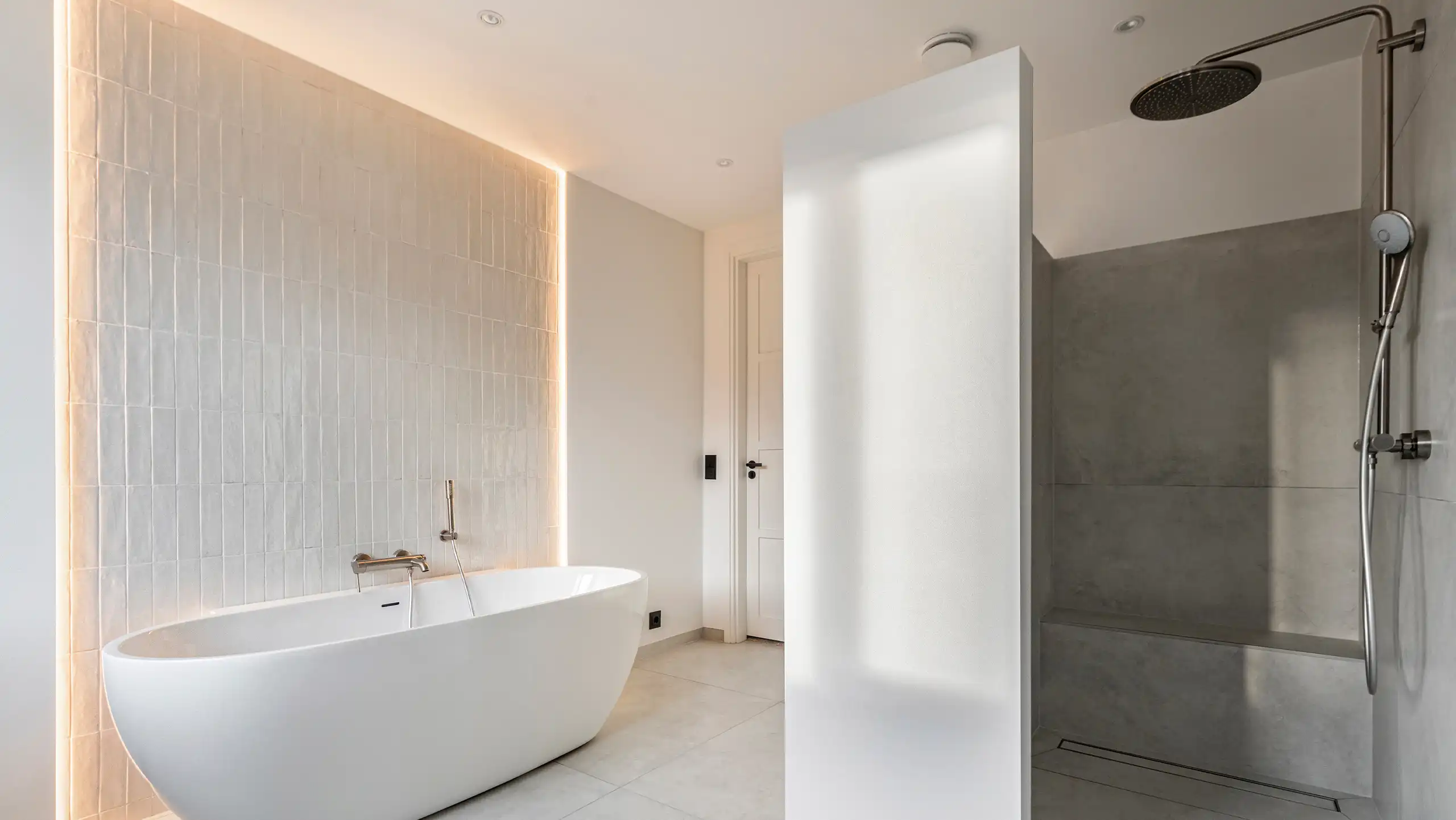Deze moderne badkamer kenmerkt zich door een lichte en serene uitstraling dankzij het gebruik van zachte off-white en lichtgrijze tinten. De wandtegels met een subtiele structuur vormen een verfijnd geheel met de strakke vloertegels en versterken het rustige karakter van de ruimte. Het vrijstaande ligbad fungeert als elegante blikvanger, terwijl de inloopdouche met regendouche en ingetogen kranen zorgt voor comfort en functionaliteit in een minimalistisch ontwerp.