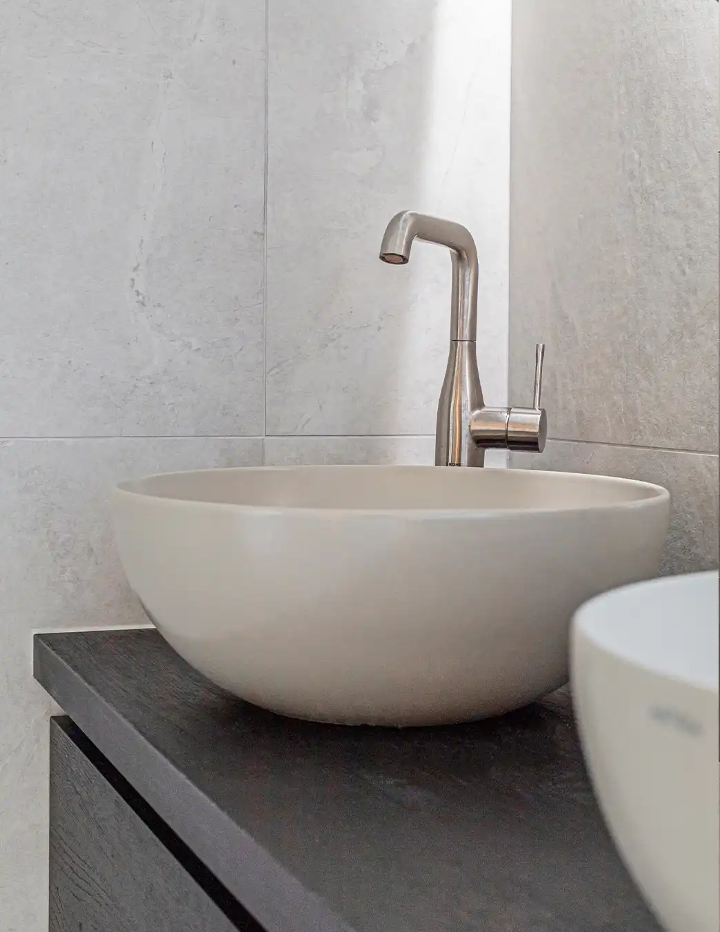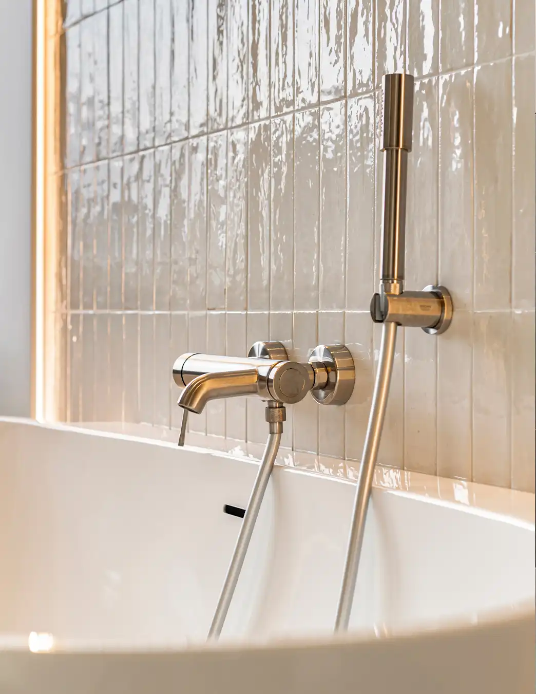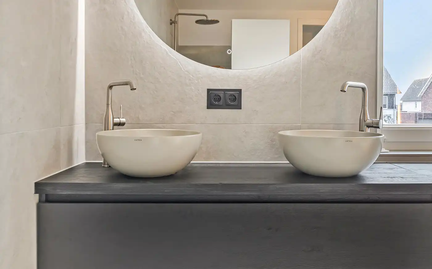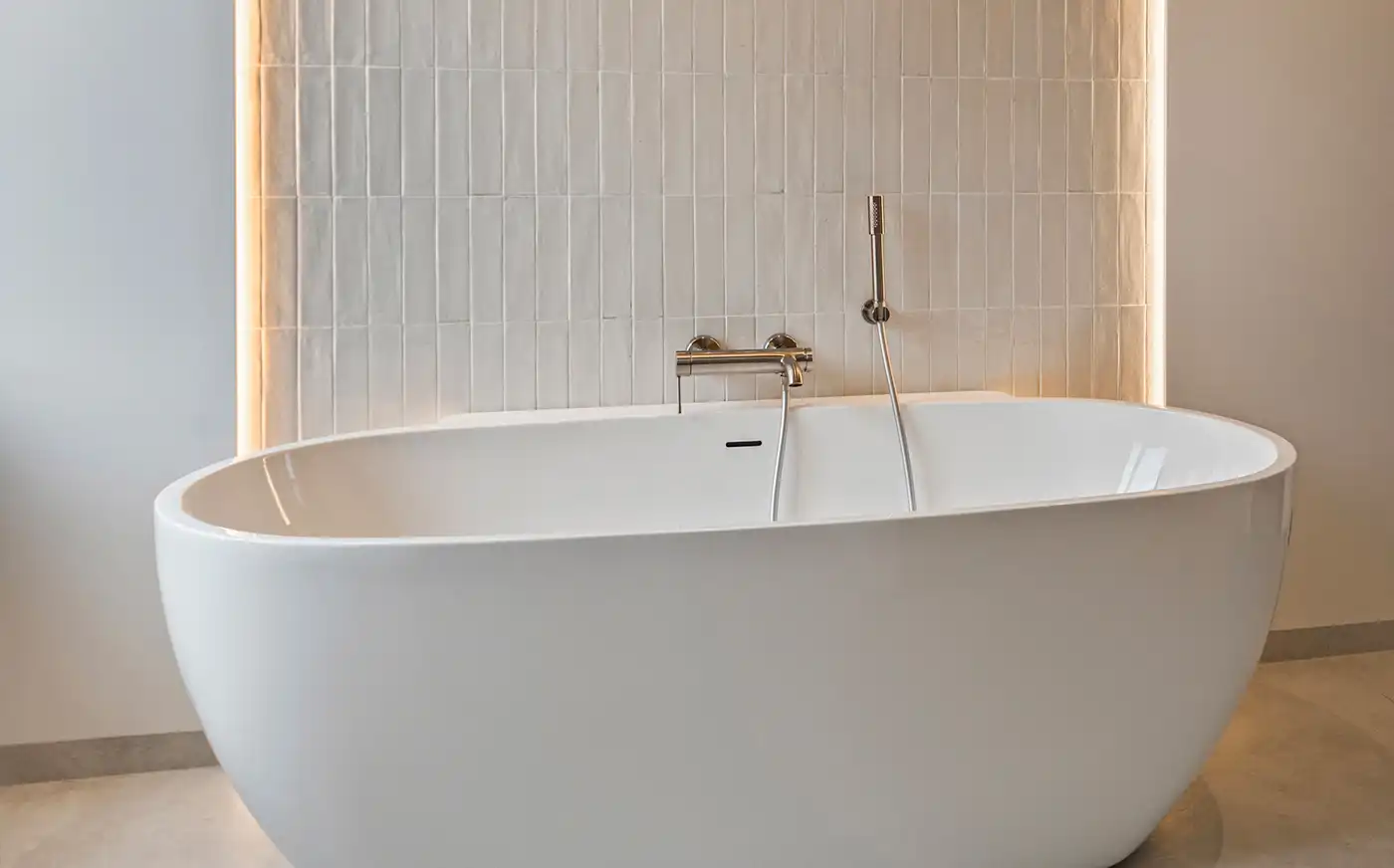 Deze moderne badkamer kenmerkt zich door een lichte en serene uitstraling dankzij het gebruik van zachte off-white en lichtgrijze tinten. De wandtegels met een subtiele structuur vormen een verfijnd geheel met de strakke vloertegels en versterken het rustige karakter van de ruimte. Het vrijstaande ligbad fungeert als elegante blikvanger, terwijl de inloopdouche met regendouche en ingetogen kranen zorgt voor comfort en functionaliteit in een minimalistisch ontwerp.
