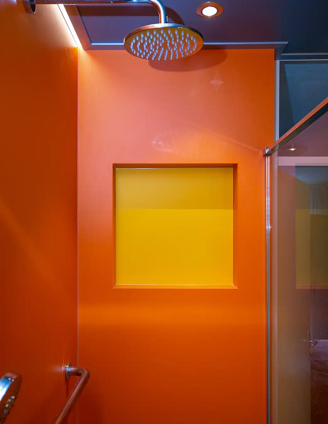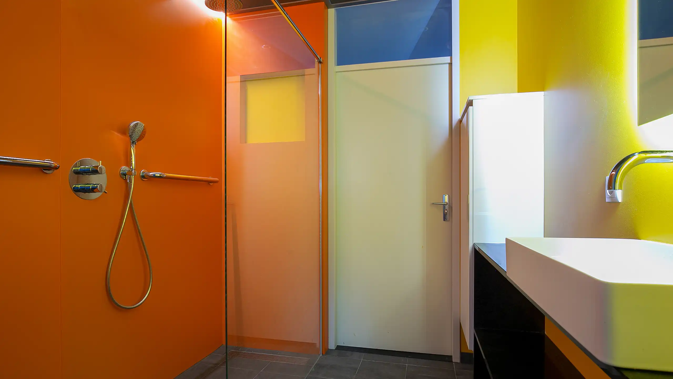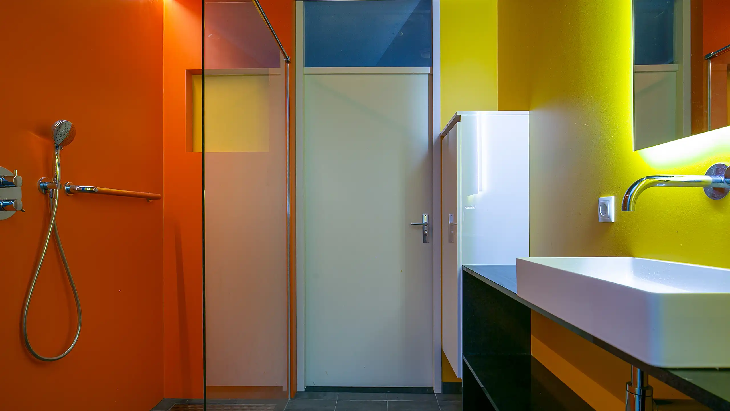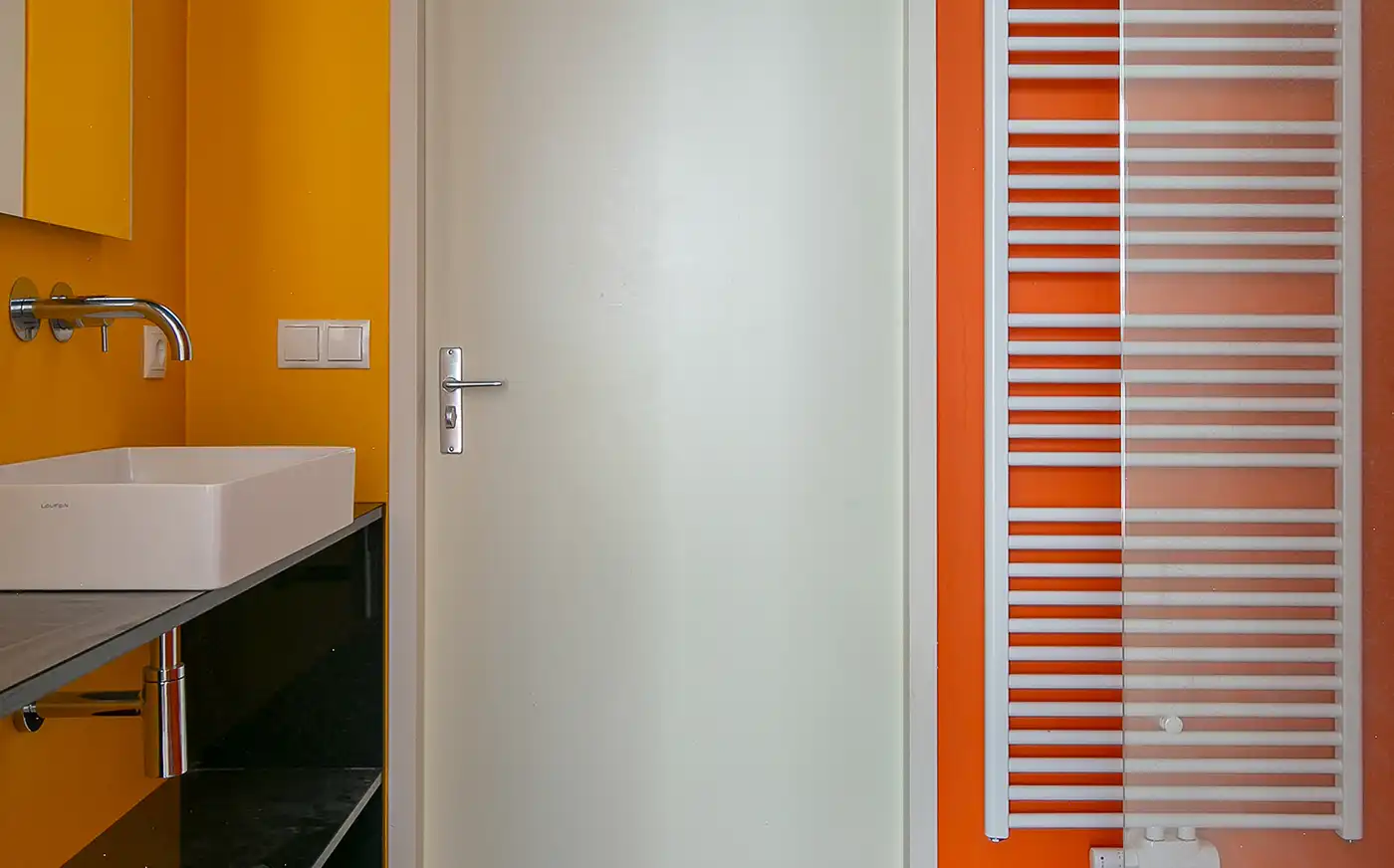 Deze badkamer is een echte blikvanger dankzij het gebruik van toffe, felle kleuren die meteen een vrolijke en speelse sfeer neerzetten. De levendige tinten op de wanden geven de ruimte energie en maken dat deze badkamer veel leuker aanvoelt dan een neutrale uitvoering. Er is bewust gekozen voor twee krachtige, vrolijke kleuren die elkaar perfect aanvullen en zorgen voor een frisse, moderne uitstraling. Om de kleuren optimaal tot hun recht te laten komen, is de rest van de inrichting zo rustig mogelijk gehouden. Strakke lijnen, een eenvoudige basis en een minimalistische afwerking zorgen voor balans en voorkomen dat het geheel te druk wordt.