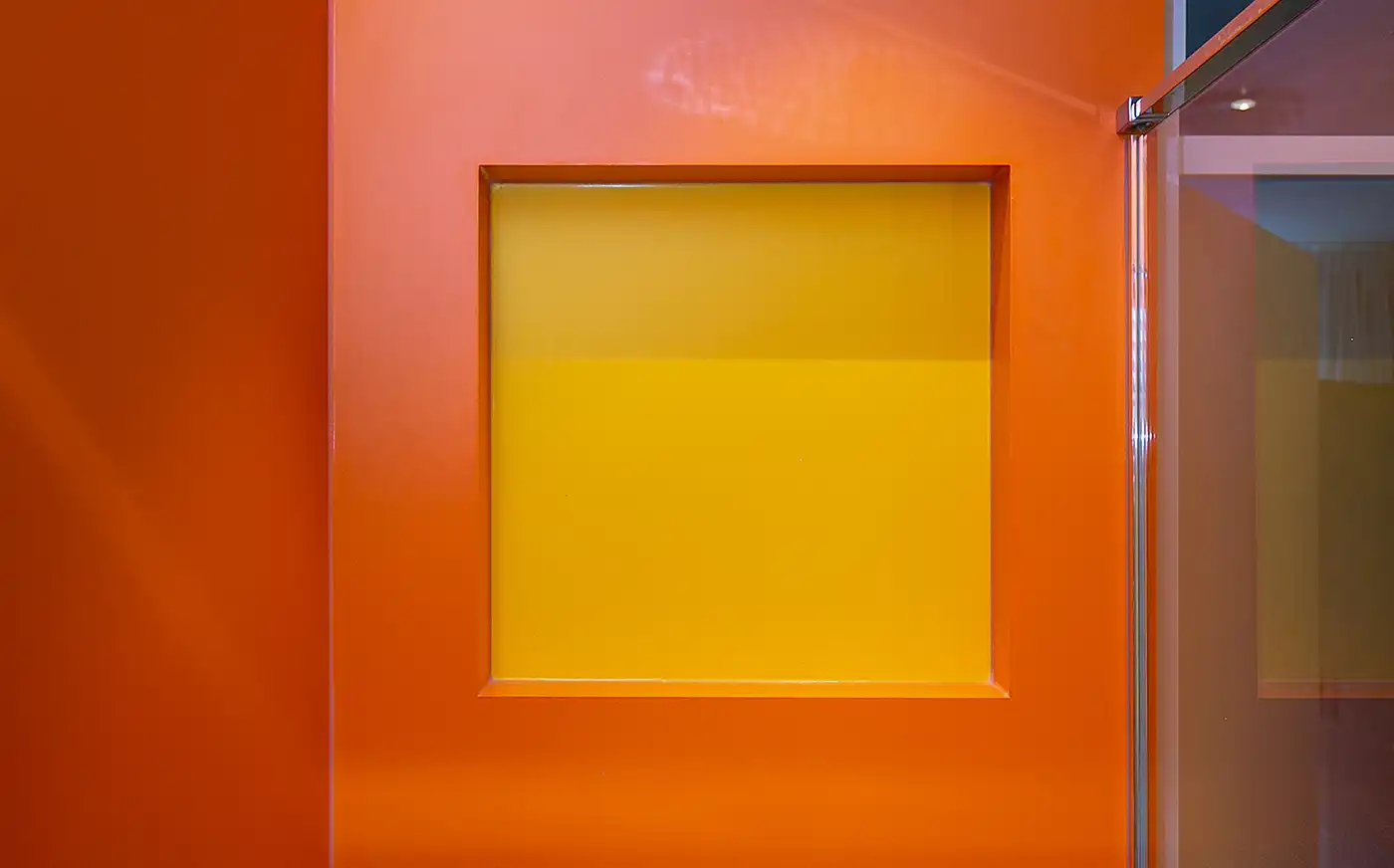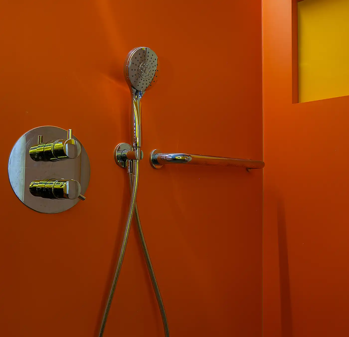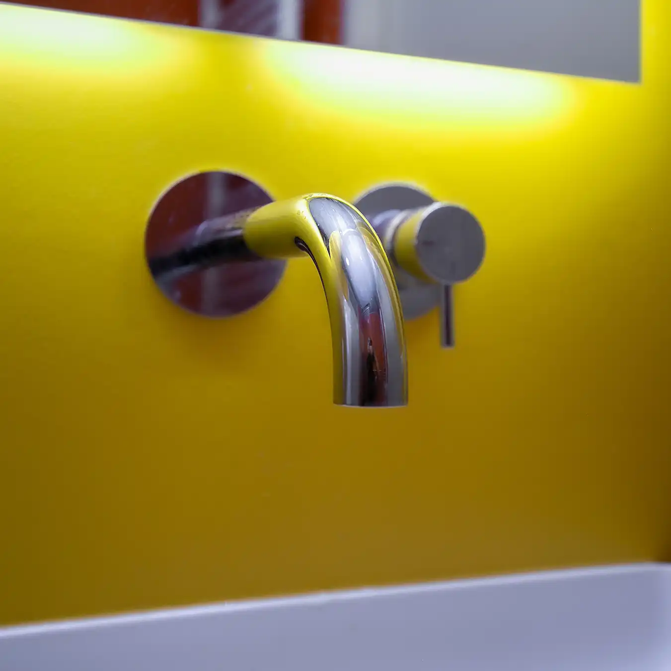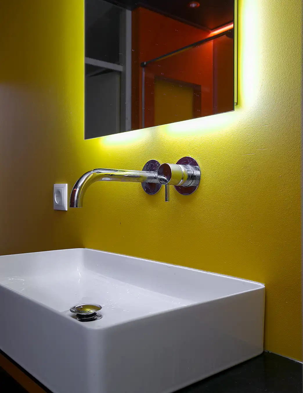 Deze badkamer is een echte blikvanger dankzij het gebruik van toffe, felle kleuren die meteen een vrolijke en speelse sfeer neerzetten. De levendige tinten op de wanden geven de ruimte energie en maken dat deze badkamer veel leuker aanvoelt dan een neutrale uitvoering. Er is bewust gekozen voor twee krachtige, vrolijke kleuren die elkaar perfect aanvullen en zorgen voor een frisse, moderne uitstraling. Om de kleuren optimaal tot hun recht te laten komen, is de rest van de inrichting zo rustig mogelijk gehouden. Strakke lijnen, een eenvoudige basis en een minimalistische afwerking zorgen voor balans en voorkomen dat het geheel te druk wordt.