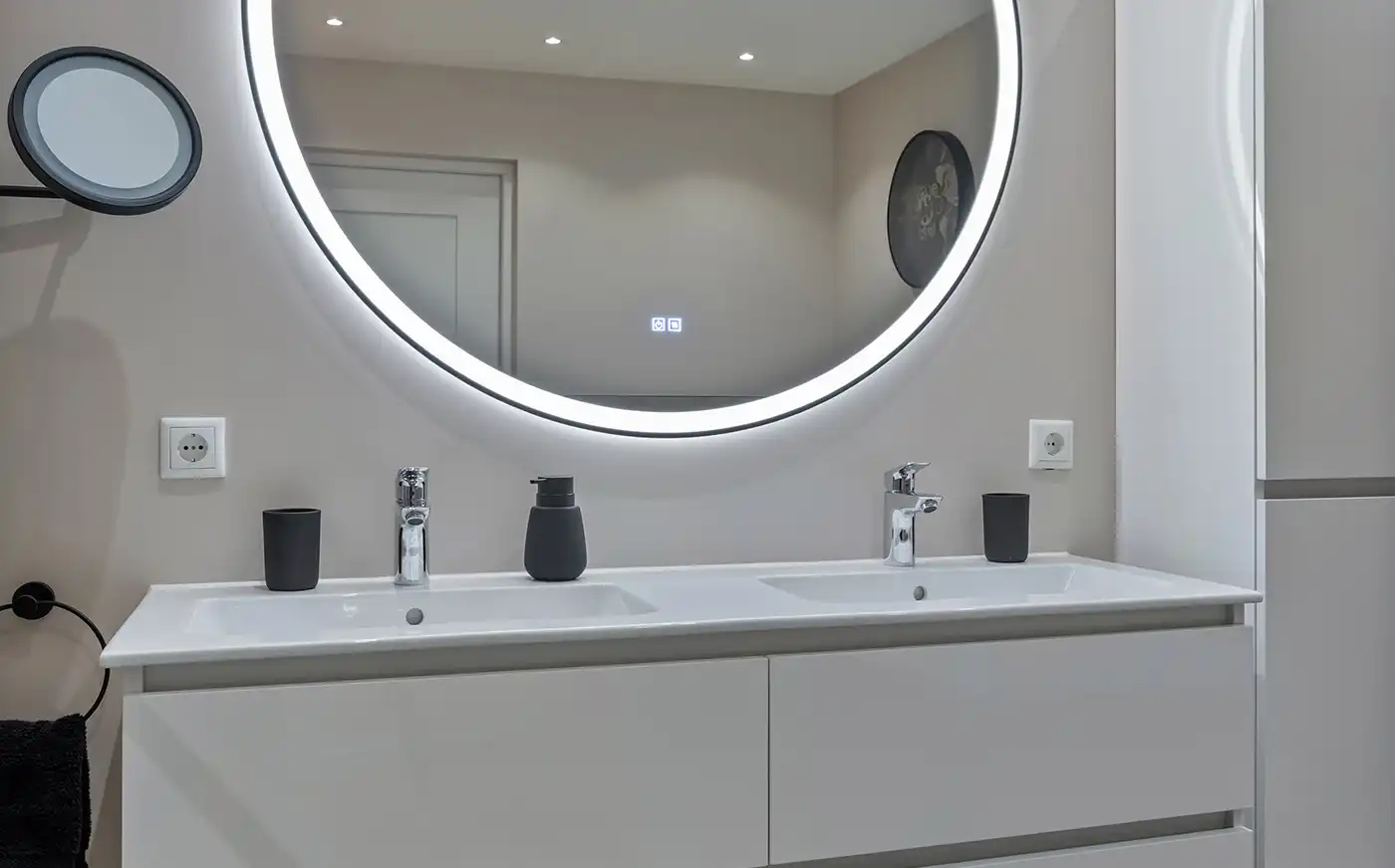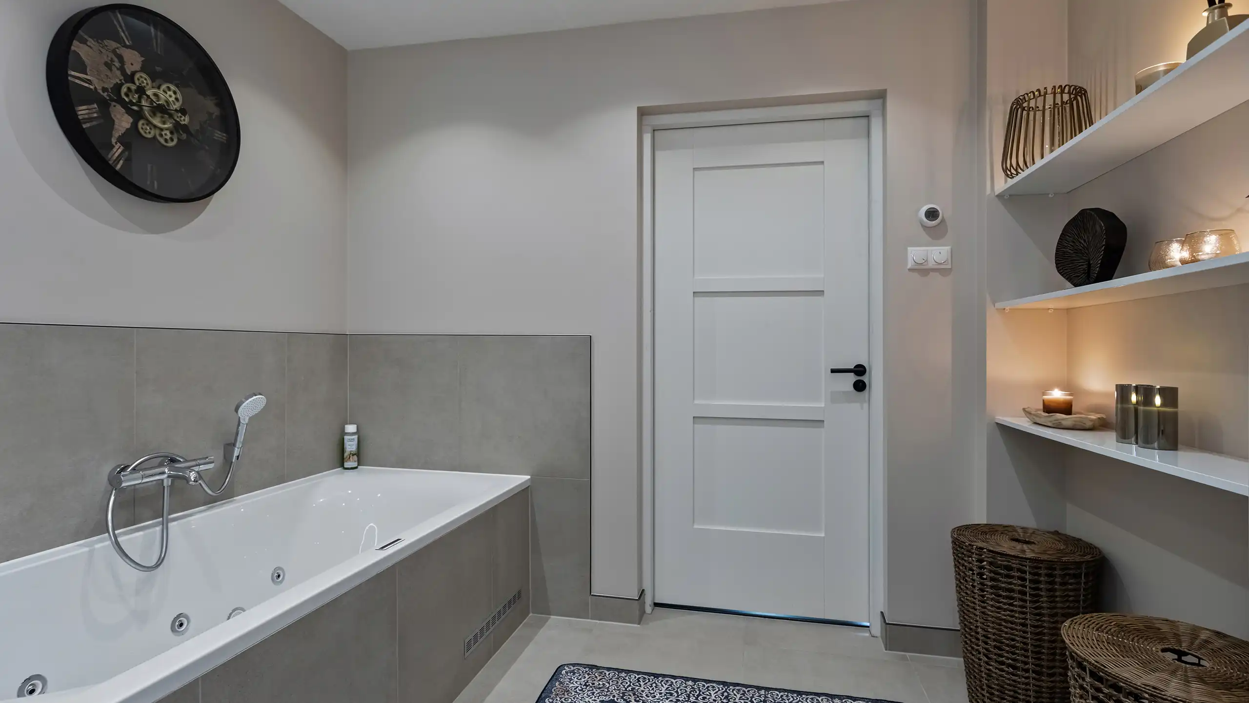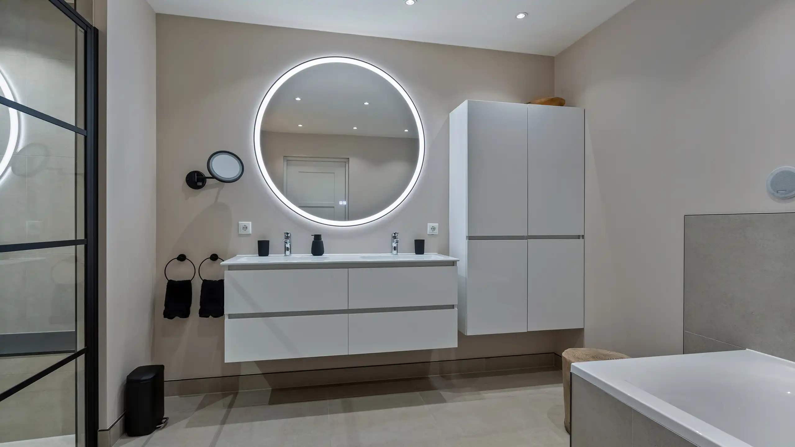 In deze moderne badkamer staan rust en comfort centraal. Het ontwerp combineert zachte zandtinten met strakke lijnen en zorgt zo voor een uitgebalanceerde uitstraling. Het zwevende wastafelmeubel met ronde spiegel en geïntegreerde verlichting geeft de ruimte een minimalistisch karakter, terwijl de ruime inloopdouche met zitbank, infraroodsauna en regendouche zorgen voor een gevoel van wellness. Het ligbad en de subtiele accessoires maken het geheel compleet.