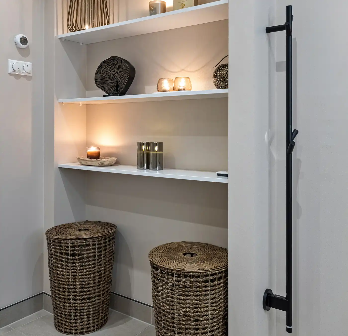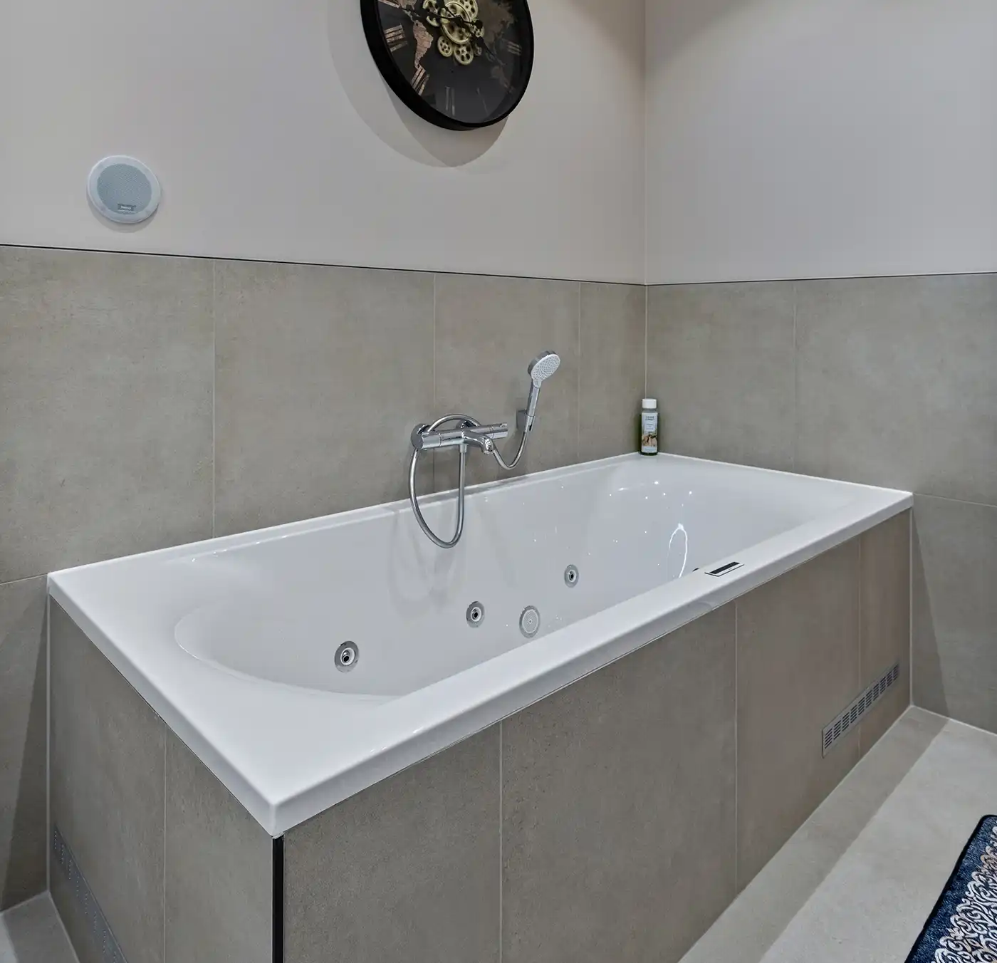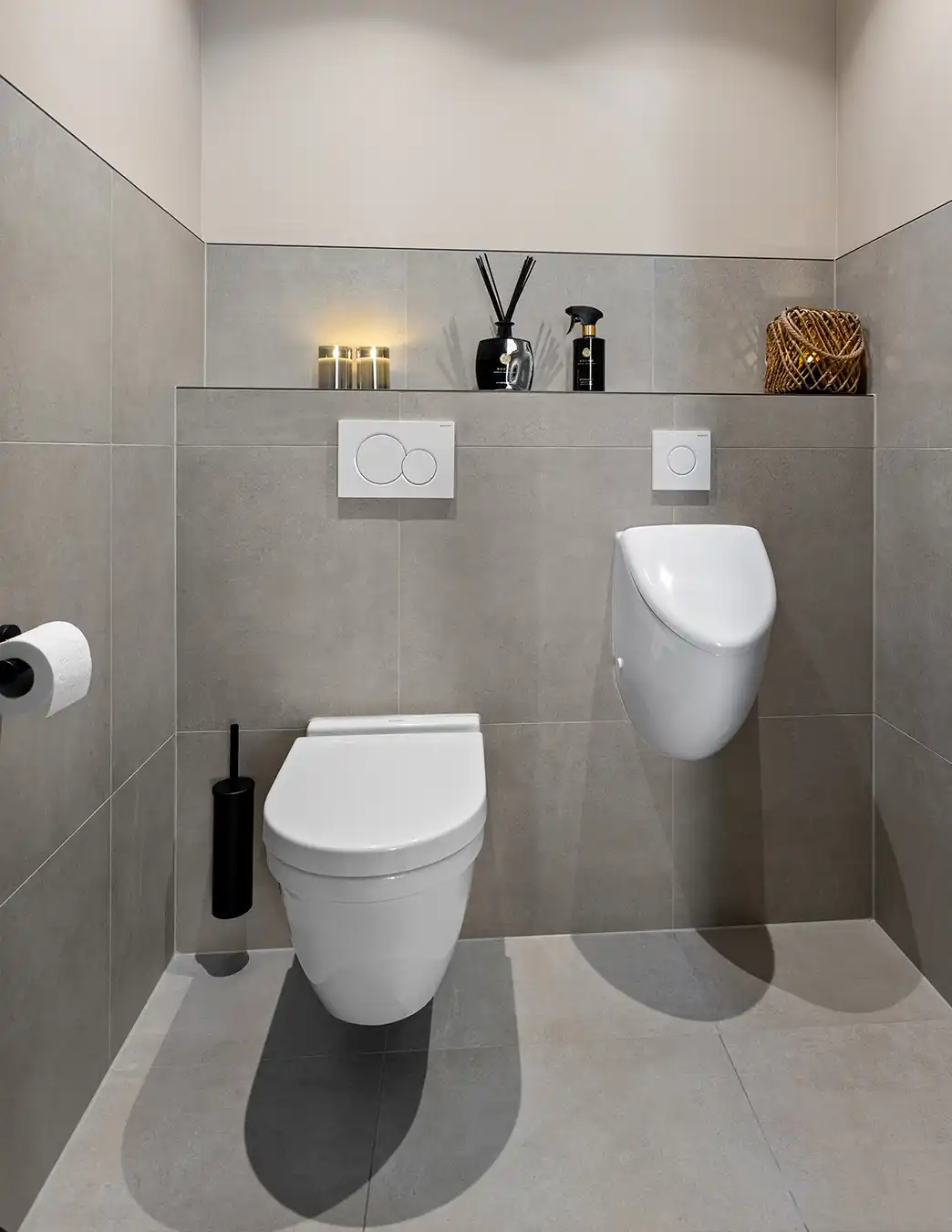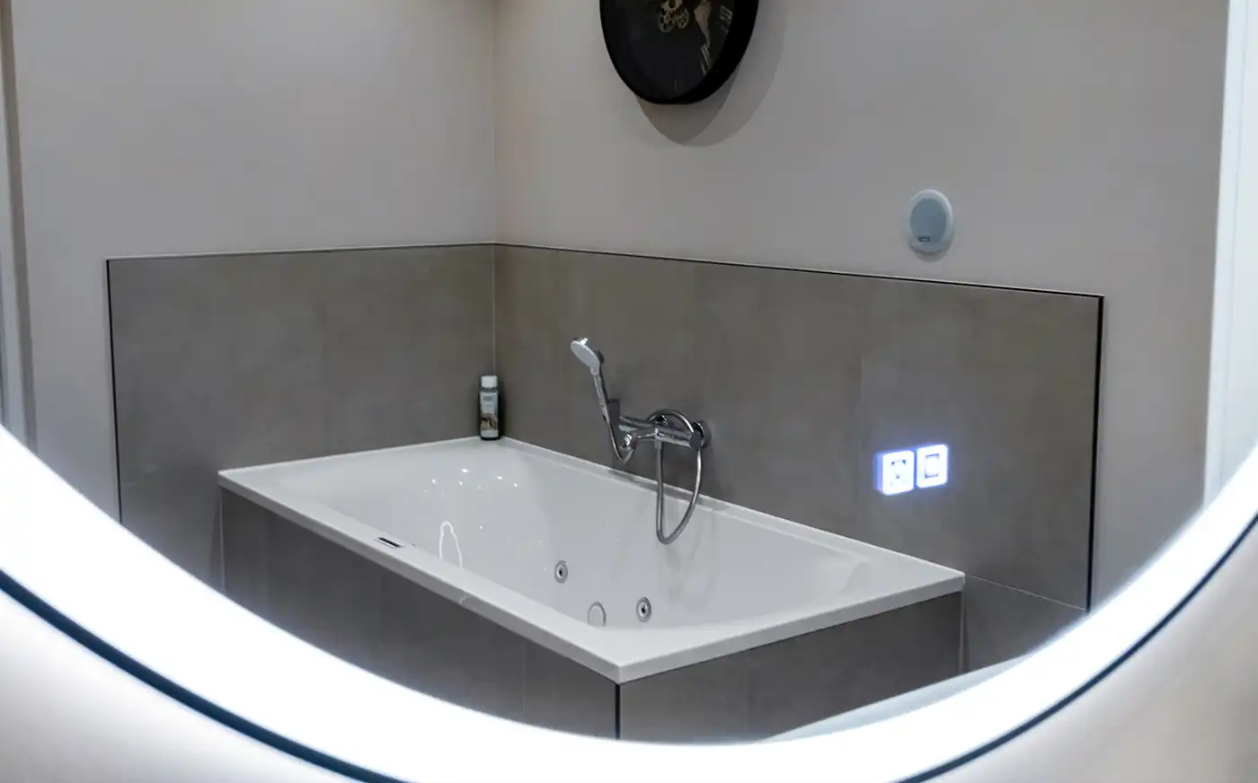 In deze moderne badkamer staan rust en comfort centraal. Het ontwerp combineert zachte zandtinten met strakke lijnen en zorgt zo voor een uitgebalanceerde uitstraling. Het zwevende wastafelmeubel met ronde spiegel en geïntegreerde verlichting geeft de ruimte een minimalistisch karakter, terwijl de ruime inloopdouche met zitbank, infraroodsauna en regendouche zorgen voor een gevoel van wellness. Het ligbad en de subtiele accessoires maken het geheel compleet.