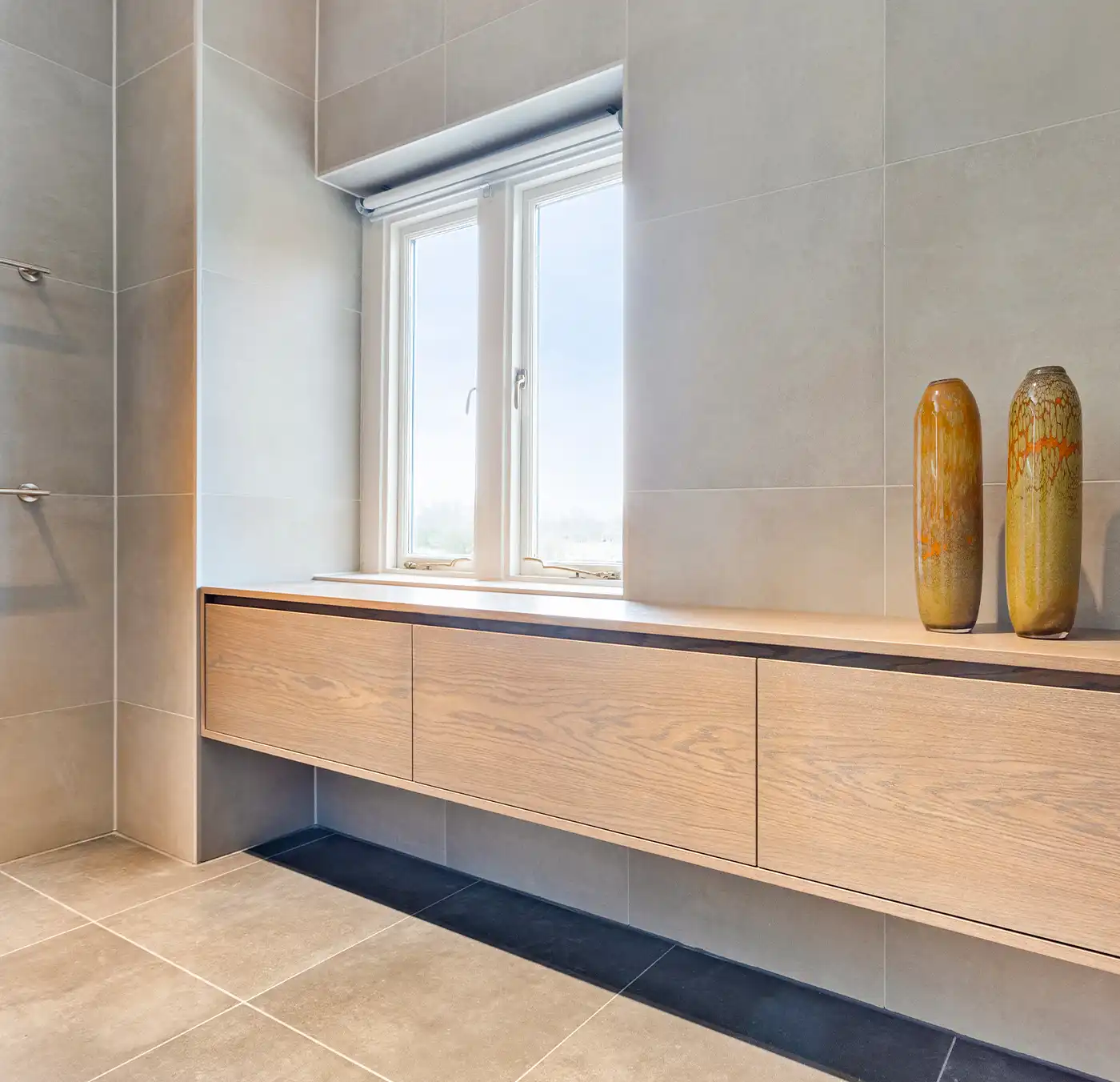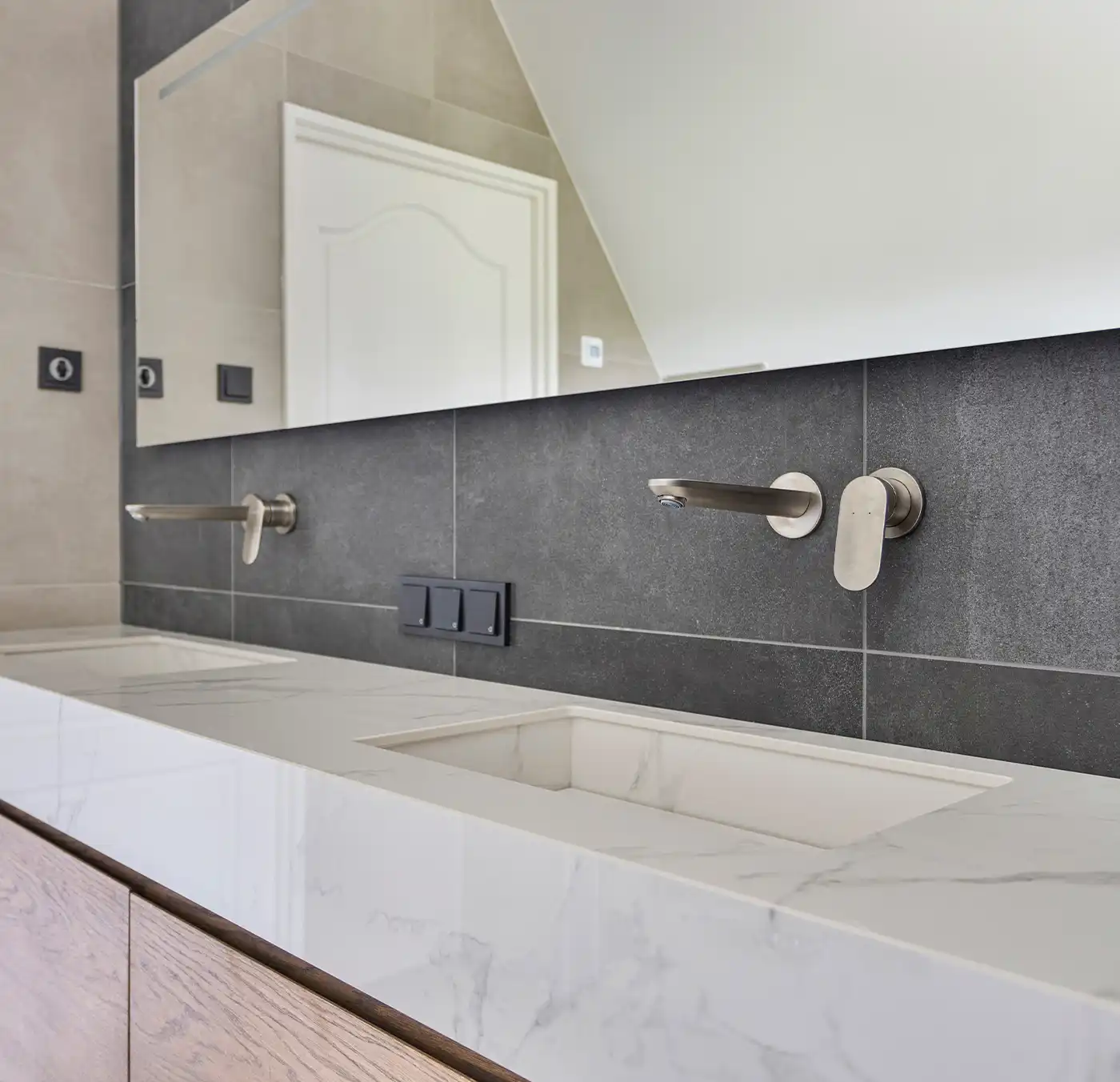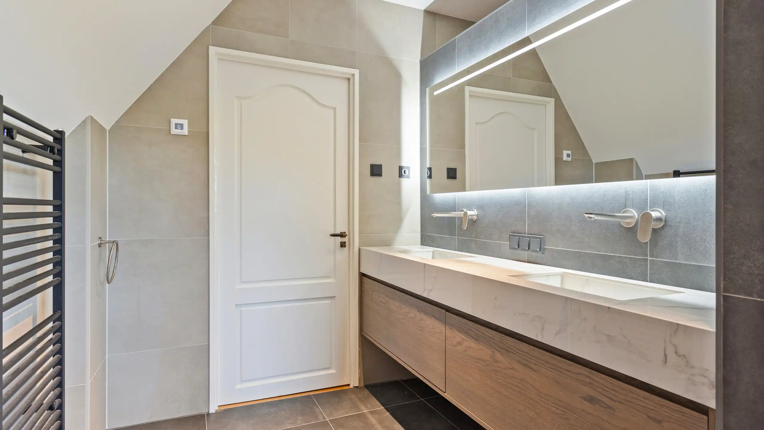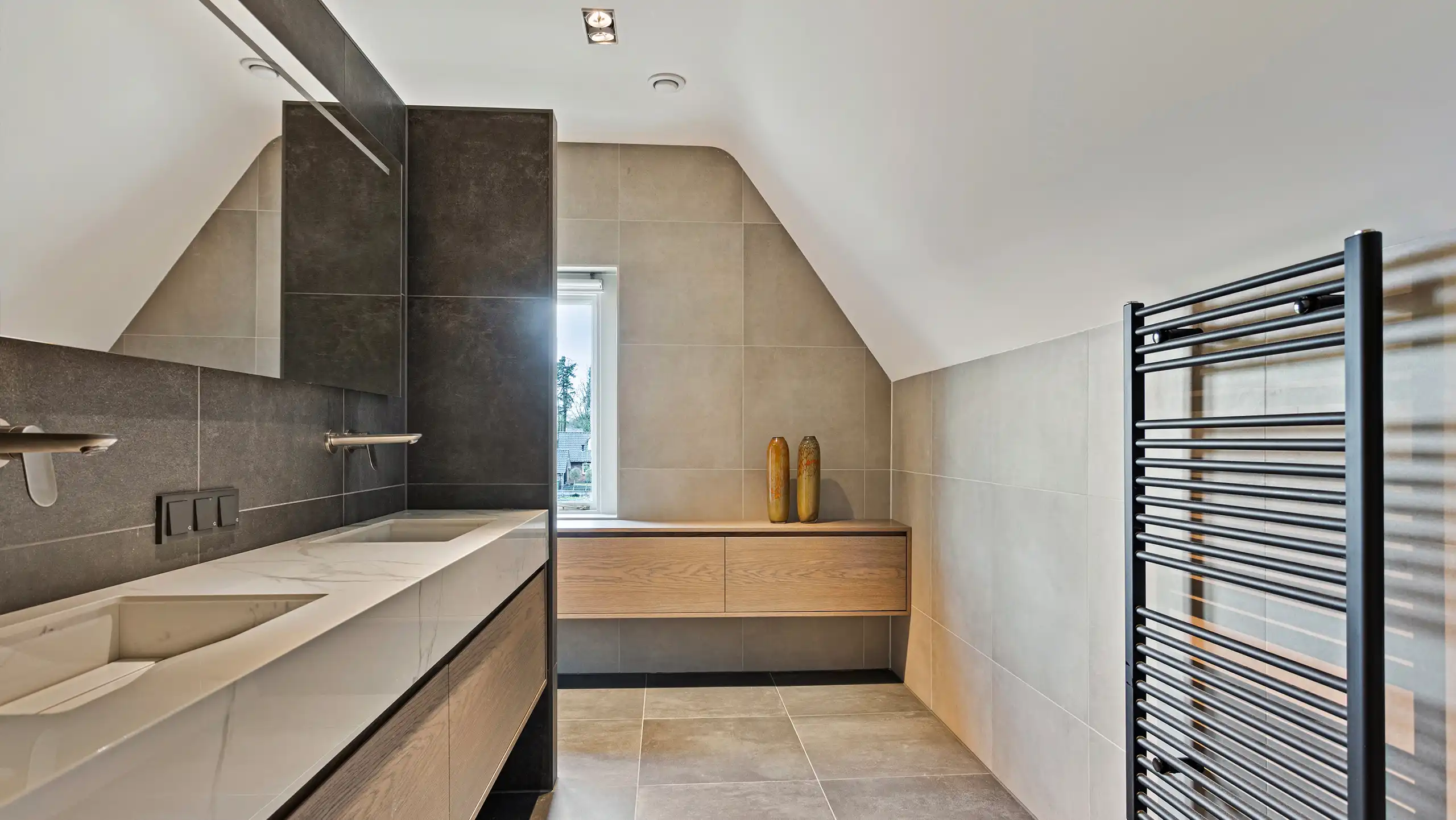 Deze moderne badkamer straalt rust en balans uit door de combinatie van zachte zand- en taupetinten met donkere accenten. Het lange houten maatwerkmeubel en het brede wastafelblad zorgen voor een strak en harmonieus geheel, terwijl de schuine lijnen van de ruimte het ontwerp karakter geven. De inloopdouche met natuursteenlook tegels en minimalistische kranen onderstreept het ingetogen karakter en maakt de badkamer comfortabel en tijdloos.