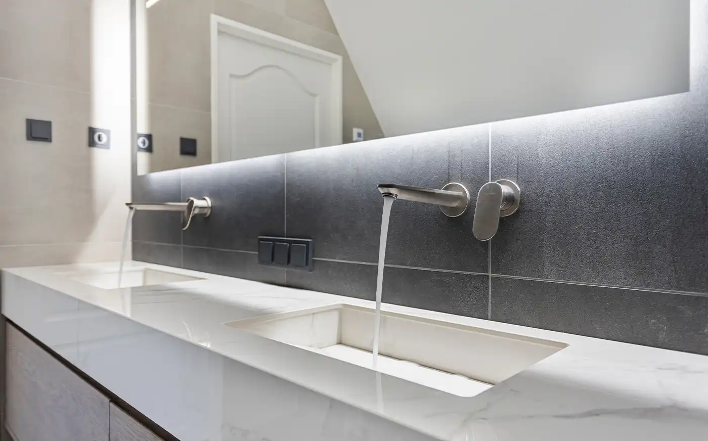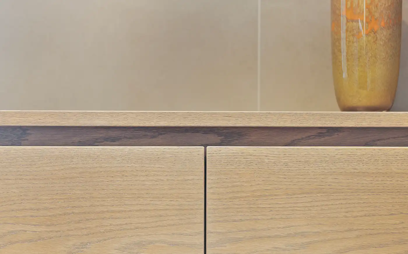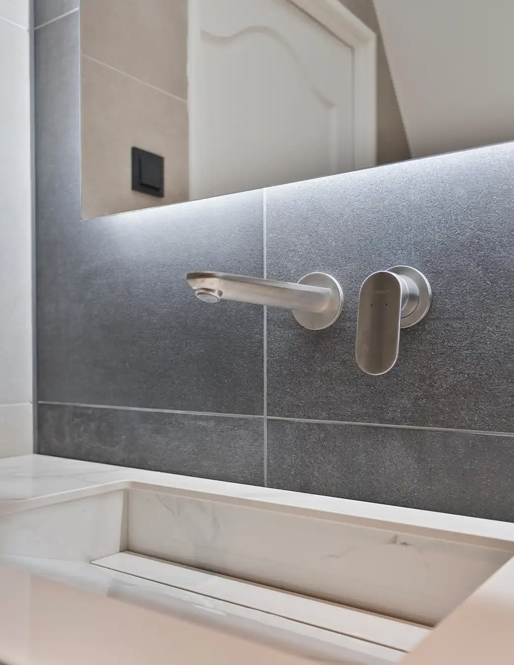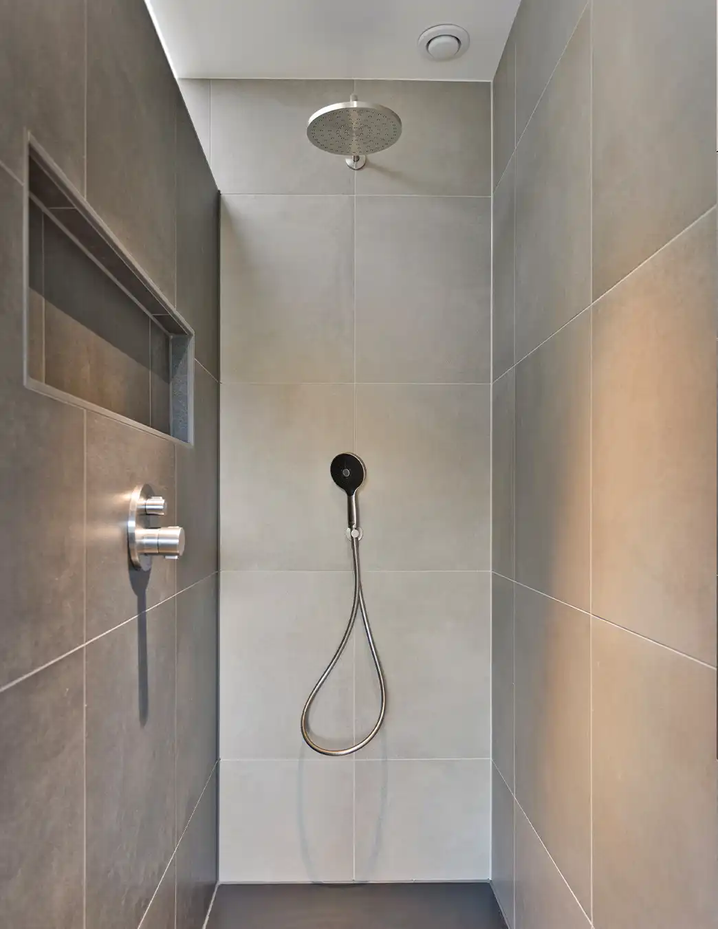 Deze moderne badkamer straalt rust en balans uit door de combinatie van zachte zand- en taupetinten met donkere accenten. Het lange houten maatwerkmeubel en het brede wastafelblad zorgen voor een strak en harmonieus geheel, terwijl de schuine lijnen van de ruimte het ontwerp karakter geven. De inloopdouche met natuursteenlook tegels en minimalistische kranen onderstreept het ingetogen karakter en maakt de badkamer comfortabel en tijdloos.