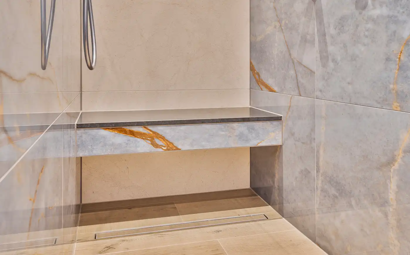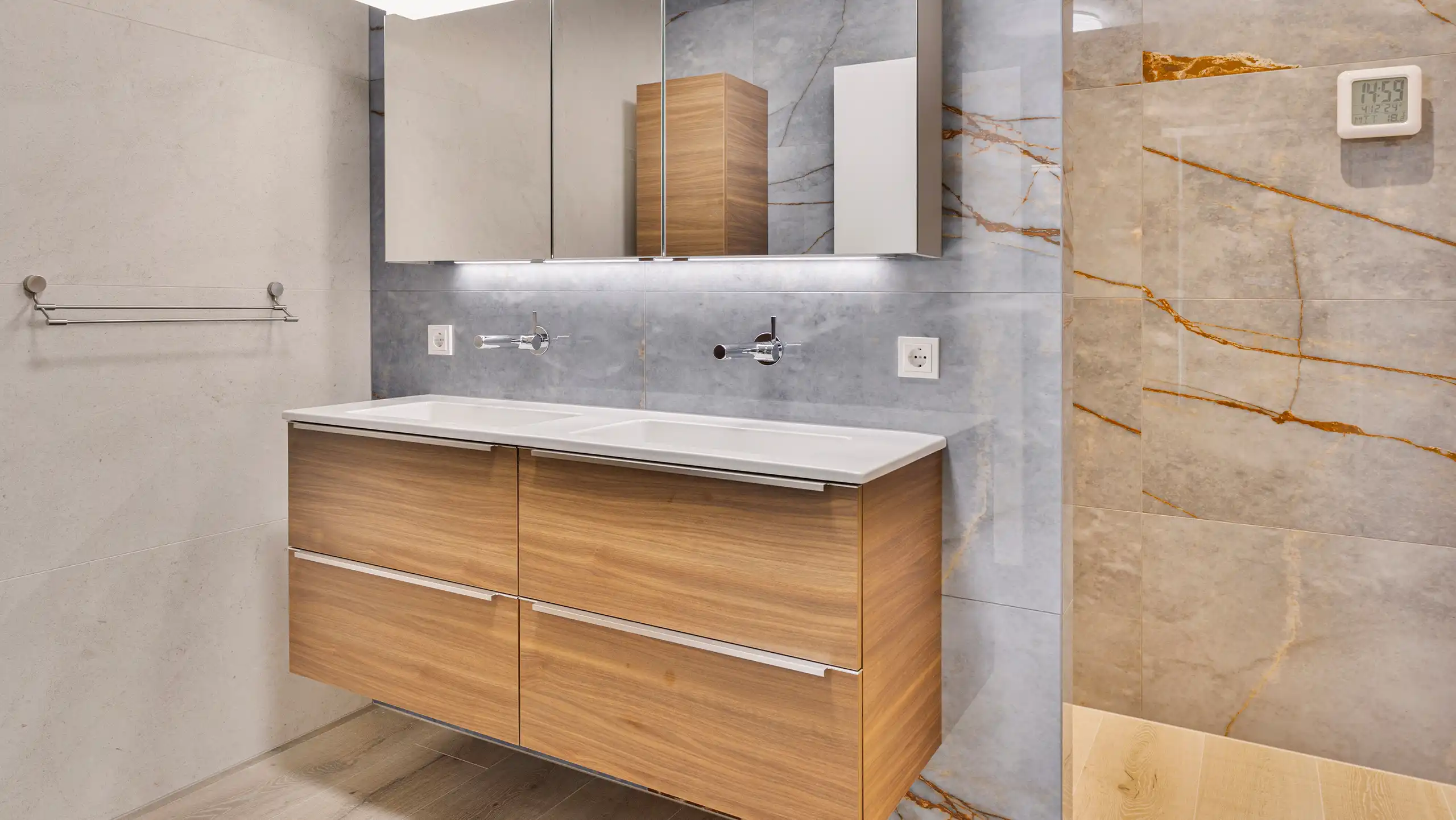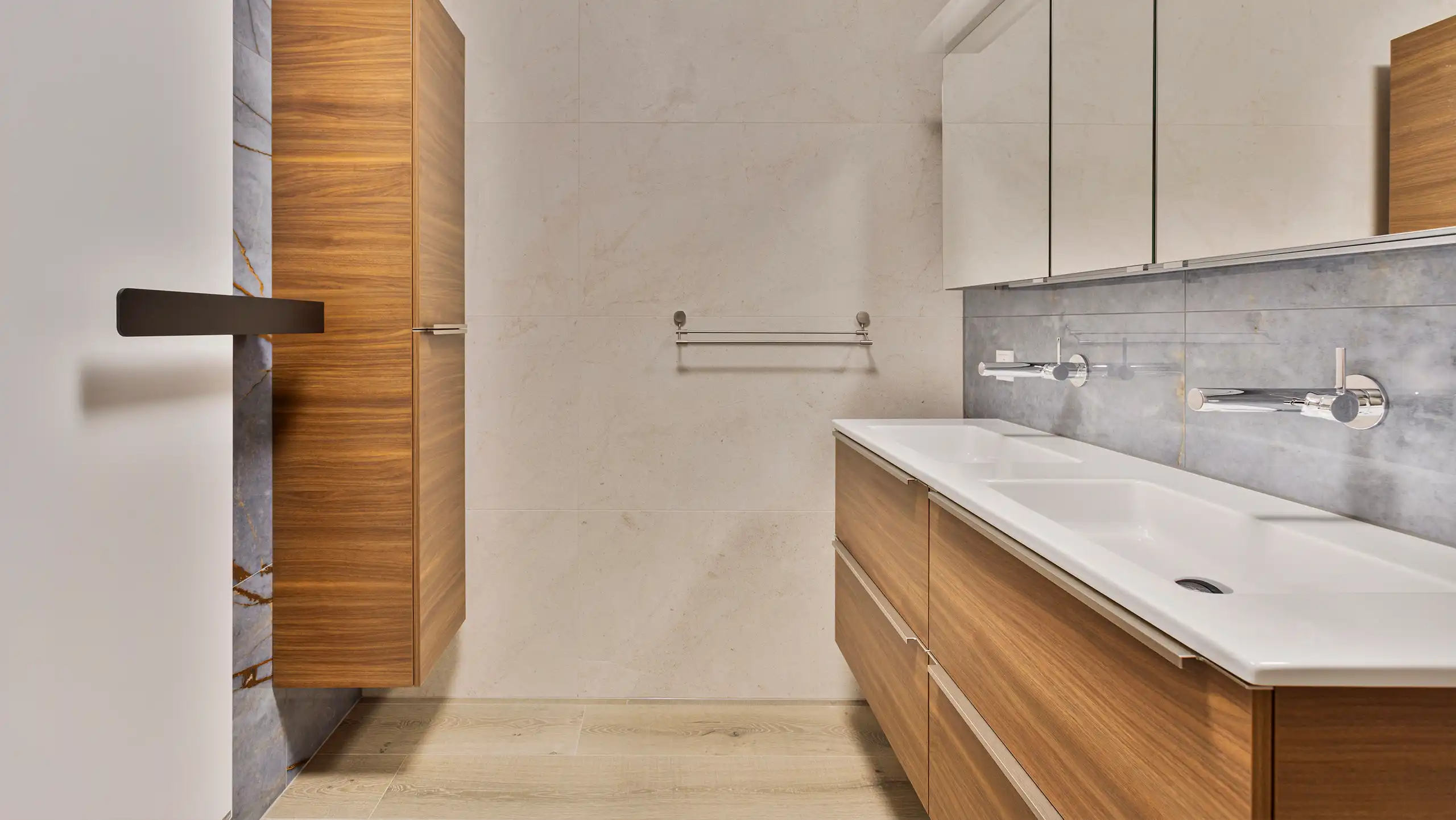 Deze stijlvolle badkamer kenmerkt zich door een rustige basis van beige en grijs in combinatie warme houten accenten. Het houten wastafelmeubel met geïntegreerde dubbele wastafel zorgt voor sfeer en balans, terwijl de lichte wanden en strakke lijnen het geheel een tijdloze uitstraling geven. In de ruime inloopdouche creëren de natuursteenlook tegels, comfortabele zitbank en ingetogen kranen een luxe sfeer waarin comfort en rust centraal staan.
