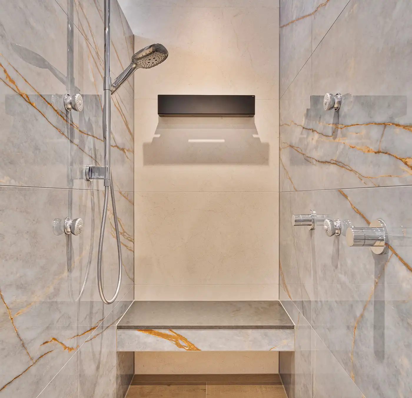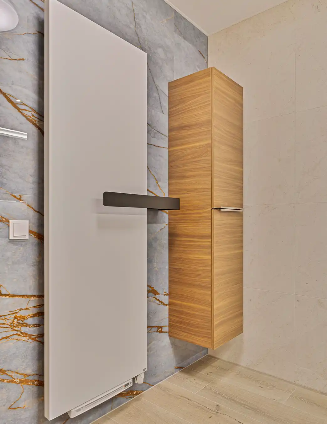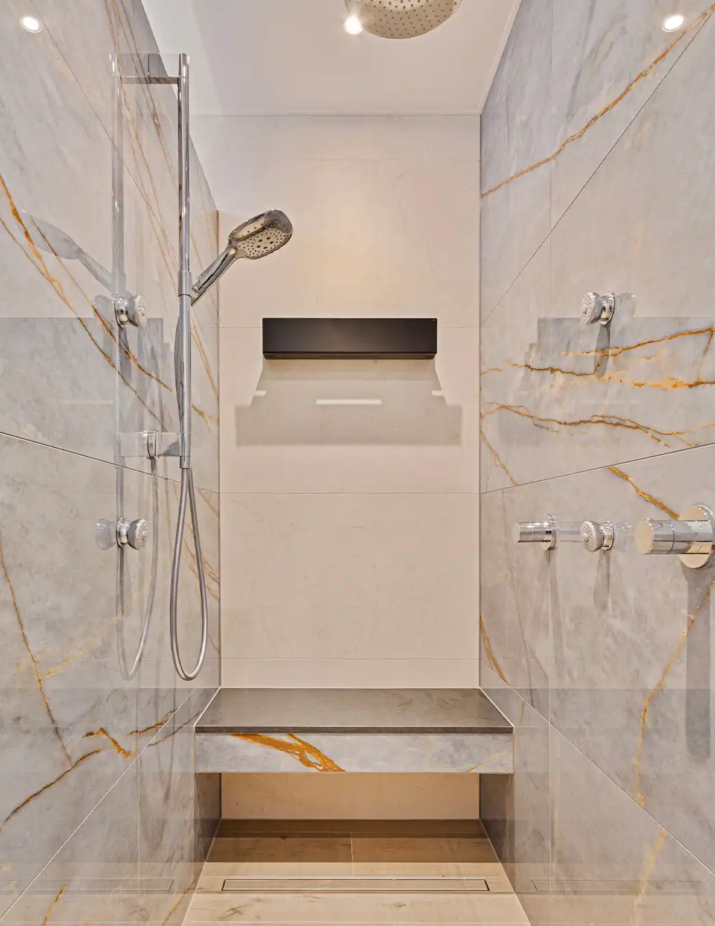 Deze stijlvolle badkamer kenmerkt zich door een rustige basis van beige en grijs in combinatie warme houten accenten. Het houten wastafelmeubel met geïntegreerde dubbele wastafel zorgt voor sfeer en balans, terwijl de lichte wanden en strakke lijnen het geheel een tijdloze uitstraling geven. In de ruime inloopdouche creëren de natuursteenlook tegels, comfortabele zitbank en ingetogen kranen een luxe sfeer waarin comfort en rust centraal staan.