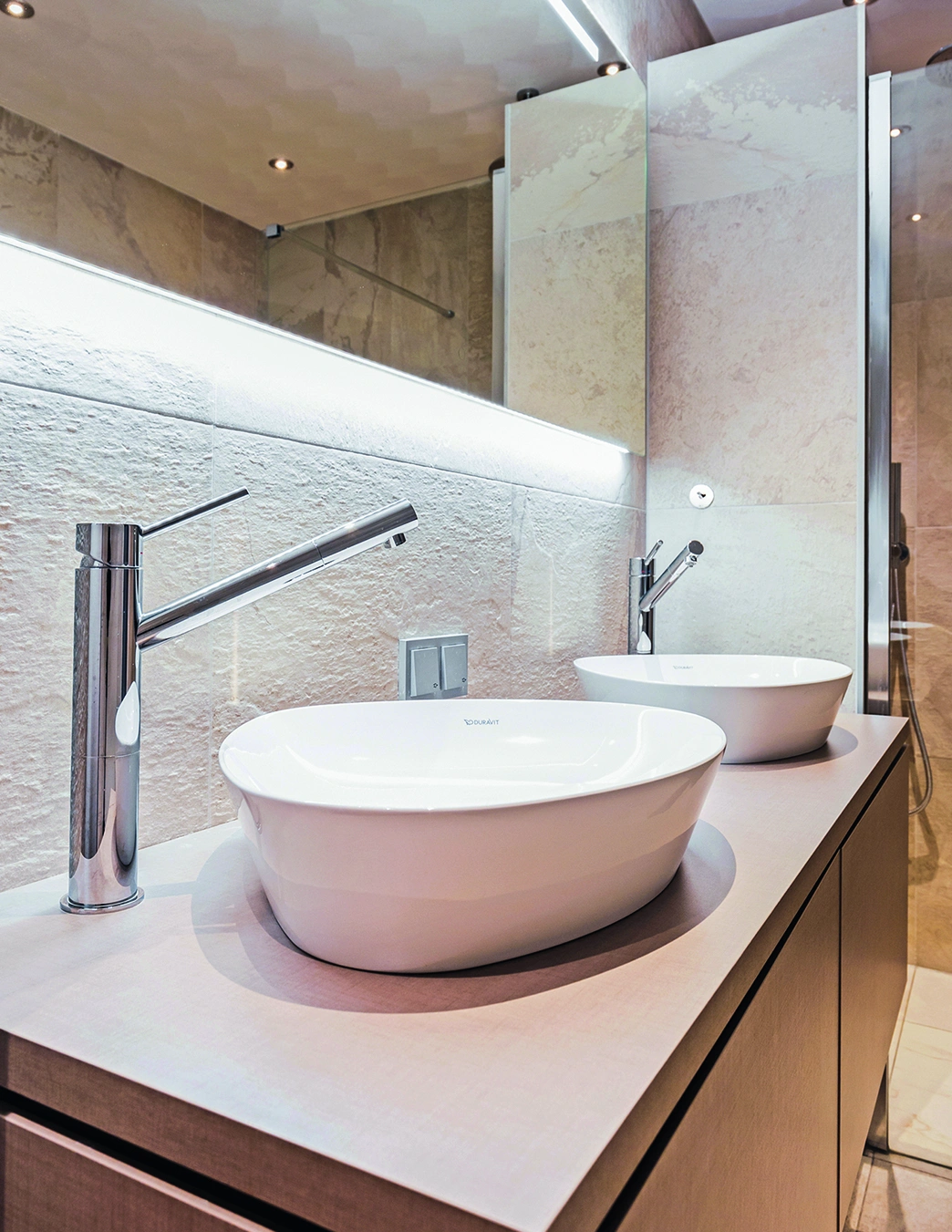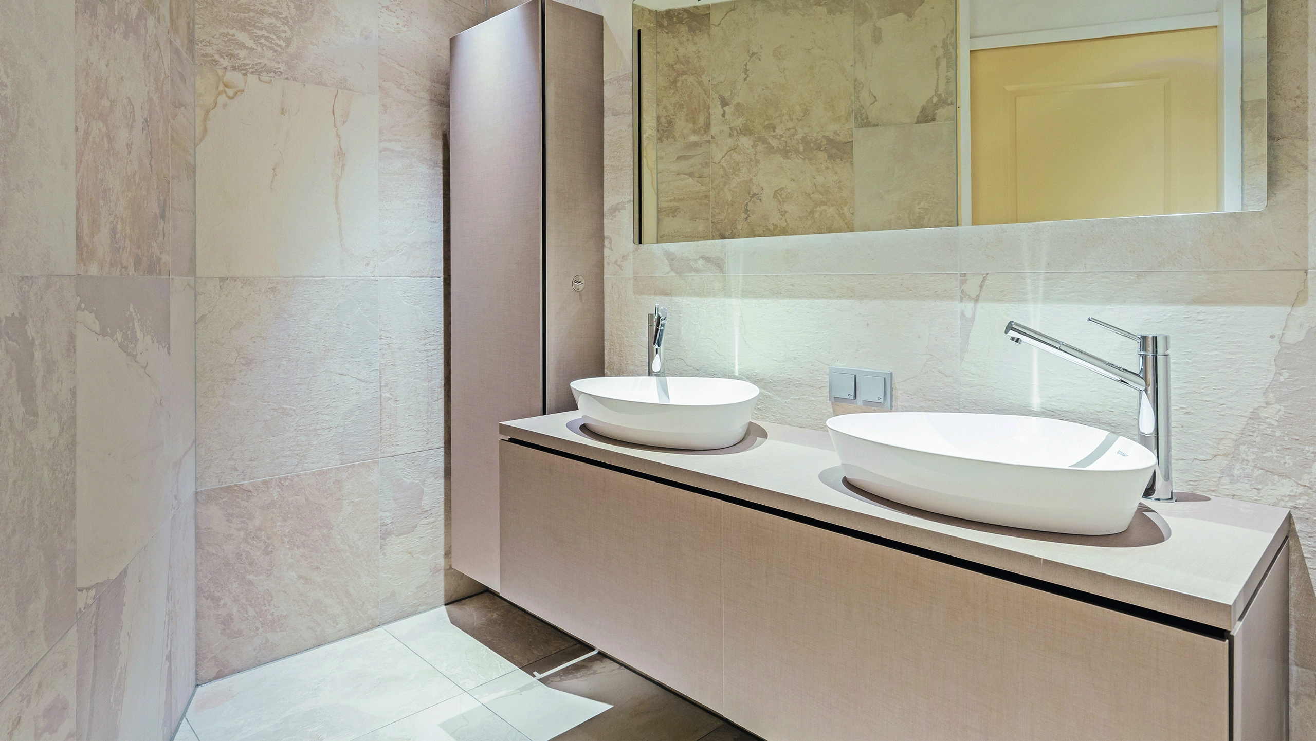 Deze stijlvolle badkamer straalt rust en luxe uit. Zachte natuurtinten, strakke lijnen en elegante waskommen vormen samen een tijdloos ontwerp. Hoogwaardige materialen en slimme indeling zorgen voor dagelijks comfort, functionaliteit en een serene hotelbeleving thuis voor het hele gezin comfortabel.