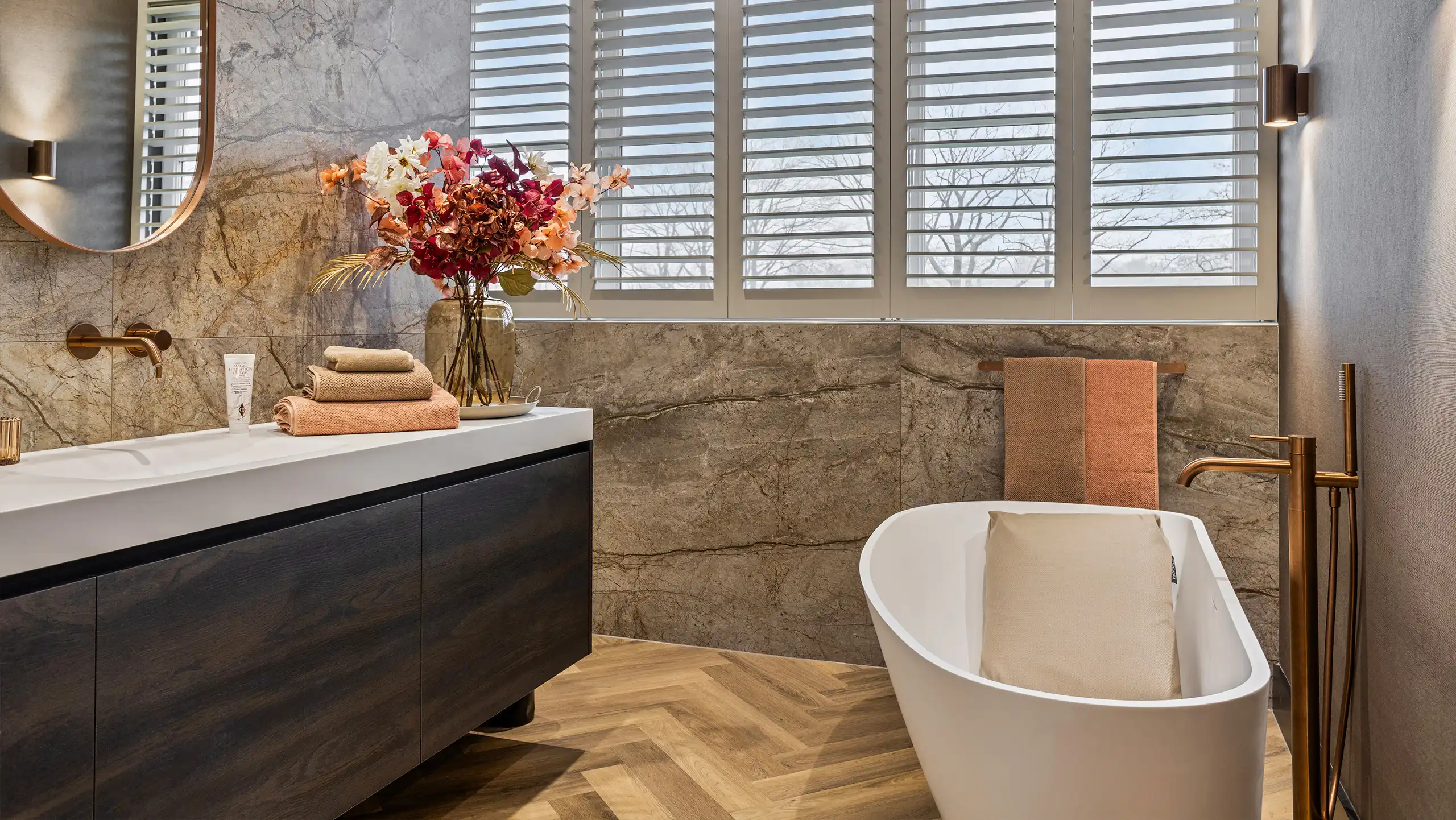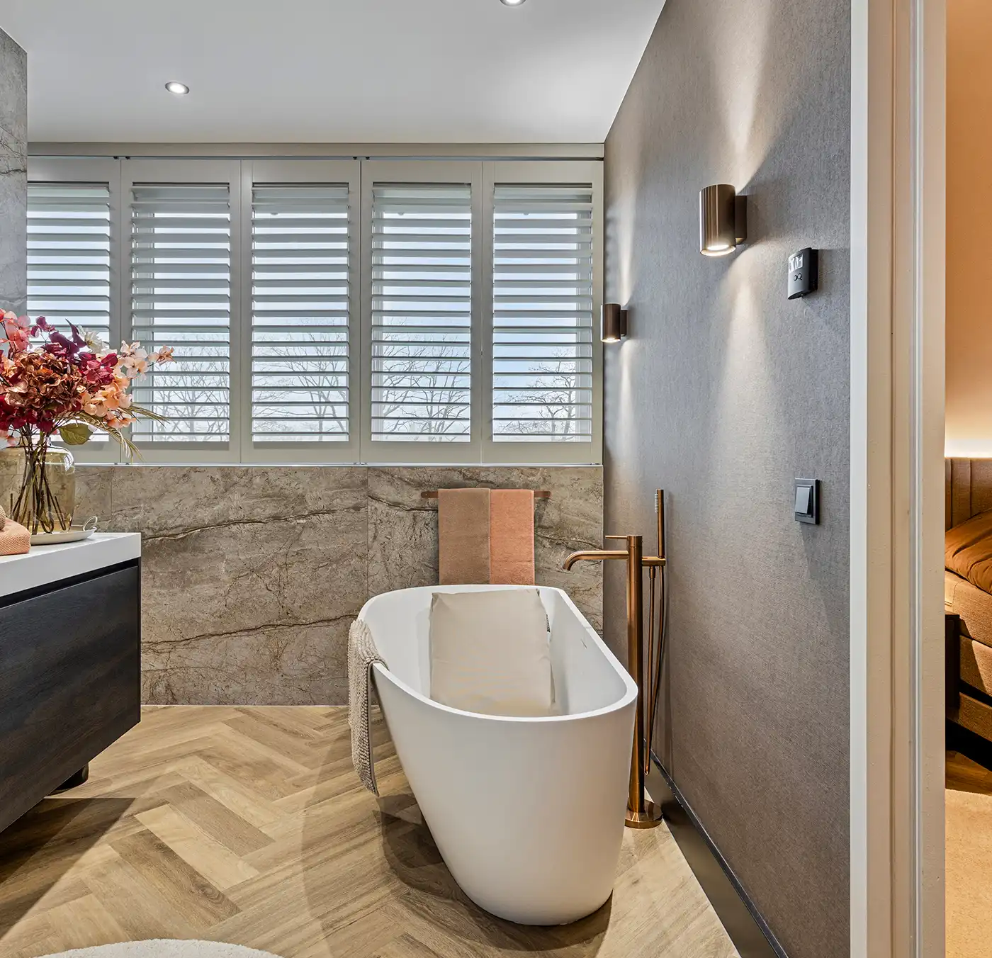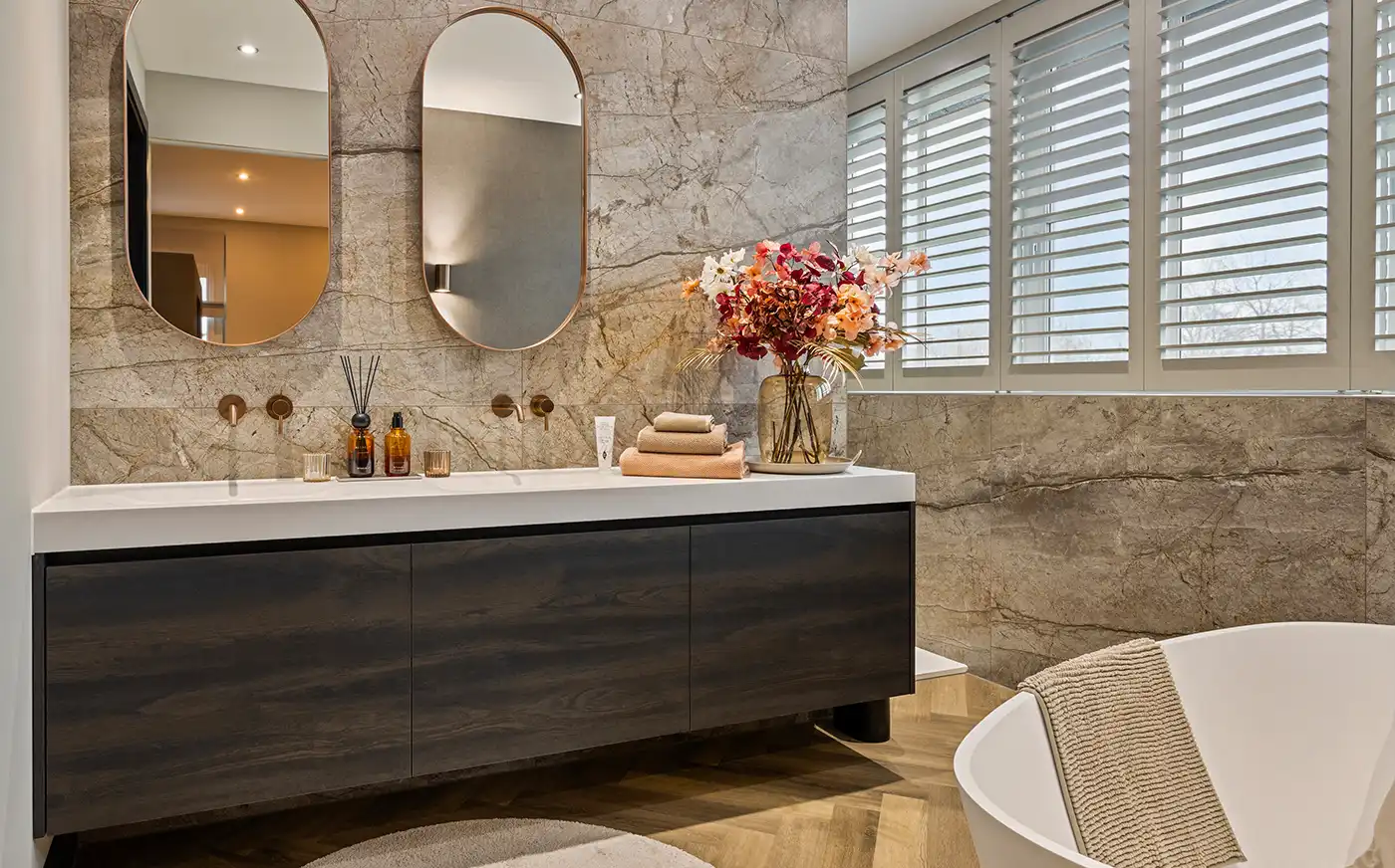Deze stijlvolle badkamer straalt rust en luxe uit door het gebruik van warme natuurtinten en hoogwaardige materialen. De wand- en vloertegels met een verfijnde steenstructuur vormen een elegant geheel met de visgraatvloer in houtlook, waardoor de ruimte een hotelachtige sfeer krijgt. Het vrijstaande ligbad vormt een uitnodigende blikvanger, terwijl de bronzen kranen en accessoires zorgen voor een subtiel accent met karakter.