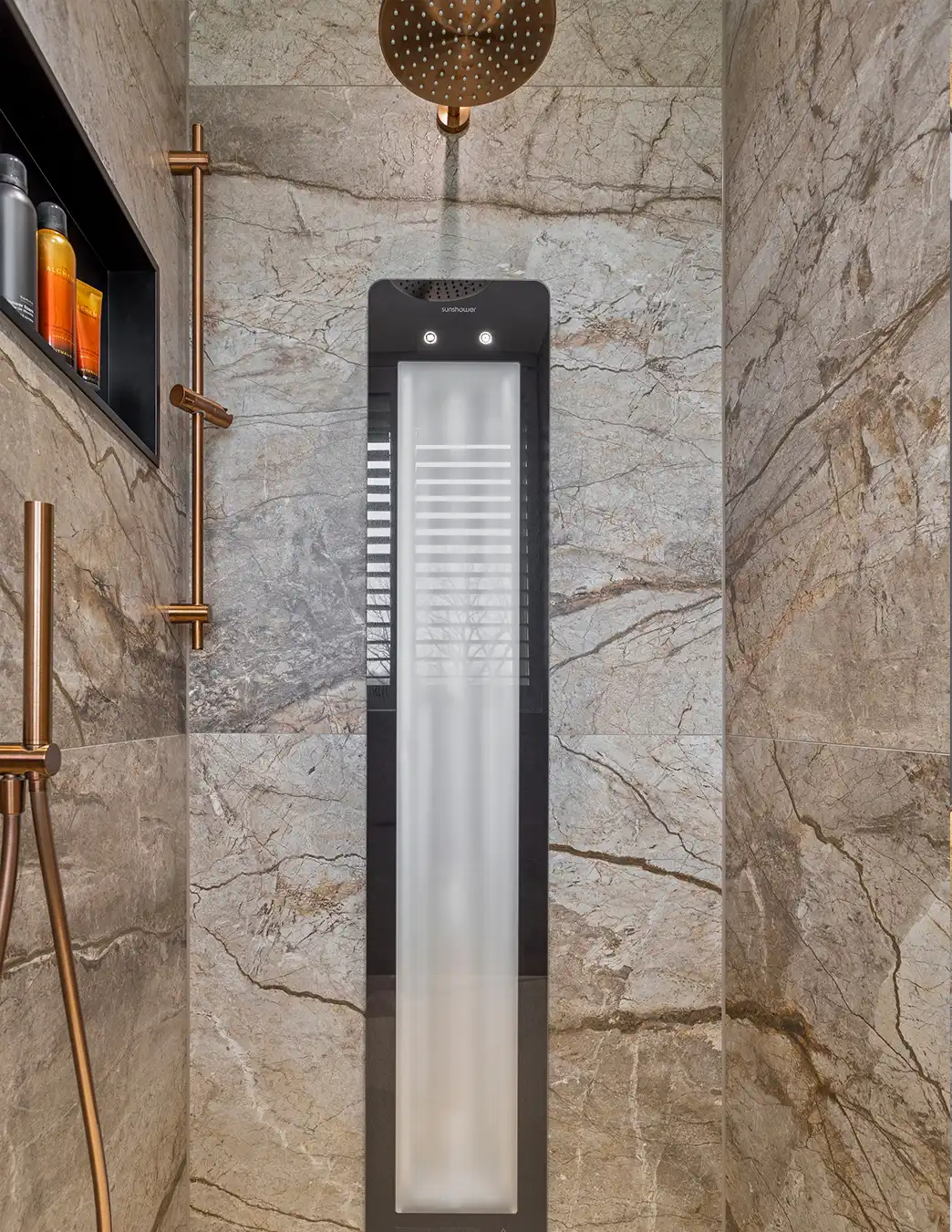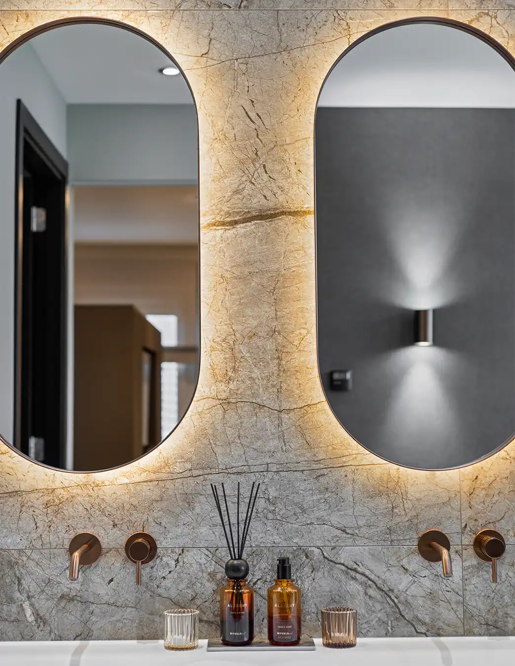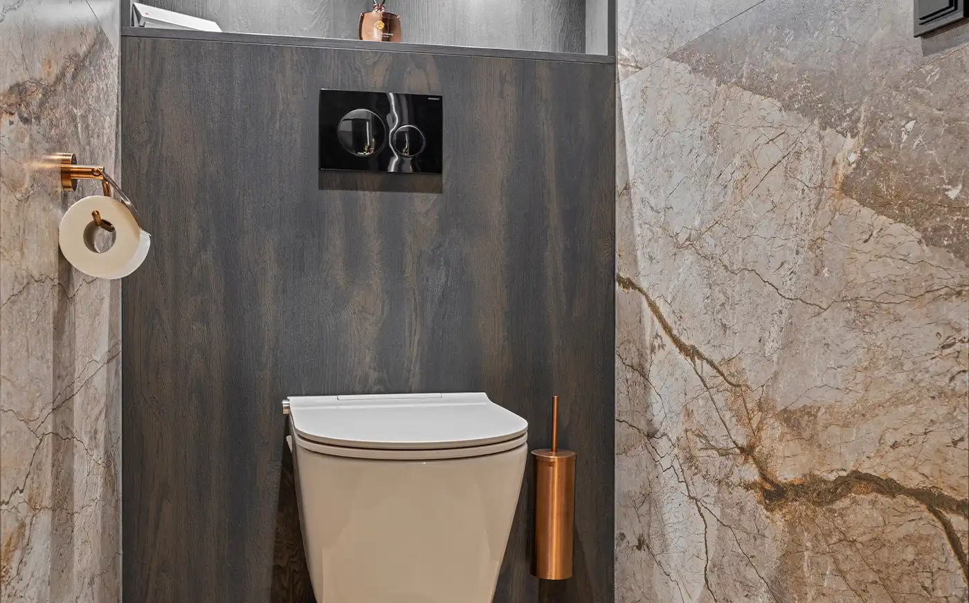 Deze stijlvolle badkamer straalt rust en luxe uit door het gebruik van warme natuurtinten en hoogwaardige materialen. De wand- en vloertegels met een verfijnde steenstructuur vormen een elegant geheel met de visgraatvloer in houtlook, waardoor de ruimte een hotelachtige sfeer krijgt. Het vrijstaande ligbad vormt een uitnodigende blikvanger, terwijl de bronzen kranen en accessoires zorgen voor een subtiel accent met karakter.