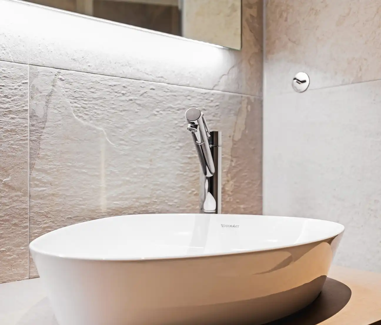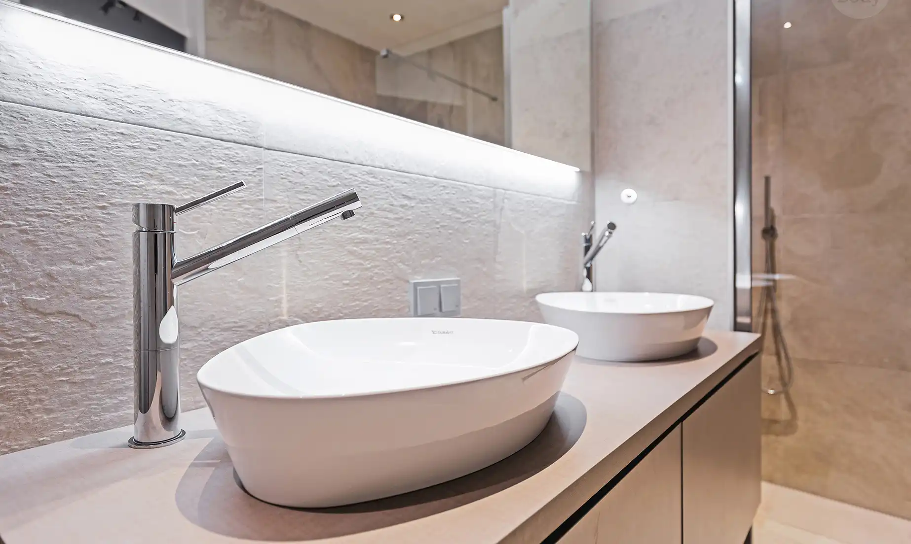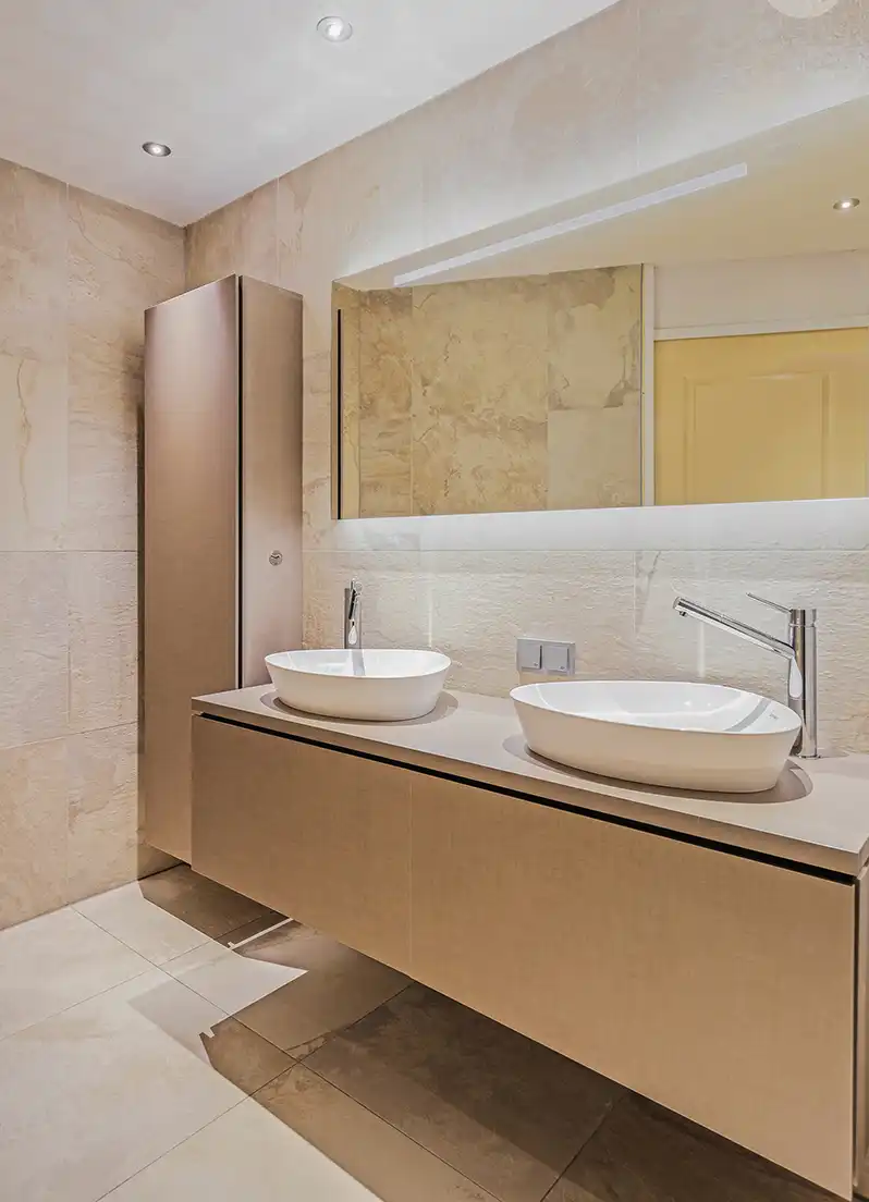 Ze kozen voor grote, lichte tegels met een natuurlijke steenlook die de badkamer een serene uitstraling geven. In de douche zorgen de strakke glaswand en de ingebouwde nissen voor een opgeruimd beeld. “Die nissen zijn zo’n detail waar je elke dag plezier van hebt,” zegt Marieke. “Geen rekjes of losse flessen in het zicht—alles heeft z’n plek.”