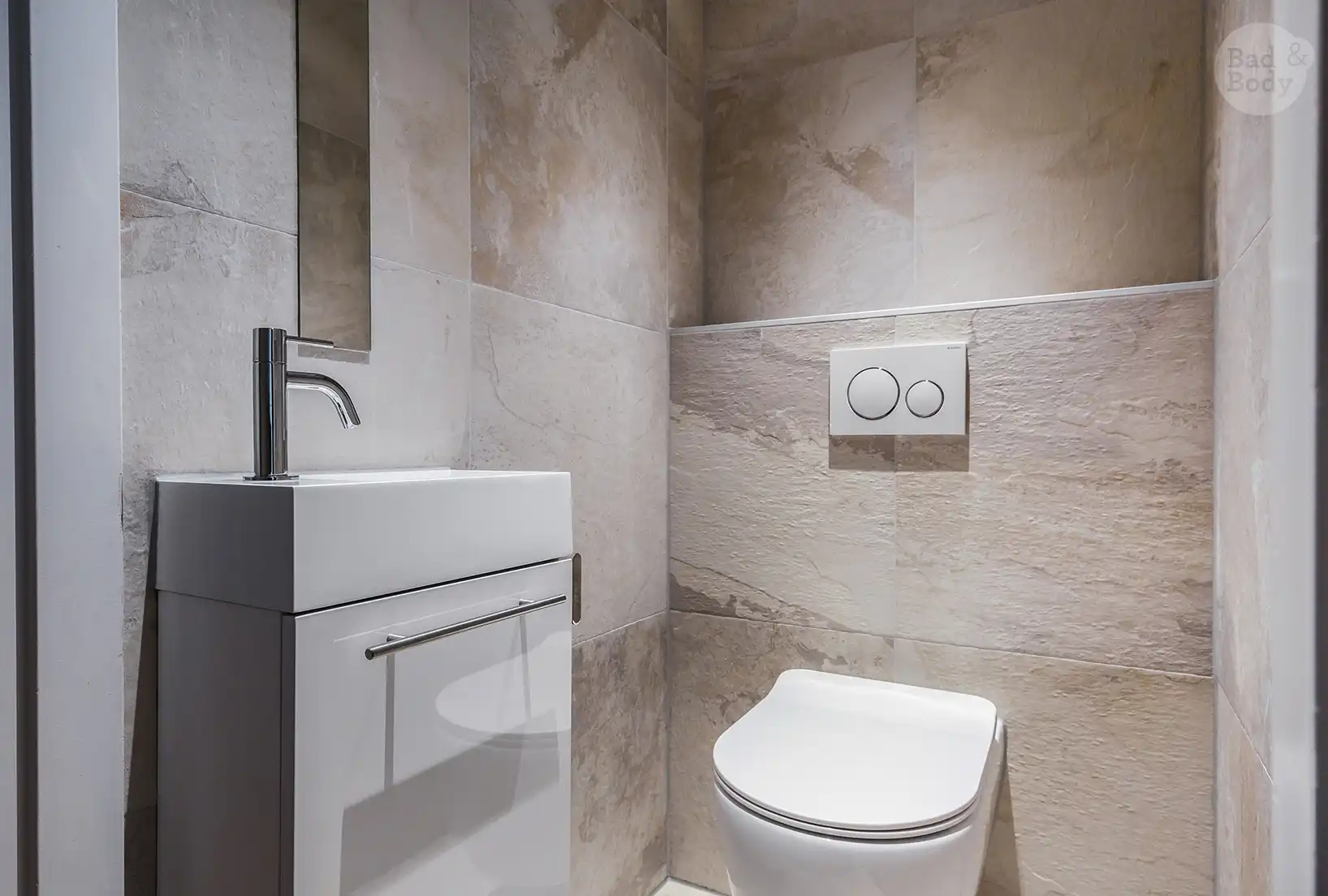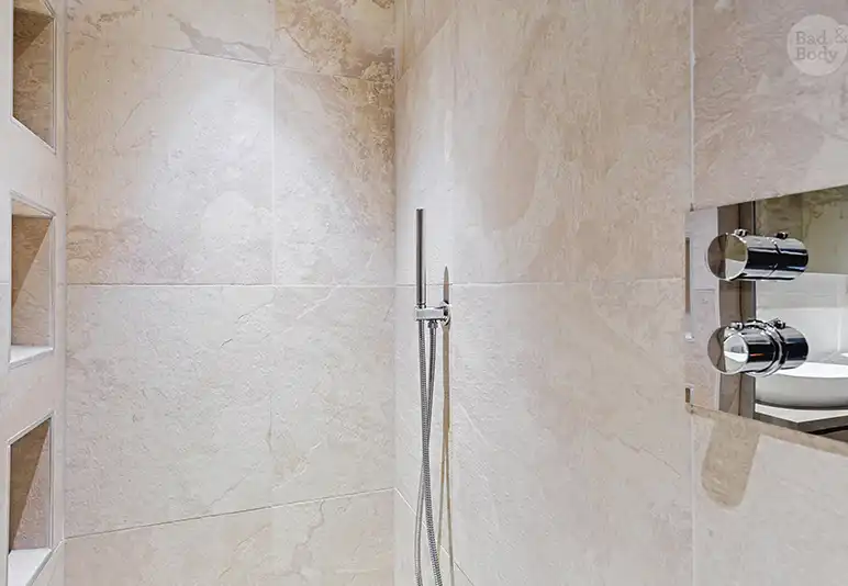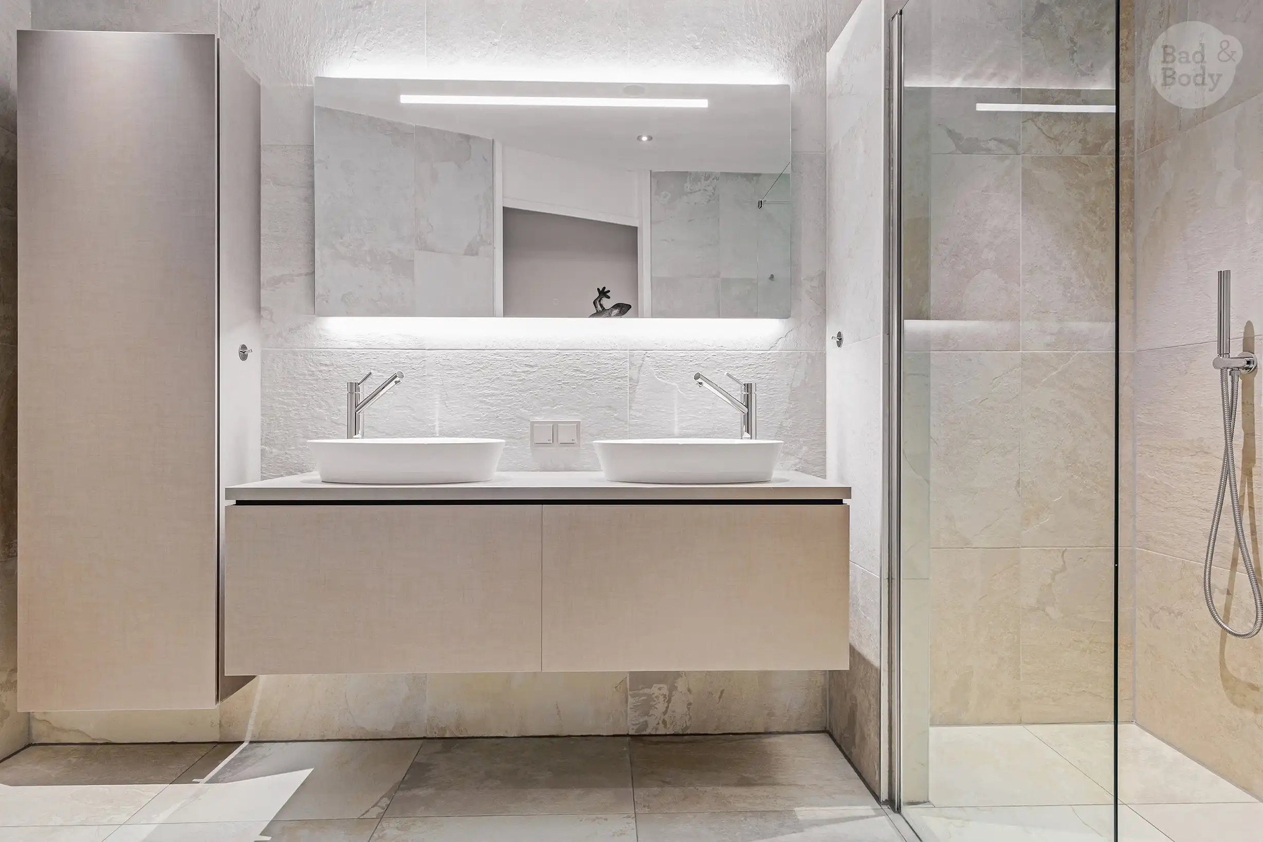 In de showroom werd hun wensenlijst meteen vertaald naar een ontwerp dat logisch aanvoelde. “Bad & Body dacht echt mee in hoe je de ruimte dagelijks gebruikt,” zegt Daan. “Waar heb je loopruimte nodig, wat is handig met schoonmaken, en hoe zorg je dat alles er strak uit blijft zien?”