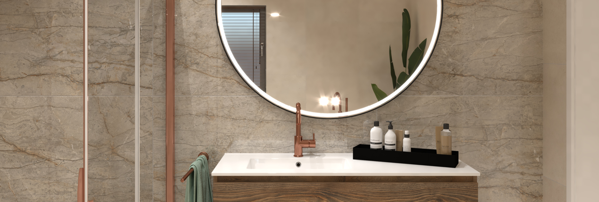 Van marmerlook tegels tot het asymmetrische wastafelblad, elk detail ademt kwaliteit.