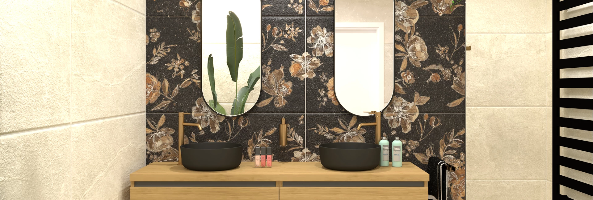 Welkom in de weelde van onze badkamer Wild Flower. Laat je betoveren door de ruime inloop-douche, compleet met een bouwkundig zitje en slimme inbouwnissen in dezelfde kleur als de kranen. De douchedeur houdt water en kou buiten, terwijl een subtiele licht-strip achter het inbouw-reservoir voor een verfrissend effect zorgt. De bloem-rijke tegels, afgewisseld met travertin-geïnspireerde lichte tegels, brengen de natuur naar binnen. Geniet van een warme hand-doek vanaf de strategisch geplaatste radiator na een verfrissende douche. Met een eiken-structuur badmeubel en zwarte ronde kommen, is deze badkamer een harmonieus bloemen-tapijt van stijl en comfort.