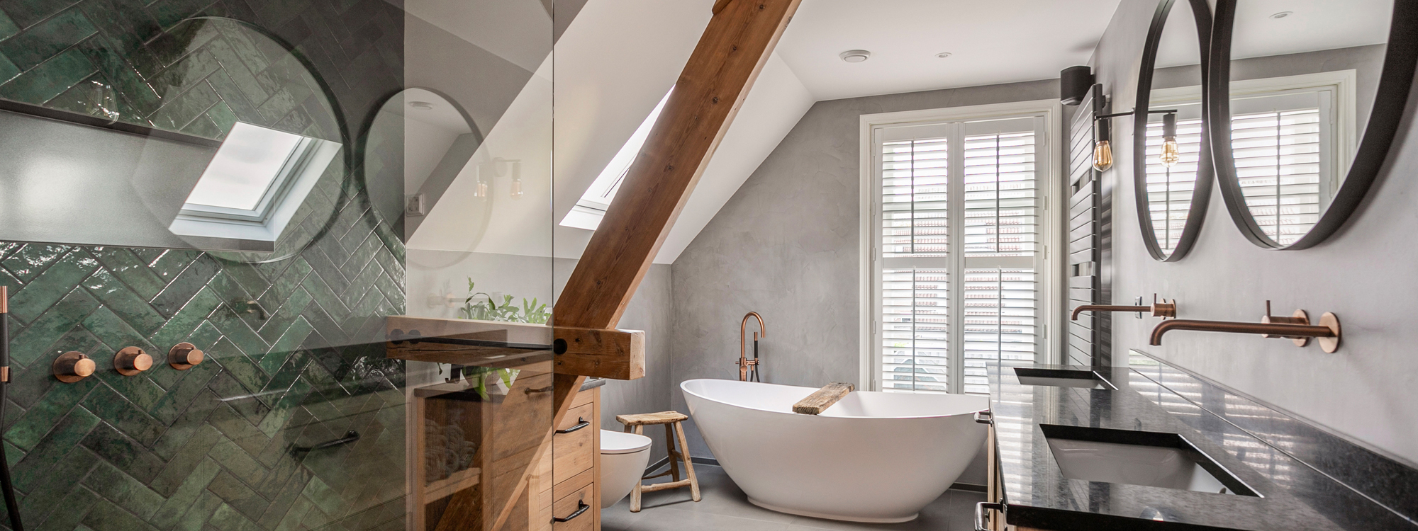 Ontdek deze prachtige badkamer met een landelijke uitstraling. De groene tegels voegen een extra dimensie toe, terwijl het vrijstaande bad en de koperkleurige kranen een vleugje luxe en warmte brengen. Ervaar sereniteit in stijl.