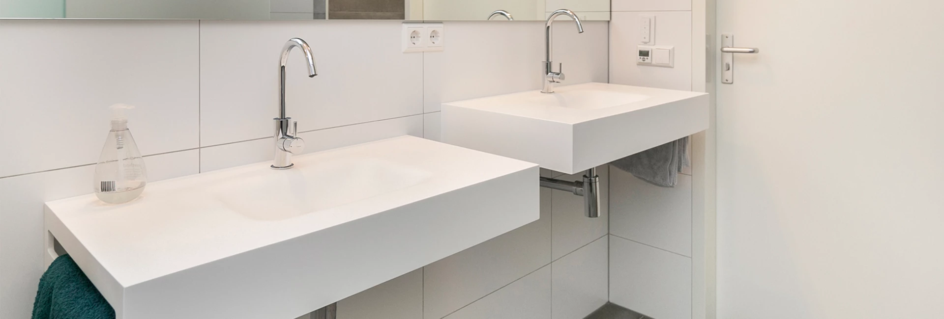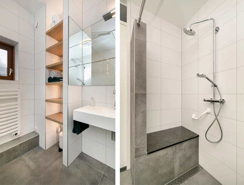 Deze moderne badkamer heeft een eigentijdse uitstraling door rustig kleurgebruik en is voorzien van alle comfort. De strakke lijnen zorgen voor een ruimtelijk effect waardoor de badkamer een stuk groter lijkt.
