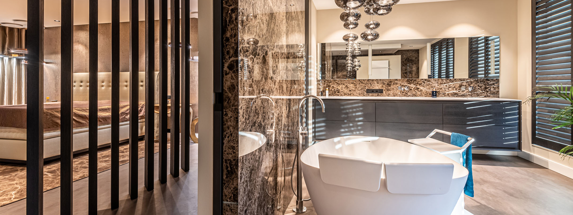 Deze badkamer is gemaakt van zeer luxe materialen. Deze badkamer is voorzien is van alle gemakken. De prachtige tegels, het vrijstaande bad en de doorloop naar het slaapgedeelte maken deze badkamer zeer bijzonder.