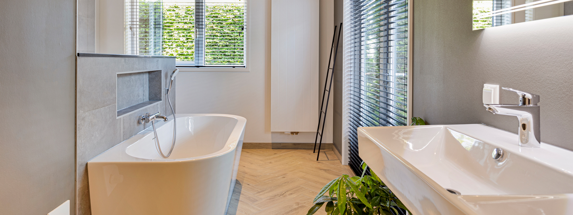 Een design badkamer straalt luxe uit met een half vrijstaand bad als pronkstuk. Het prachtige badmeubel biedt zowel opslag als stijl, en de visgraatvloer voegt een uniek en eigentijds element toe aan de ruimte.