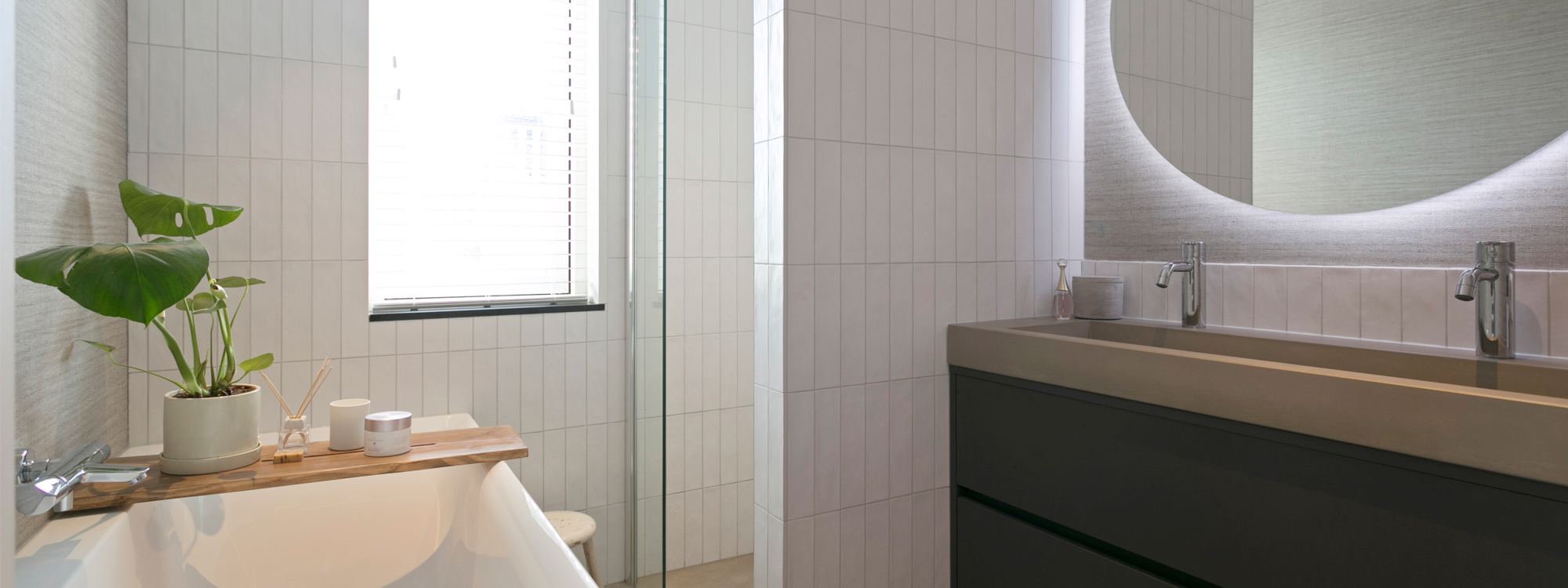 Dit badkamer ontwerp is geïnspireerd op de Scandinavische stijl: minimalistisch met sfeer en heeft een koele maar strakke uitstraling. Let ook op de bijzondere achterwand en de kleur van de tegels.
