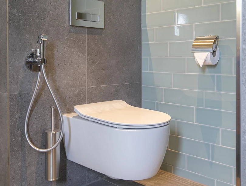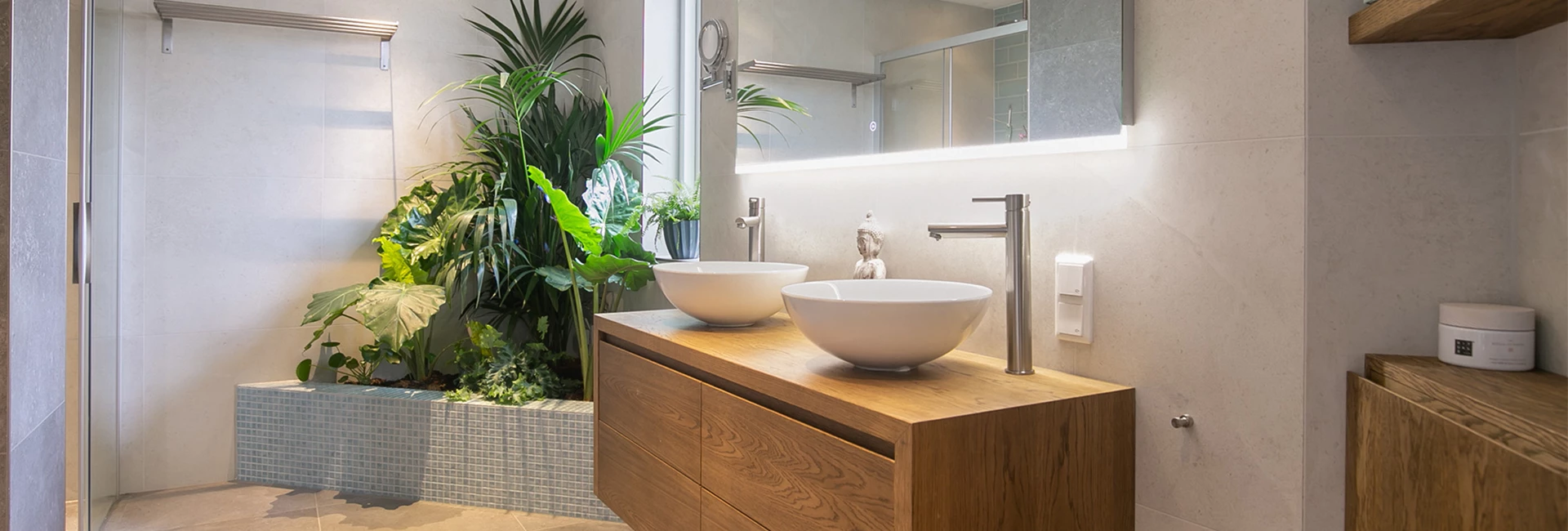 Voor dit badkamerontwerp zijn we op zoek gegaan naar een goede balans tussen modern en landelijk. De combinatie van de strakke grijze en groene tegels maken de badkamer erg trendy. Het gebruik van hout in het badkamermeubel en de planten zorgt voor de landelijke touch.
