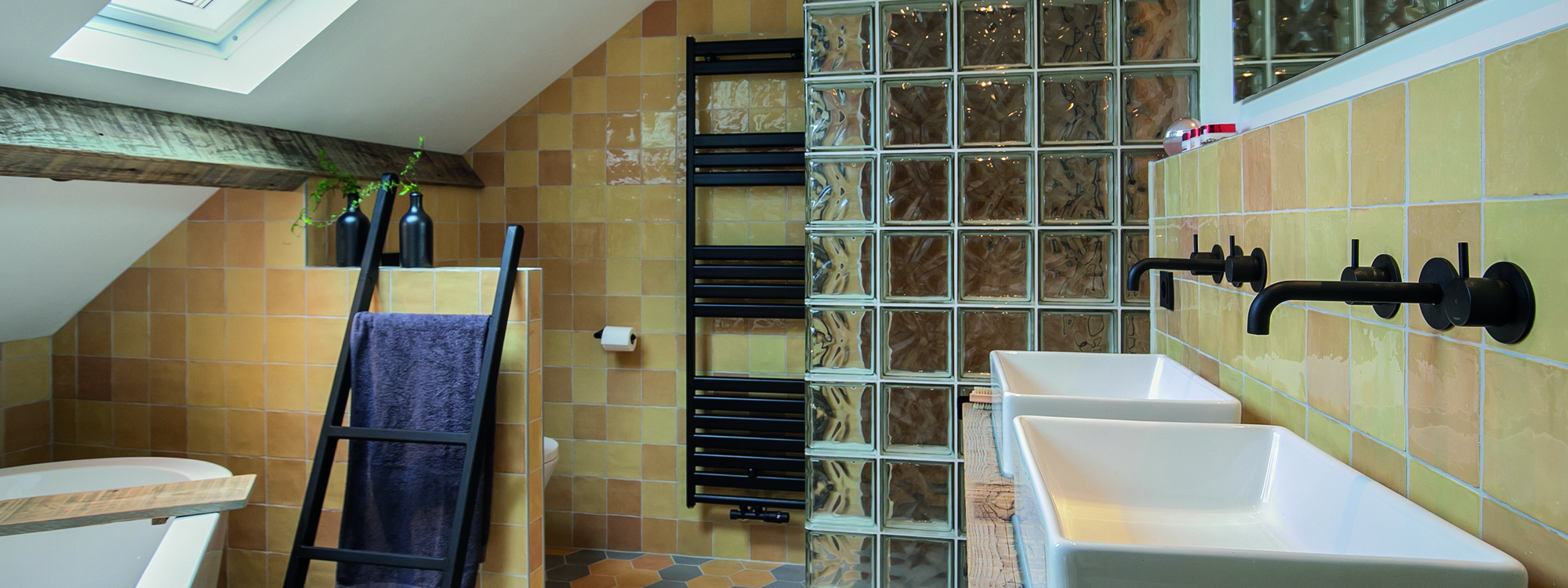 Voor dit badkamerontwerp zijn we op zoek gegaan naar een goede balans tussen modern en landelijk. De combinatie van de gele tegels en het houten meubel zorgt voor de landelijke touch.