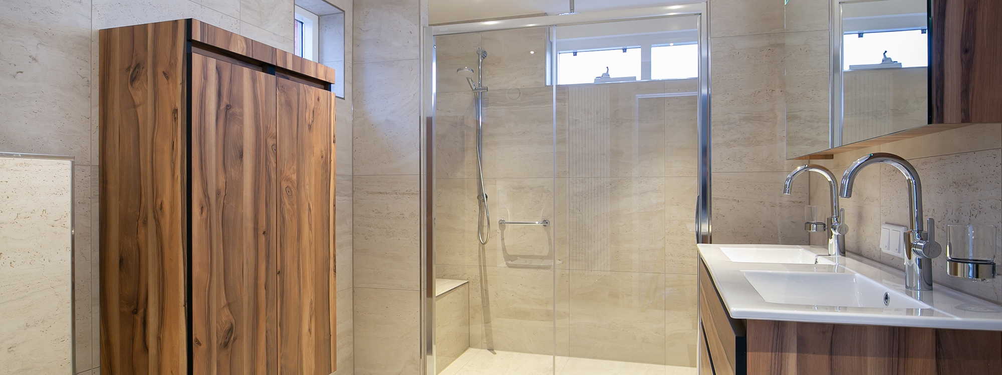 De badkamer is een ruimte waar we tot rust willen komen. Deze serene badkamer is volledig uitgevoerd in natuurlijke tinten. De ruime inloopdouche en het strakke badmeubel, krijgt de badkamer een heerlijk luxe uitstraling. Een ruimte om echt in te relaxen.