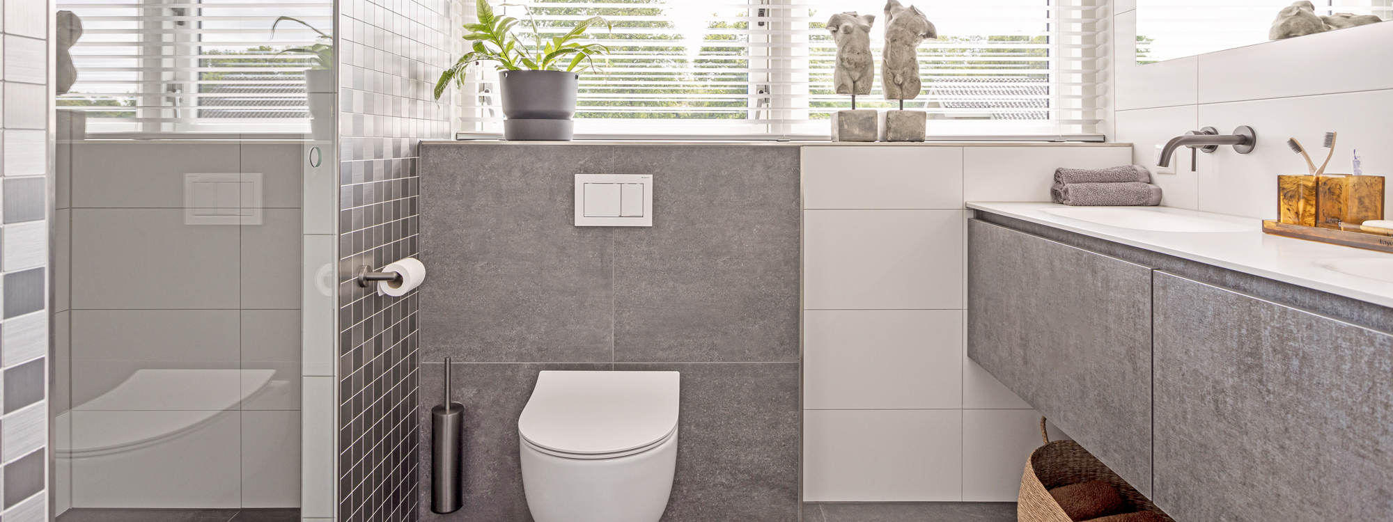Een moderne badkamer schittert met lichtgrijze tegels en een strak wandcloset. De steenkleurige badmeubel biedt opbergruimte en geeft de ruimte een natuurlijke uitstraling met een eigentijdse touch.