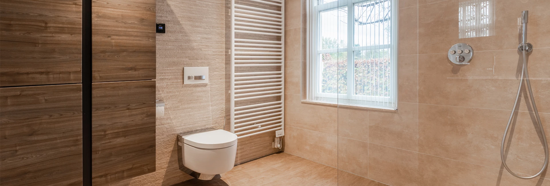 Deze badkamer is landelijk en puur dankzij de houtaccenten. De extra brede wastafel met dubbele kranen zorgt voor genoeg ruimte 's ochtends. Het sunshower zorgt voor een mooi bruin tintje tijden het douchen.