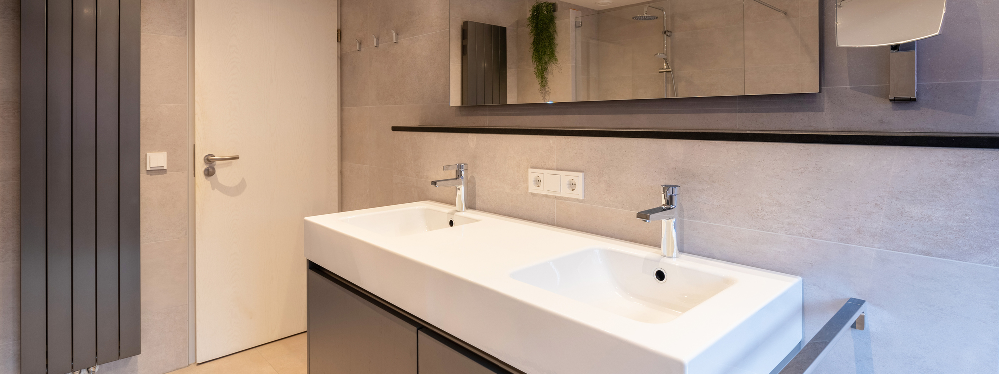 Hoe mooi is deze moderne badkamer? Mooie licht gekleurde tegels, een strak wandcloset én een prachtig badmeubel.