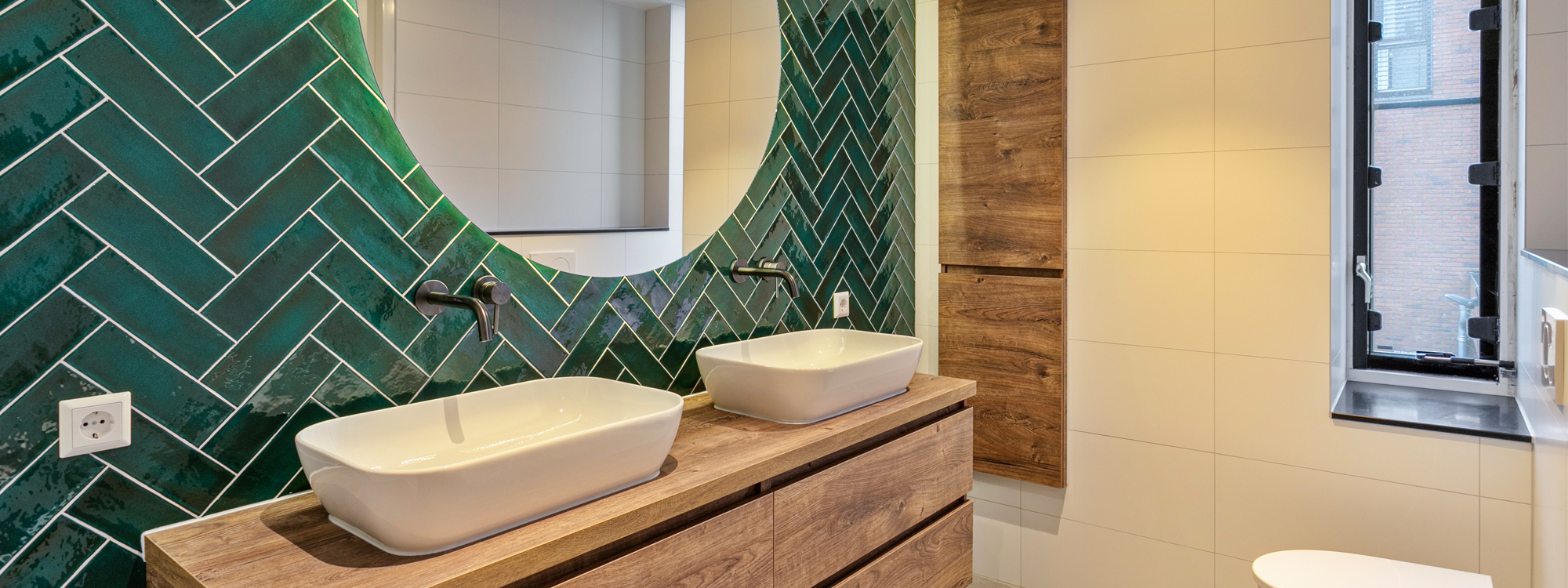 Ontdek deze ruime badkamer met een groene tegelwand in visgraatmotief. Een badmeubel met losse wasbakken en gunmetal kranen voegen een vleugje luxe toe. Ervaar elegantie en comfort in elke hoek.