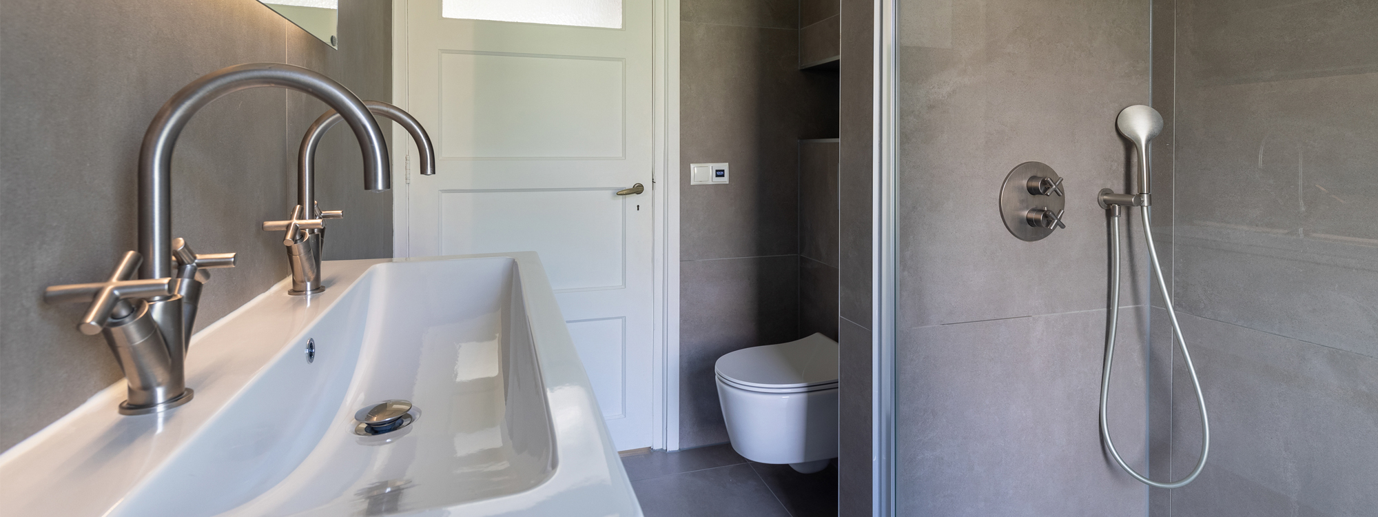 Vroeger was beton alleen besteed aan de garage, maar nu is het materiaal niet meer weg te denken uit een modern badkamerontwerp. Het geeft je badkamer een stoere sfeer en het combineert prachtig met zowel hoogglans materialen zoals het badmeubel maar ook met de matte RVS kranen.
